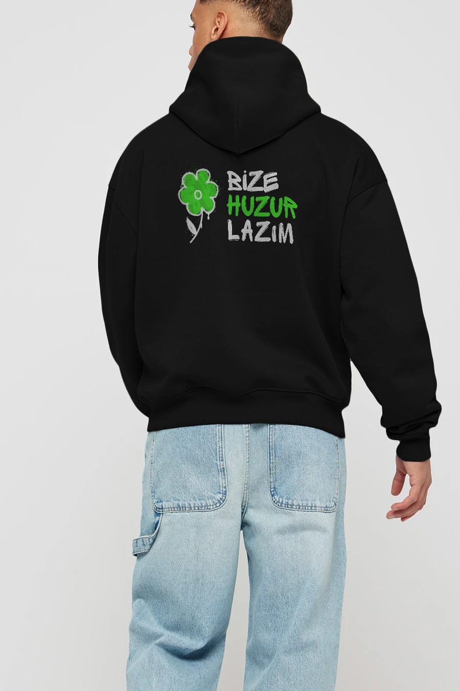 Bize Huzur Lazım Arka Baskılı Oversize Hoodie Kapüşonlu Sweatshirt Erkek Kadın Unisex