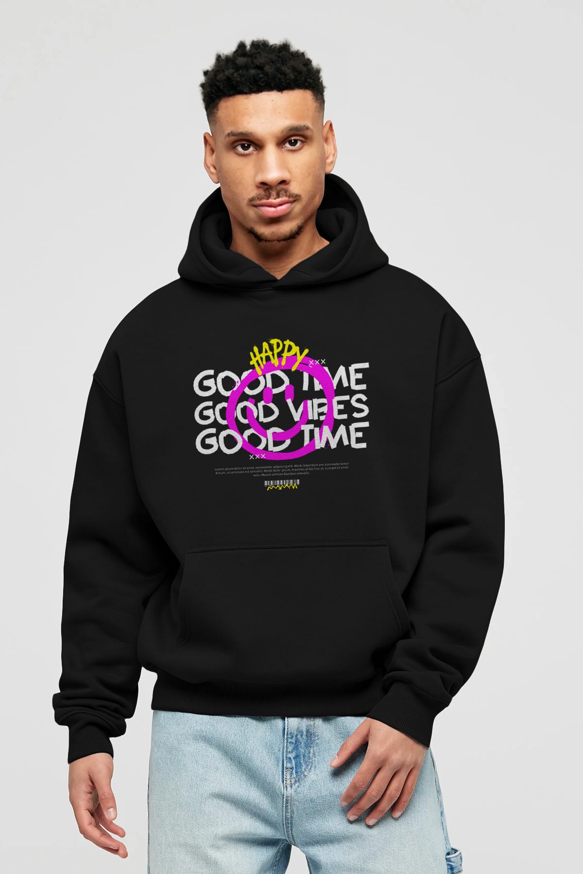 Happy Good Time Yazılı Ön Baskılı Oversize Hoodie Kapüşonlu Sweatshirt Erkek Kadın Unisex