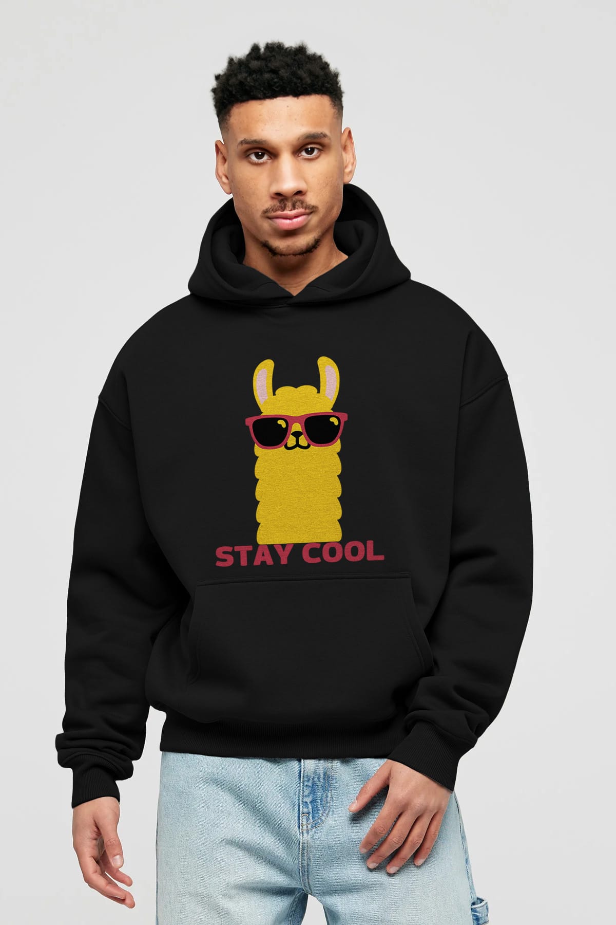 Stay Cool Yazılı Lama Ön Baskılı Oversize Hoodie Kapüşonlu Sweatshirt Erkek Kadın Unisex