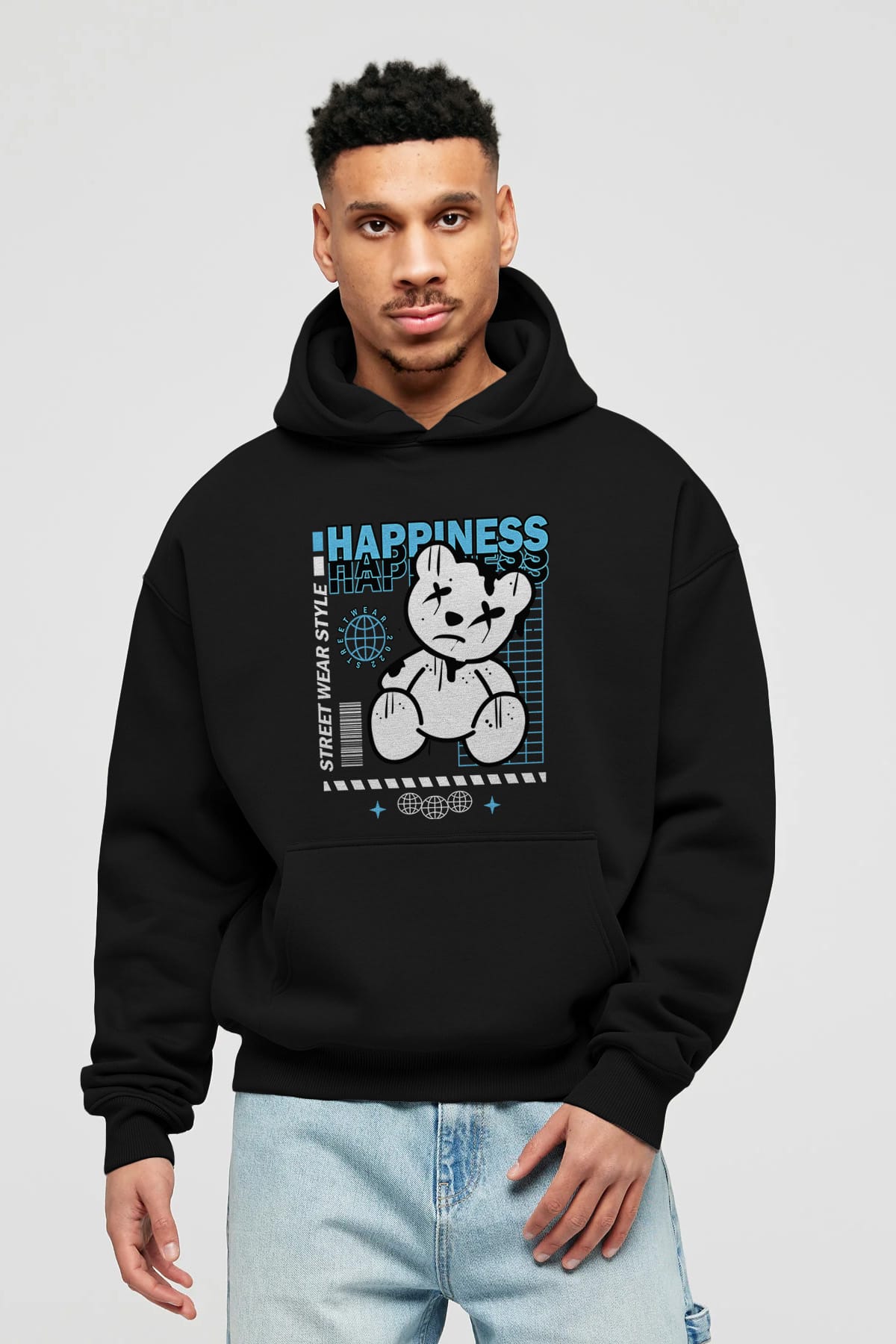 Happiness Bear 2 Ön Baskılı Hoodie Oversize Kapüşonlu Sweatshirt Erkek Kadın Unisex