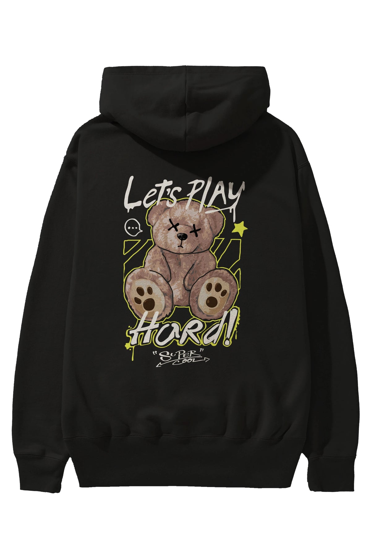 Lets Play Hard Bear Arka Baskılı Hoodie Oversize Kapüşonlu Sweatshirt Erkek Kadın Unisex