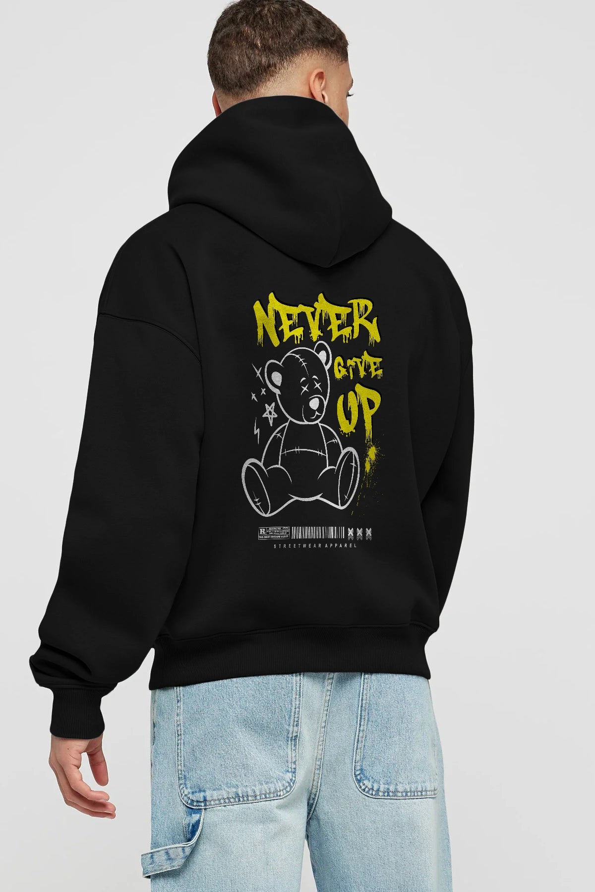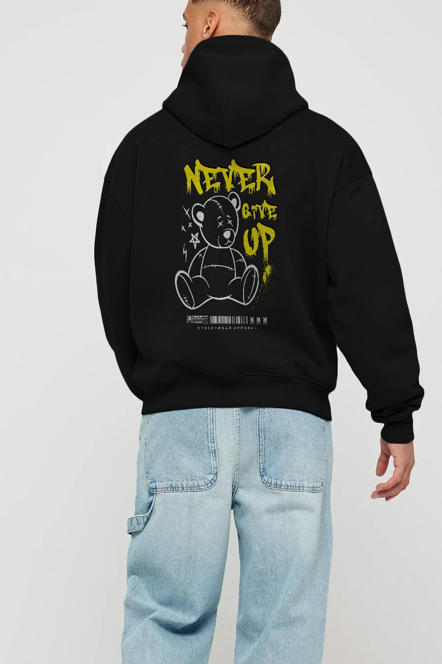 Teddy Bear Never Give Up Arka Baskılı Hoodie Oversize Kapüşonlu Sweatshirt Erkek Kadın Unisex