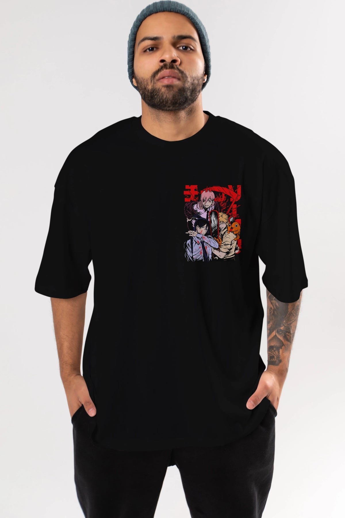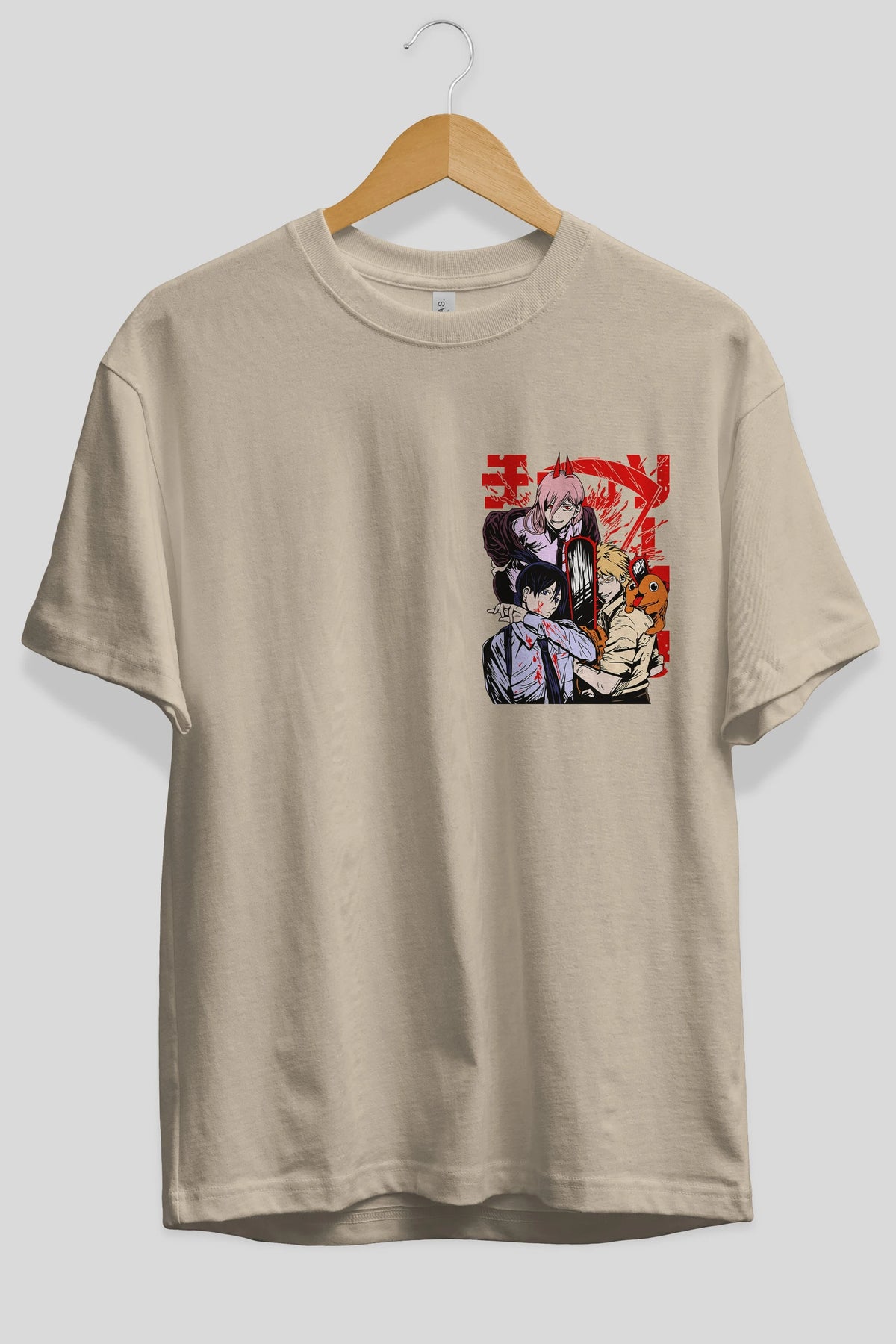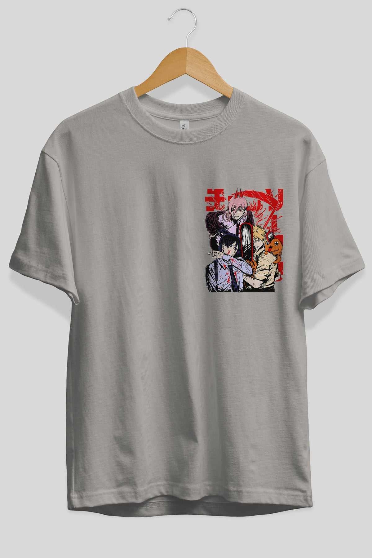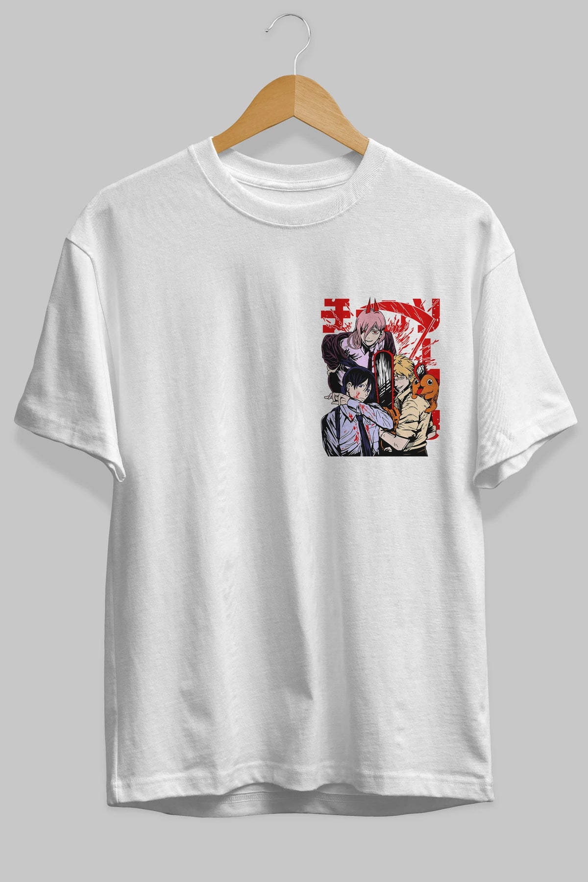 CHAINSAWMAN CREW Ön Sol Baskılı Oversize t-shirt Erkek Kadın Unisex %100 Pamuk Bisiklet Yaka tişort