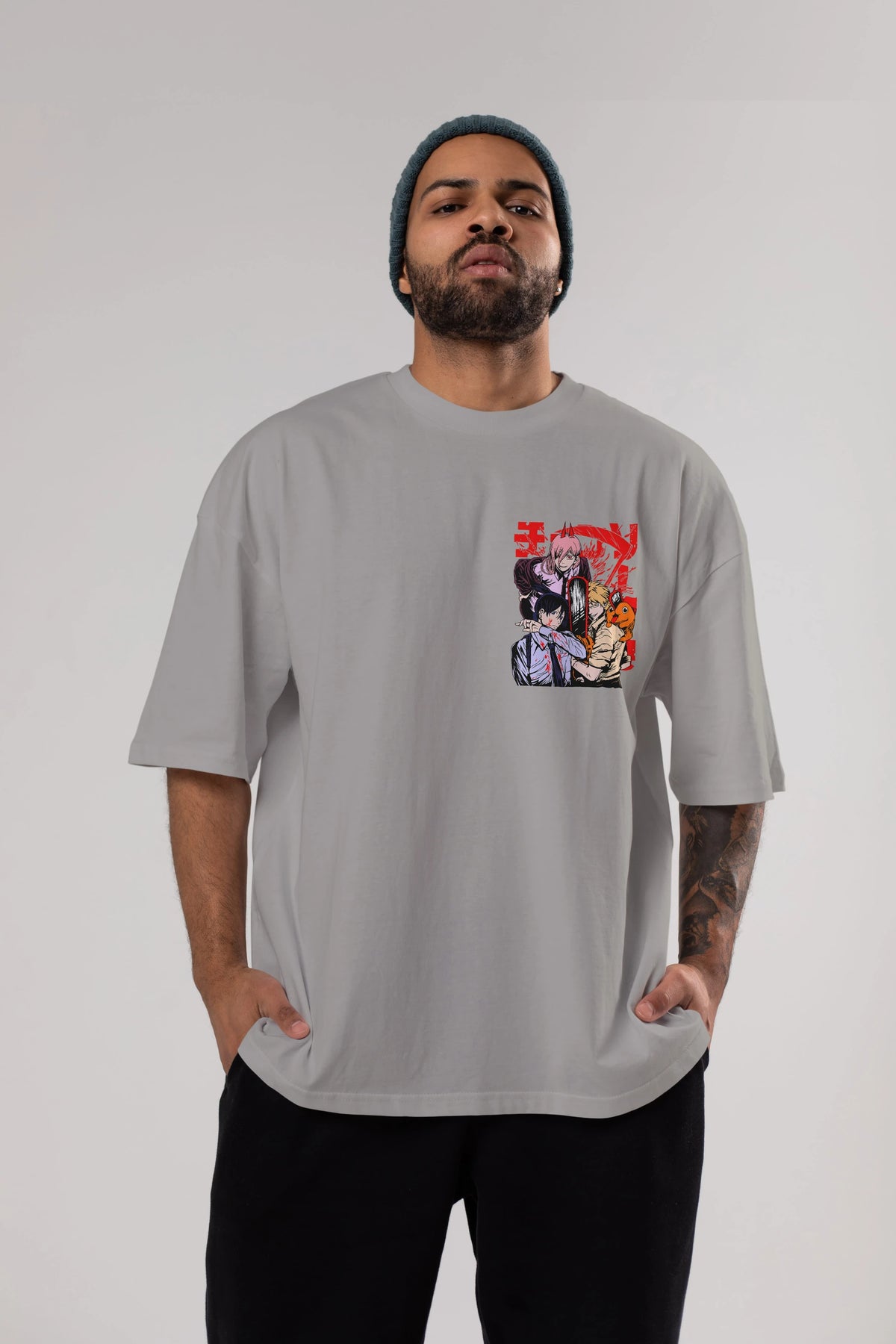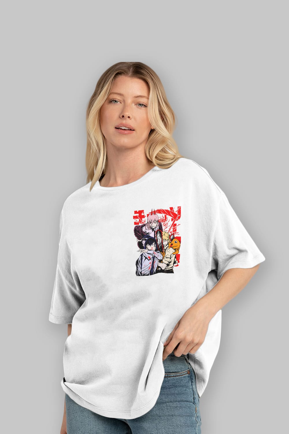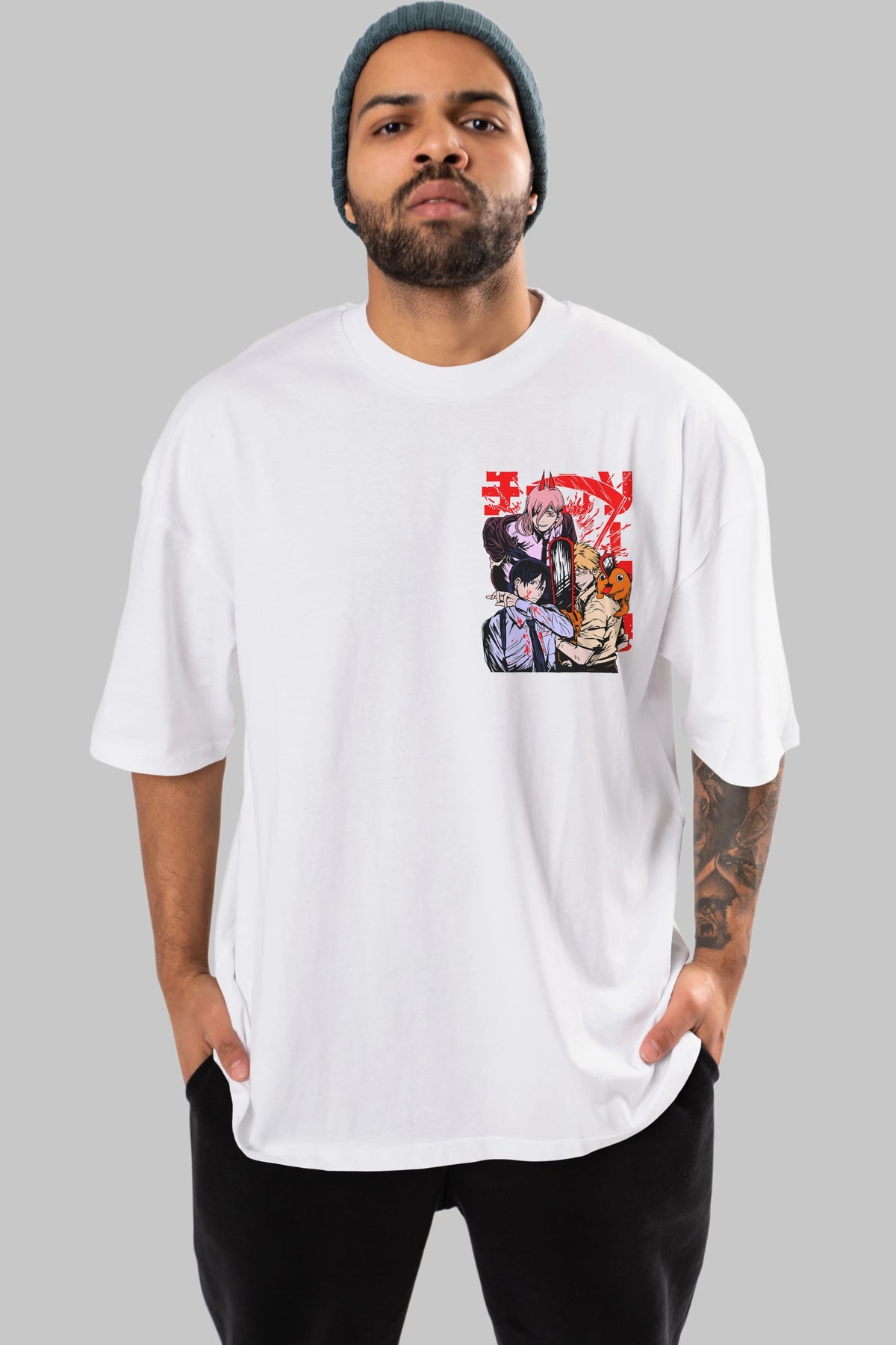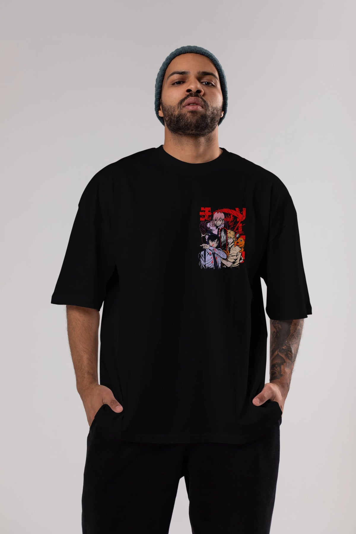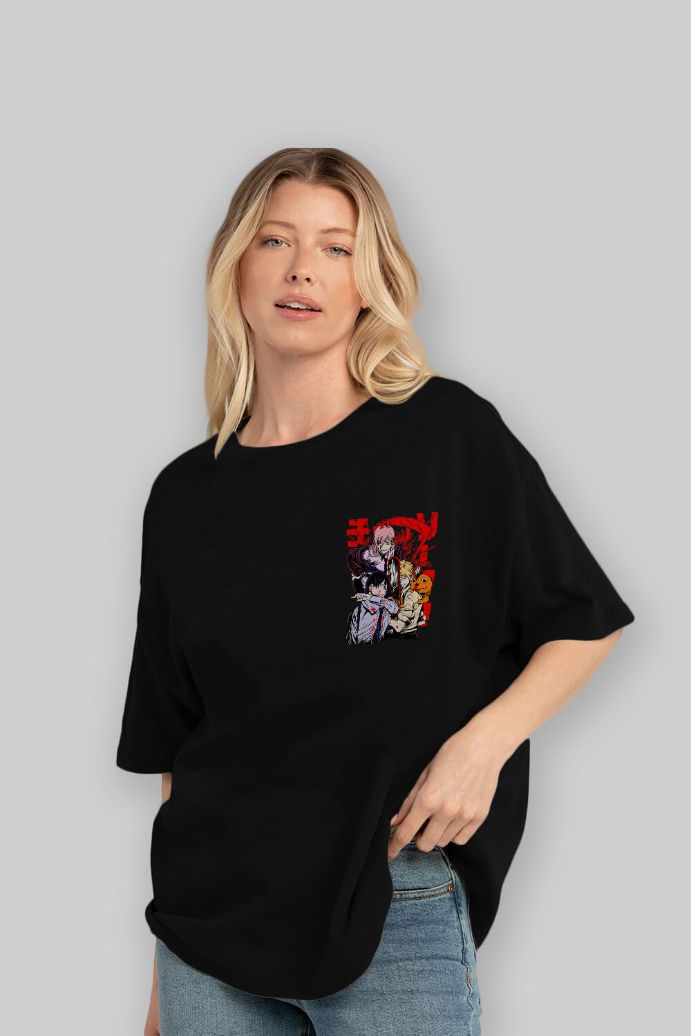 CHAINSAWMAN CREW Ön Sol Baskılı Oversize t-shirt Erkek Kadın Unisex %100 Pamuk Bisiklet Yaka tişort