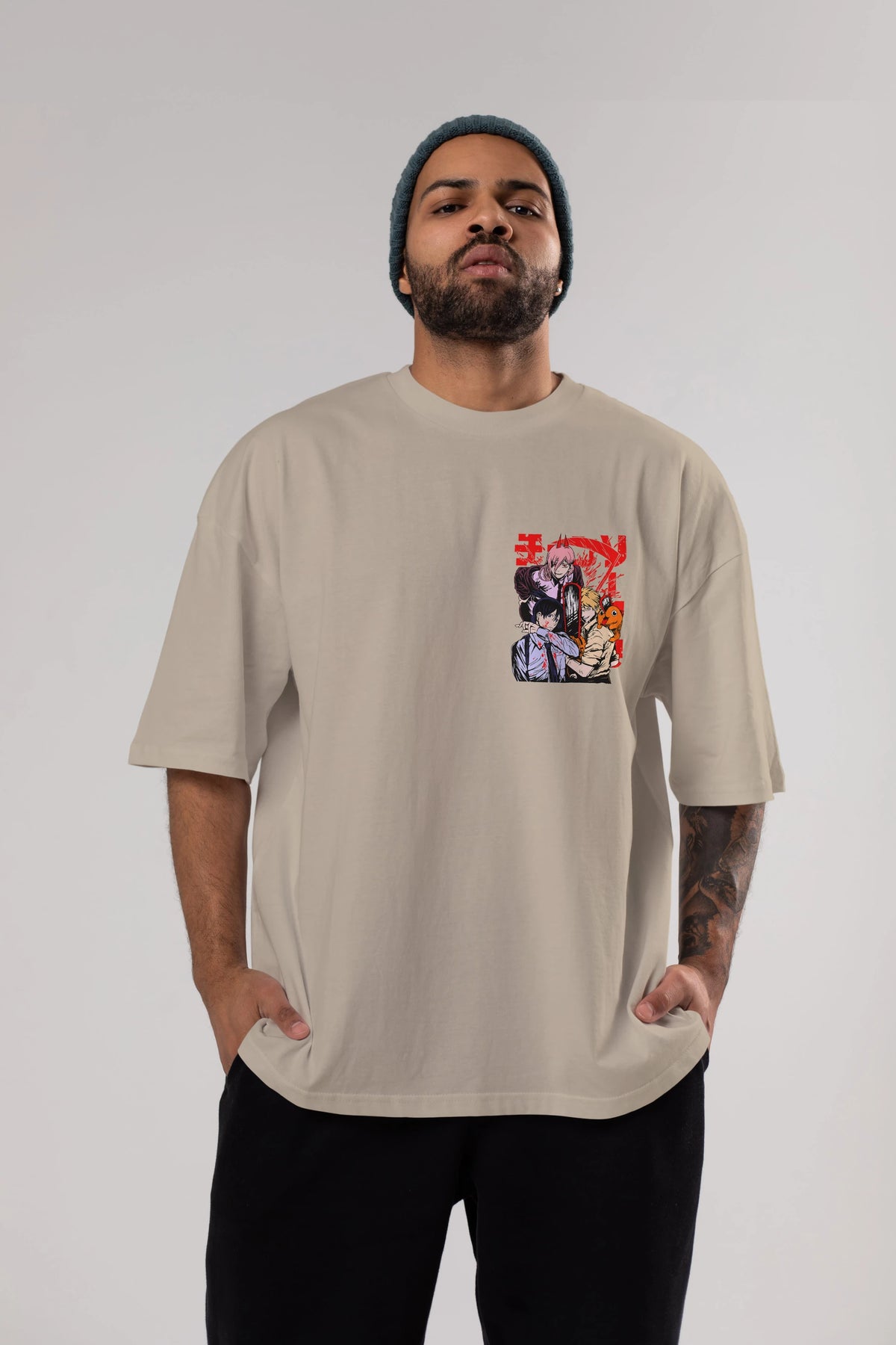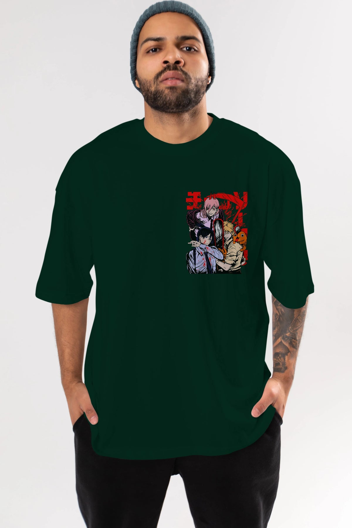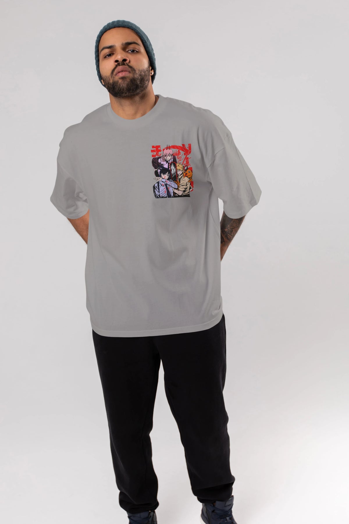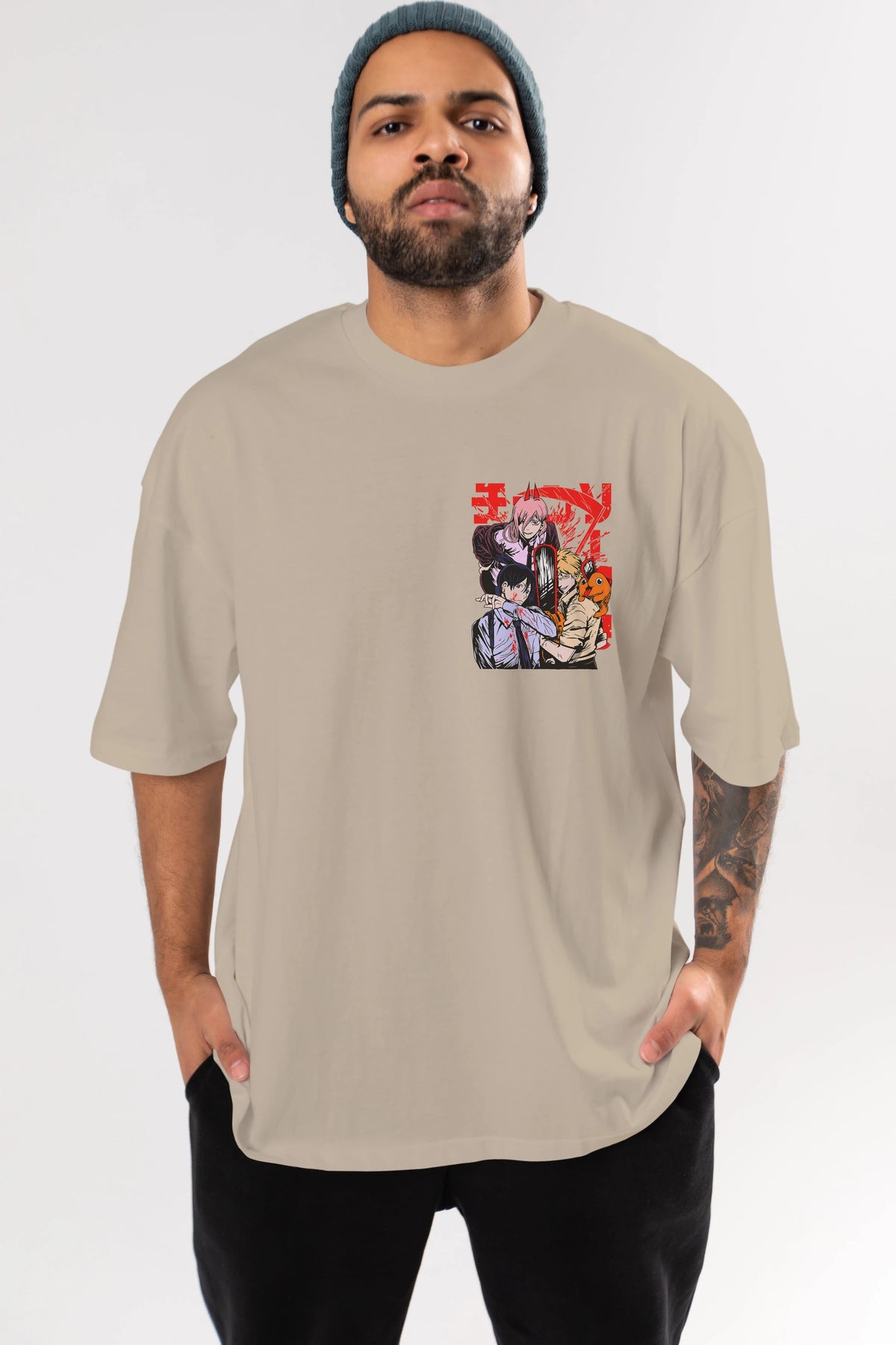 CHAINSAWMAN CREW Ön Sol Baskılı Oversize t-shirt Erkek Kadın Unisex %100 Pamuk Bisiklet Yaka tişort