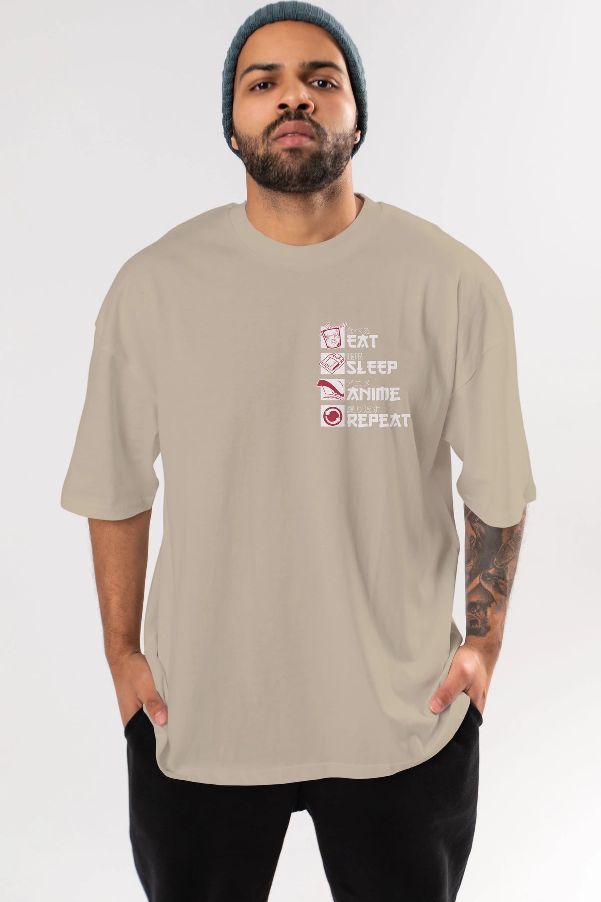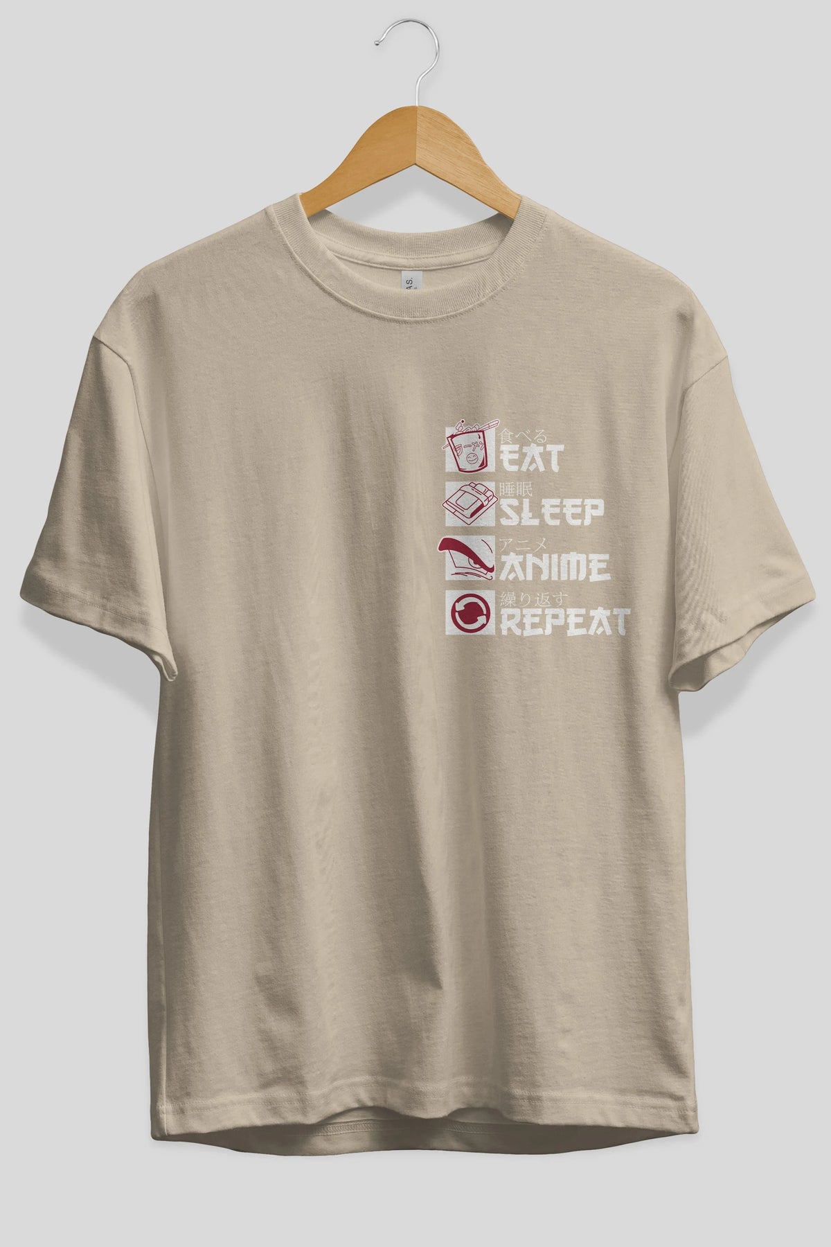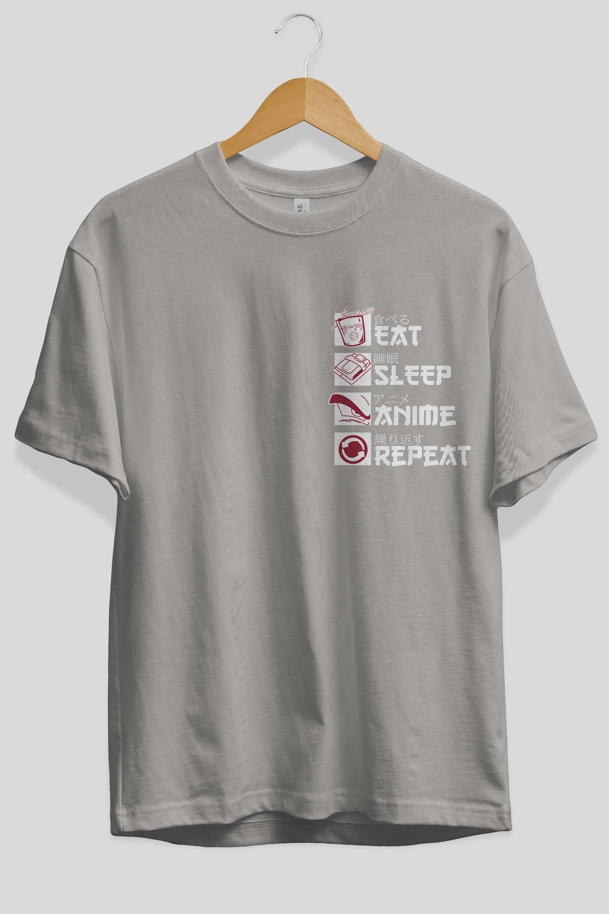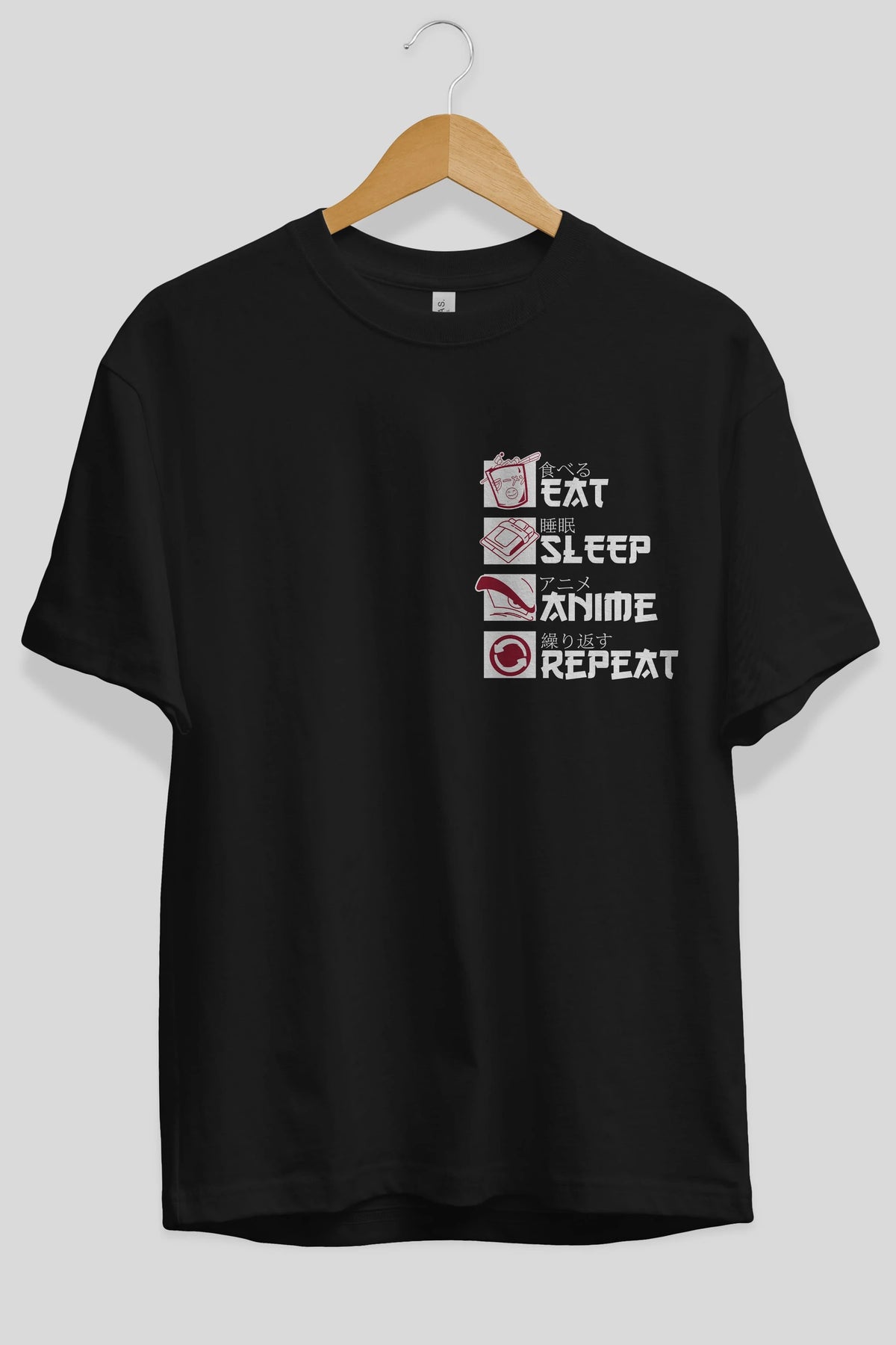 Eat, Sleep, Anime, Repeat Ön Sol Baskılı Oversize t-shirt Erkek Kadın Unisex %100 Pamuk Bisiklet Yaka tişort