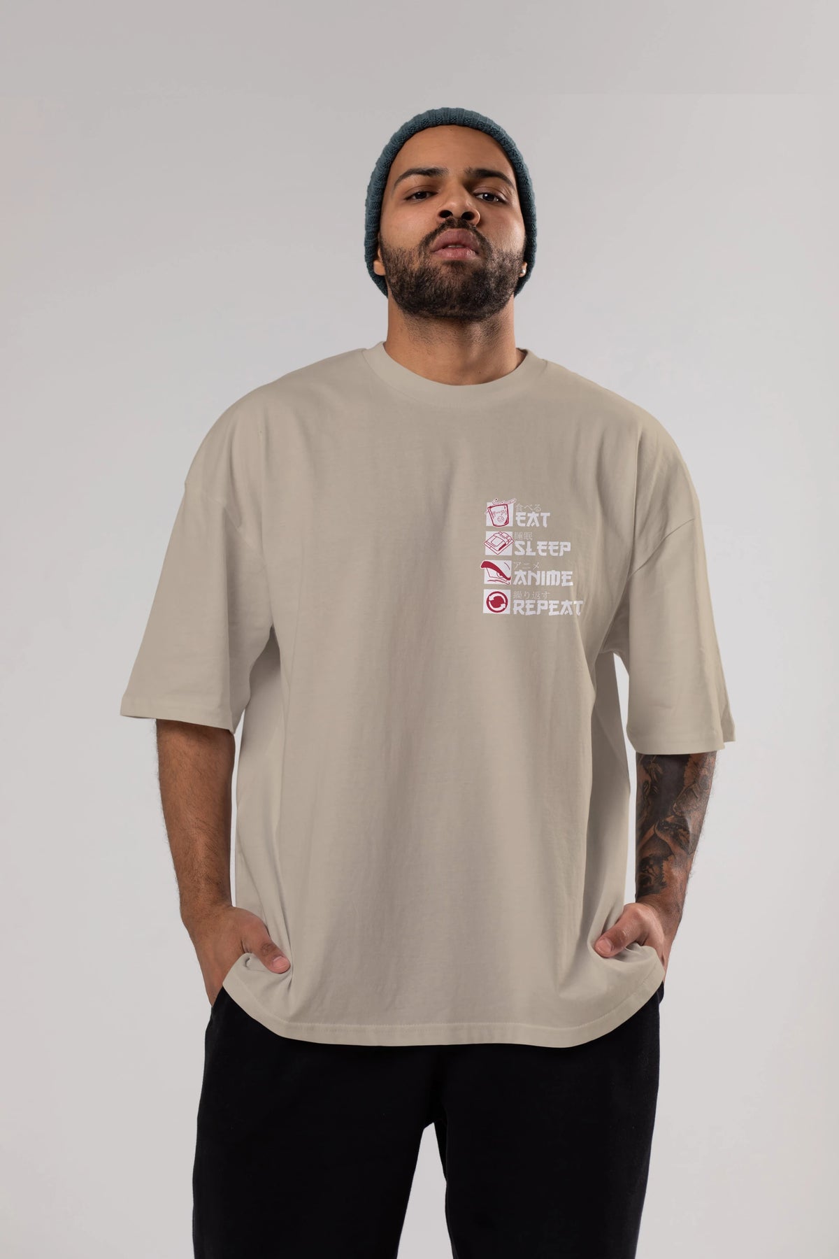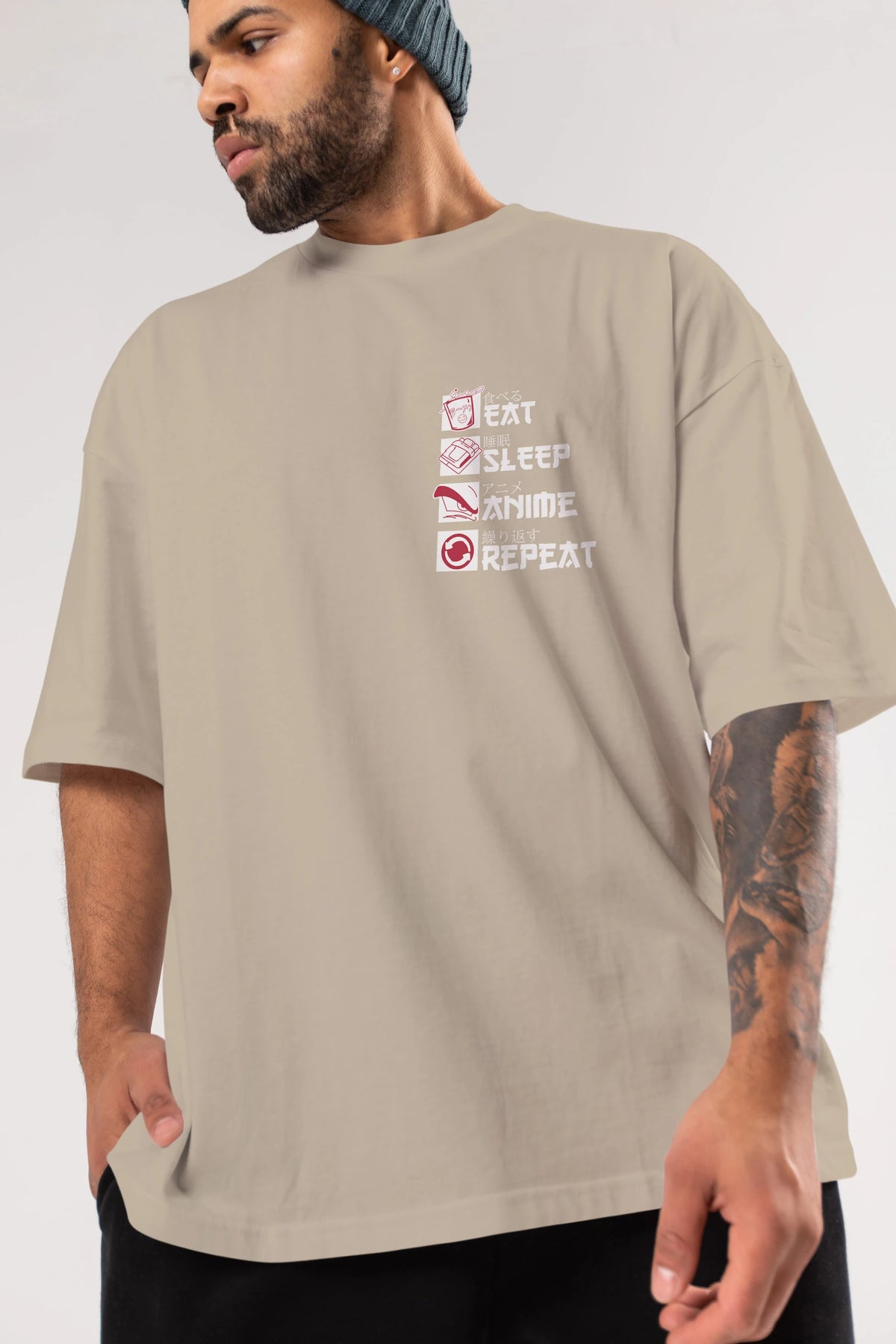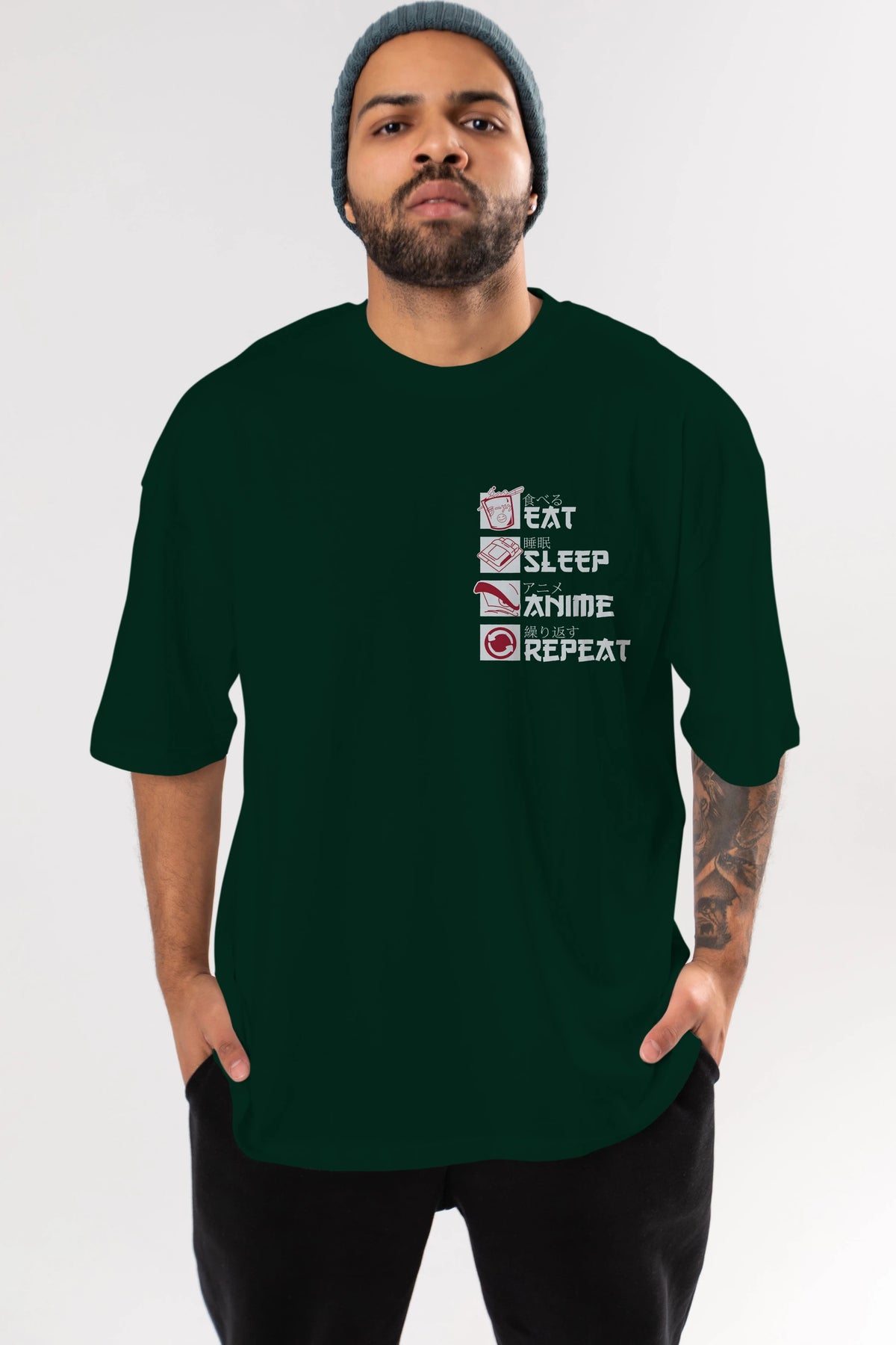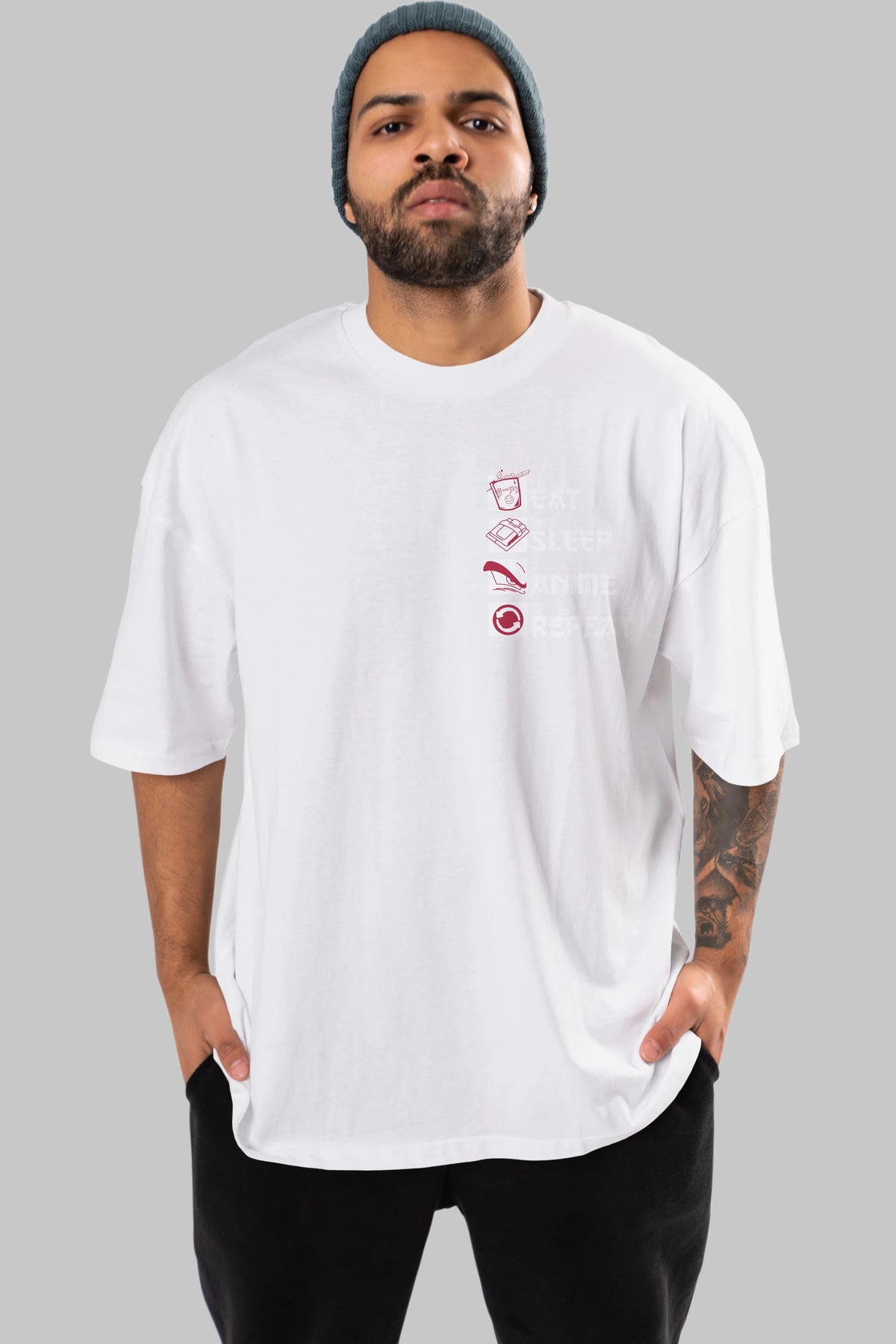 Eat, Sleep, Anime, Repeat Ön Sol Baskılı Oversize t-shirt Erkek Kadın Unisex %100 Pamuk Bisiklet Yaka tişort