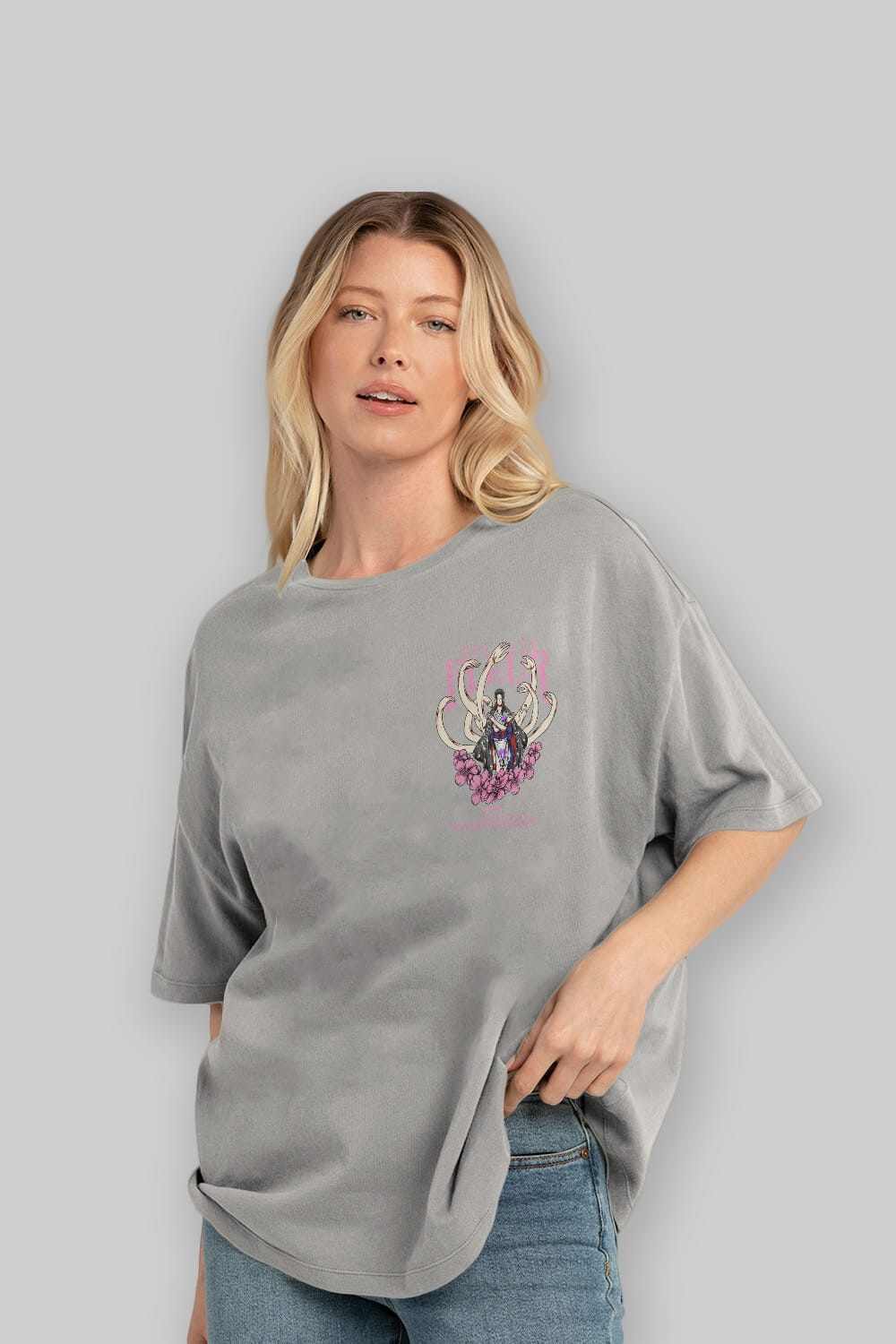 Hem erkekler hem de kadınlar için uygun, taze, modern bir baskıya sahip baskılı oversize t-shirt.