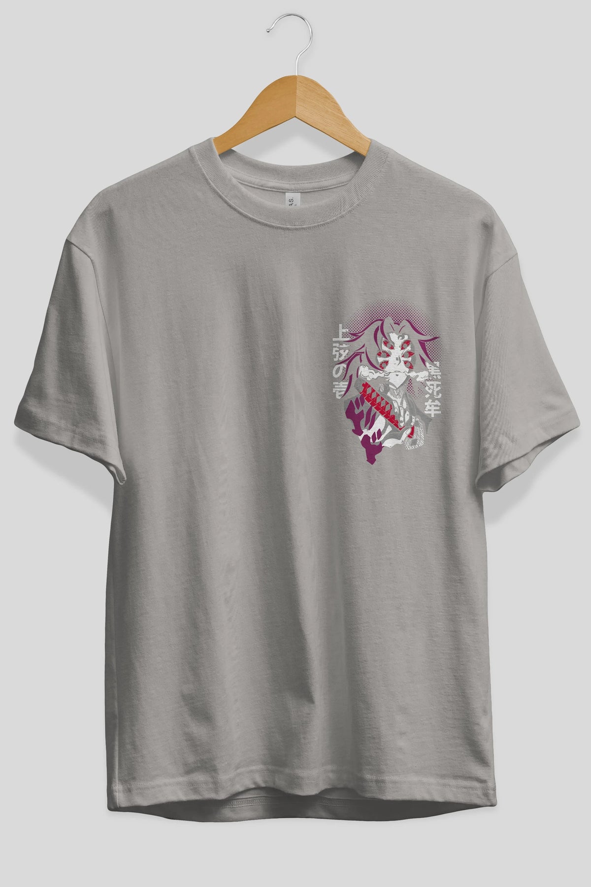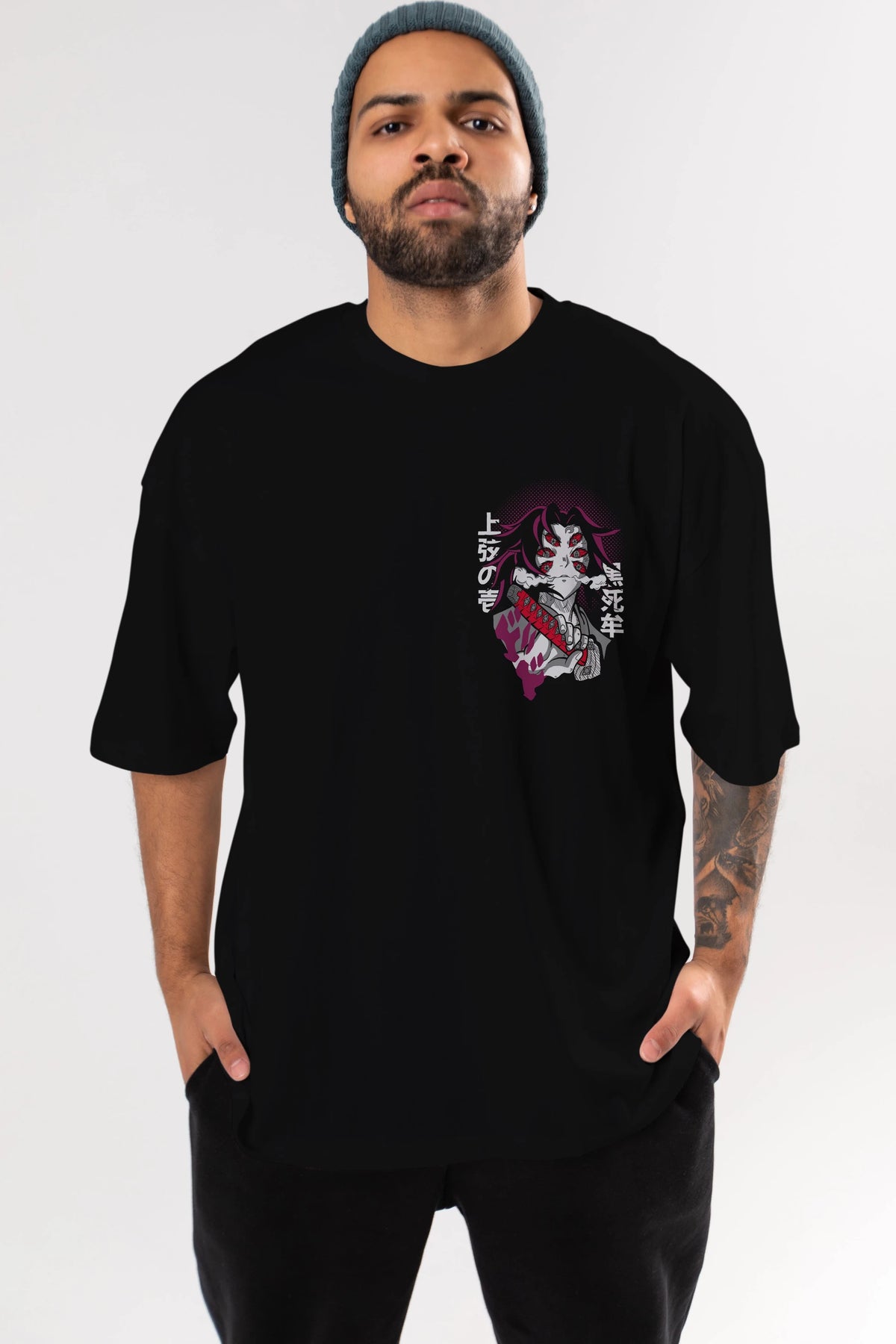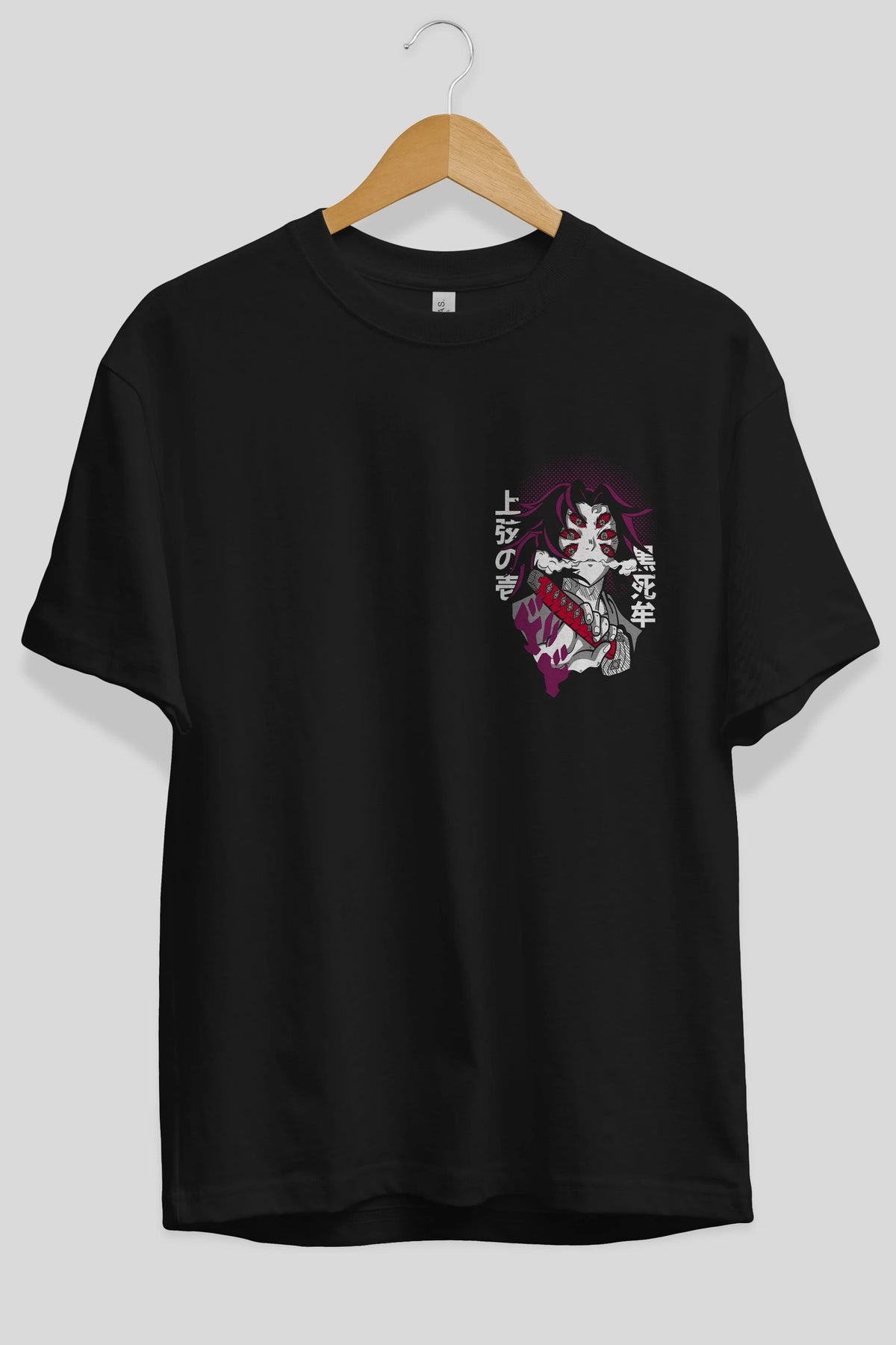 Kokushibo Ön Sol Baskılı Oversize t-shirt Erkek Kadın Unisex %100 Pamuk Bisiklet Yaka tişort