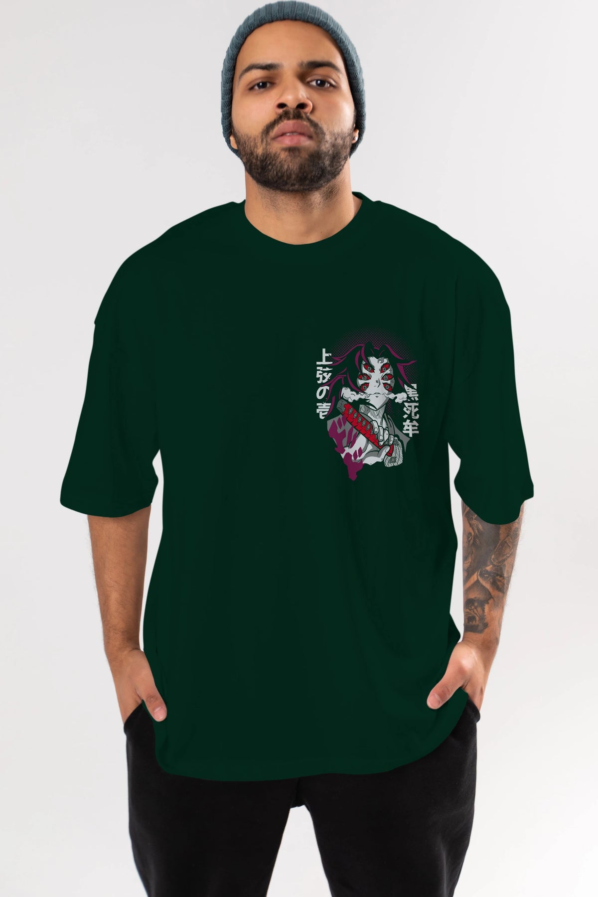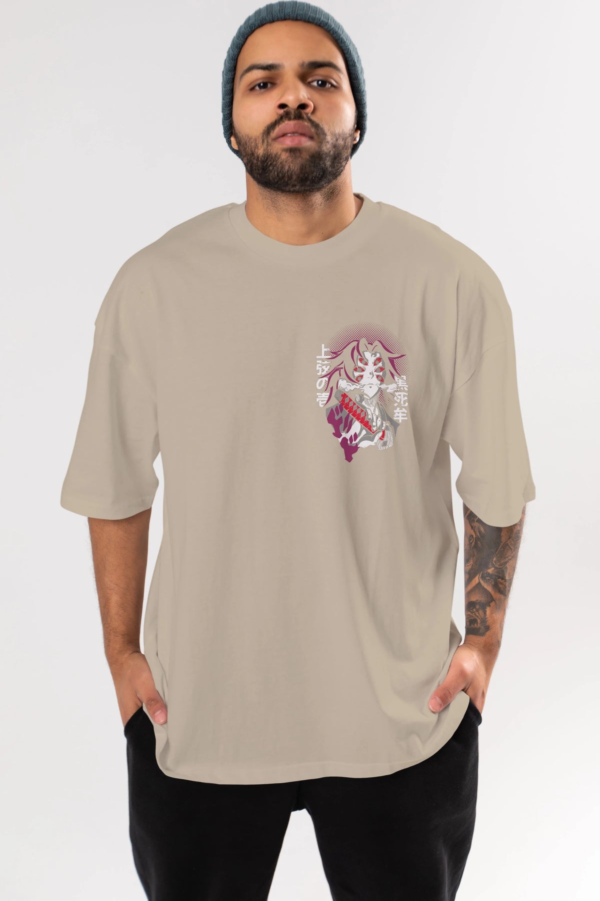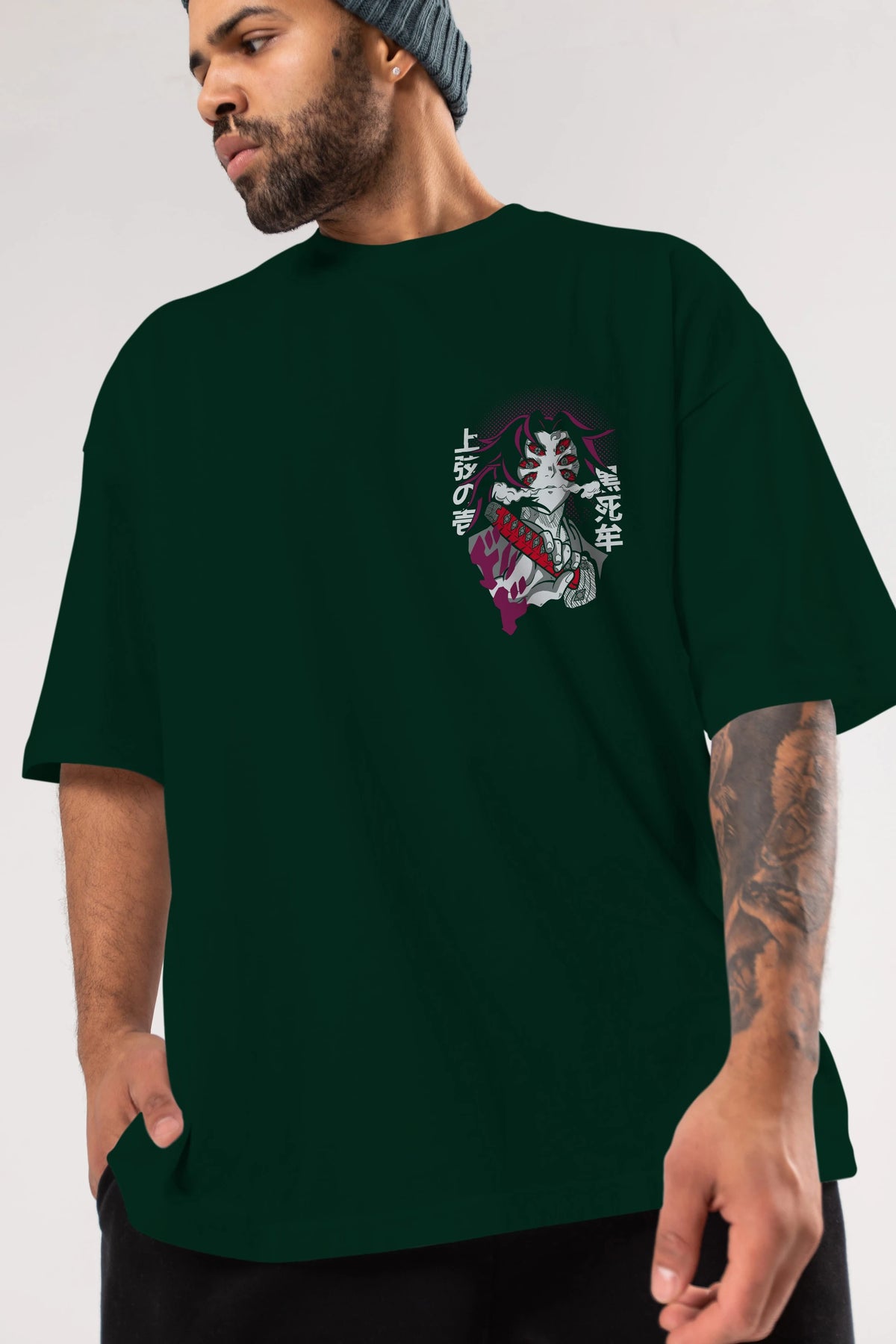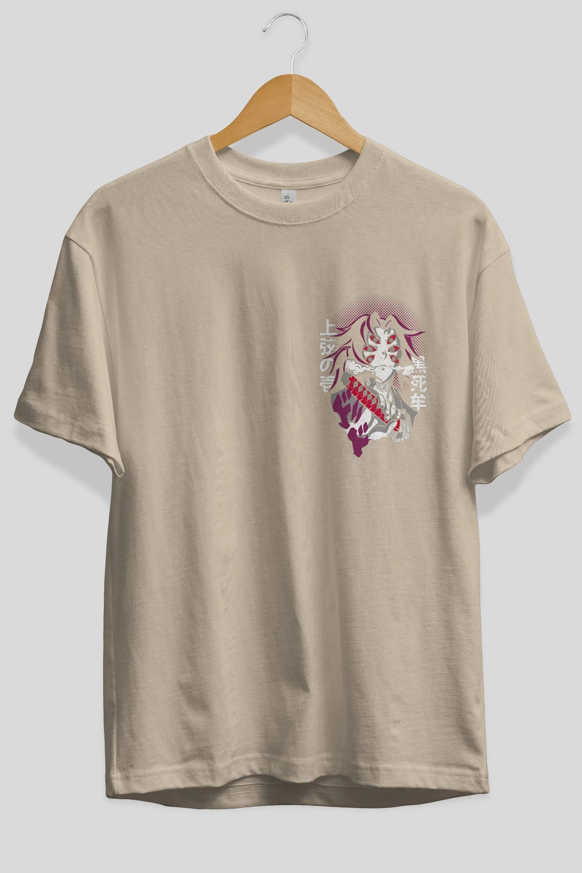 Kokushibo Ön Sol Baskılı Oversize t-shirt Erkek Kadın Unisex %100 Pamuk Bisiklet Yaka tişort