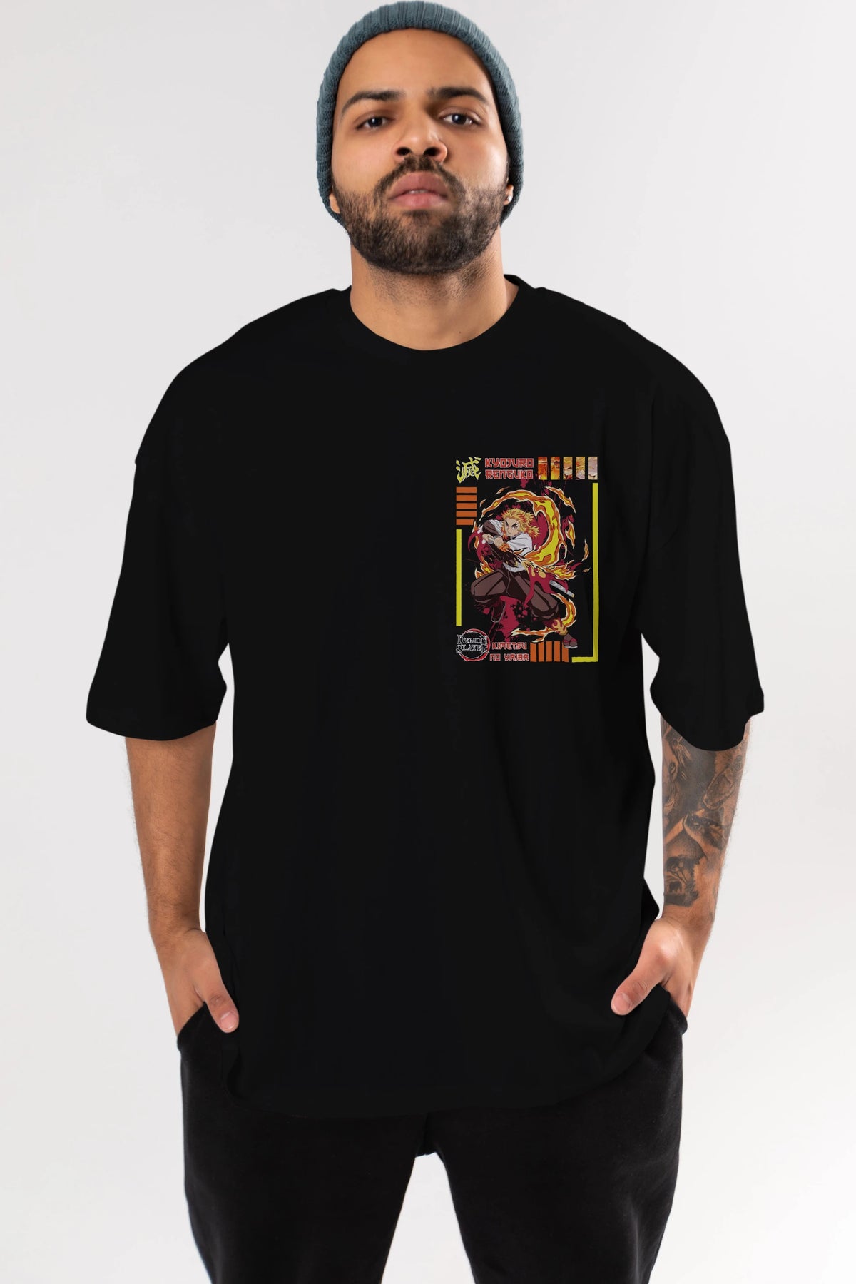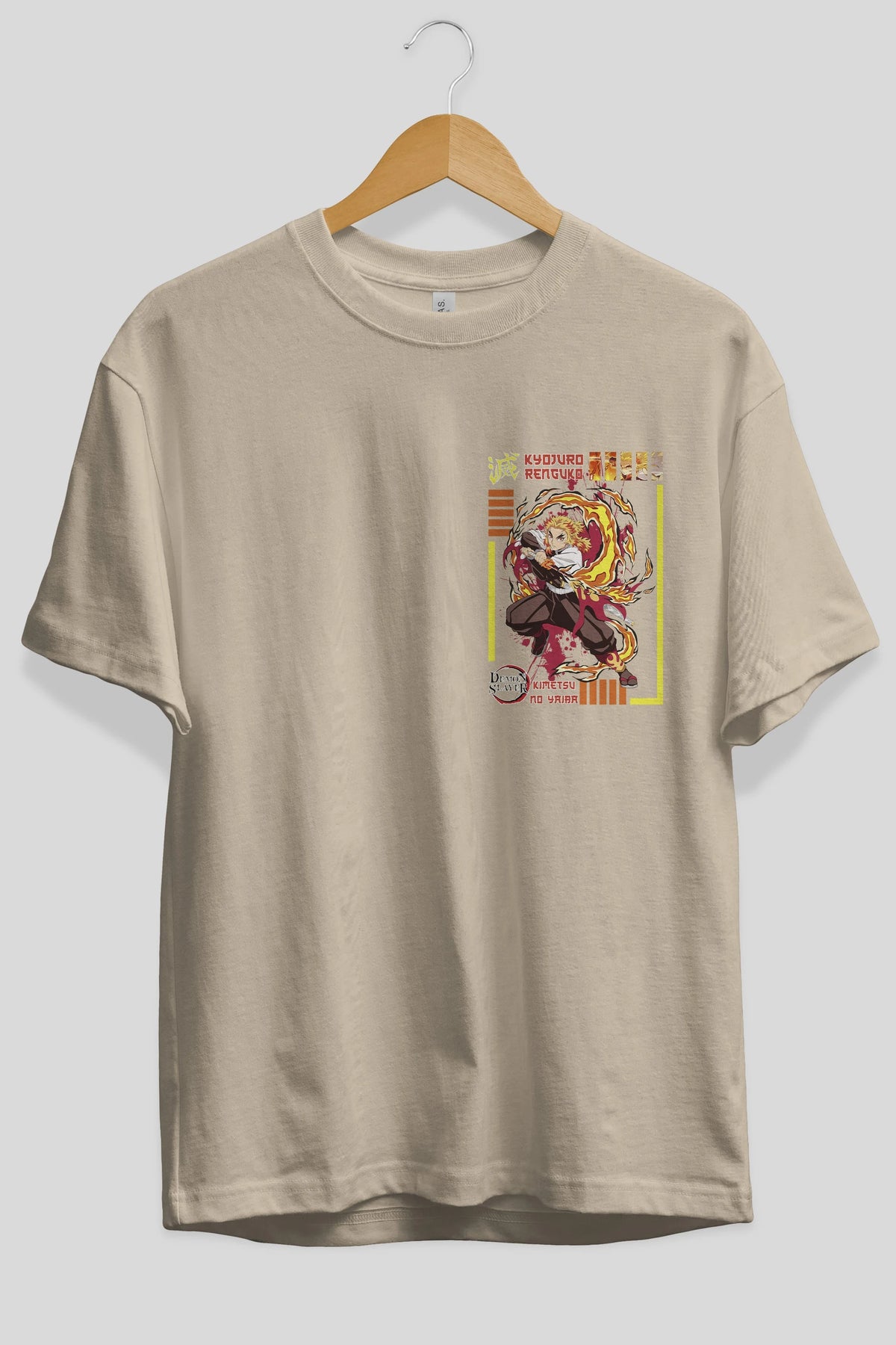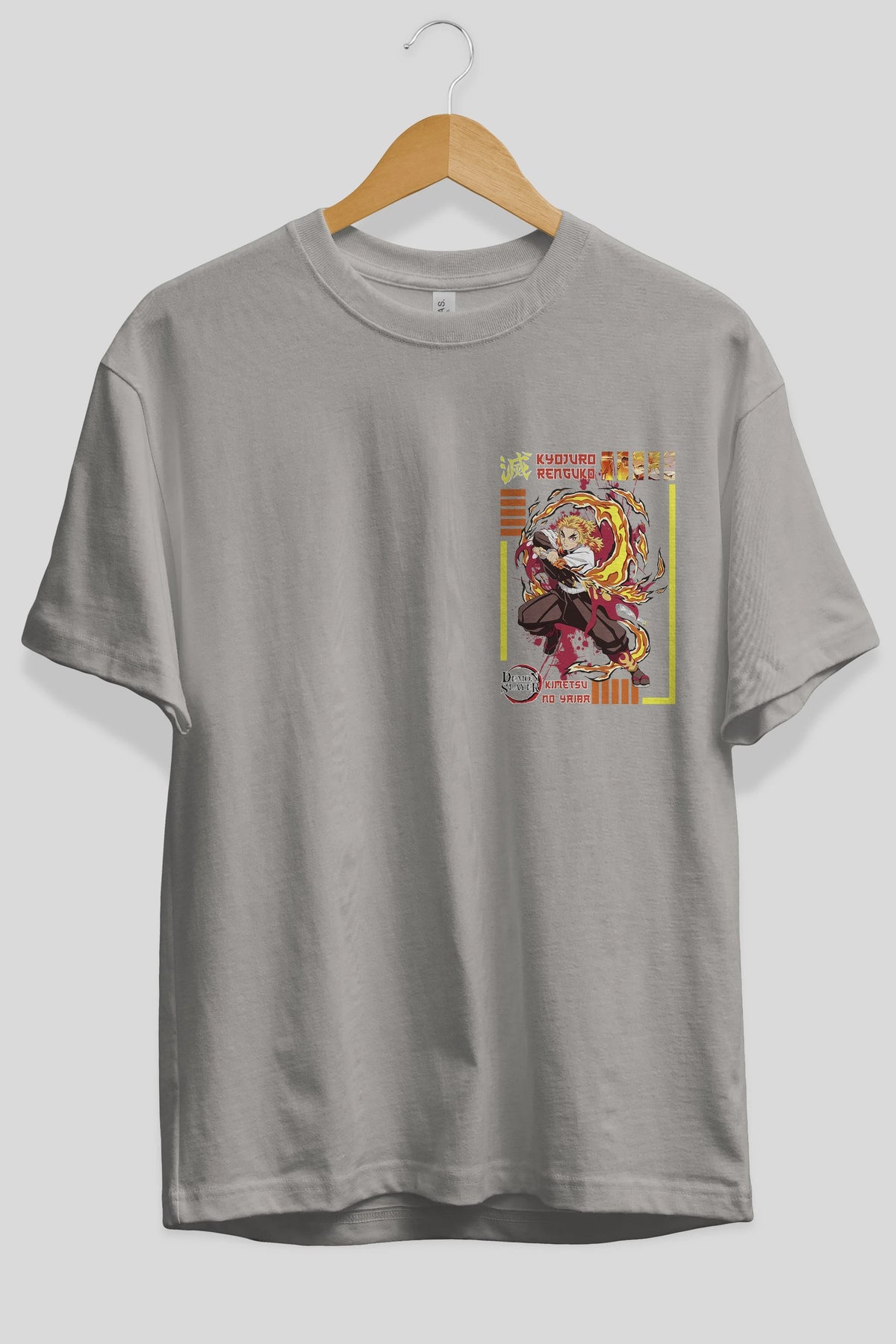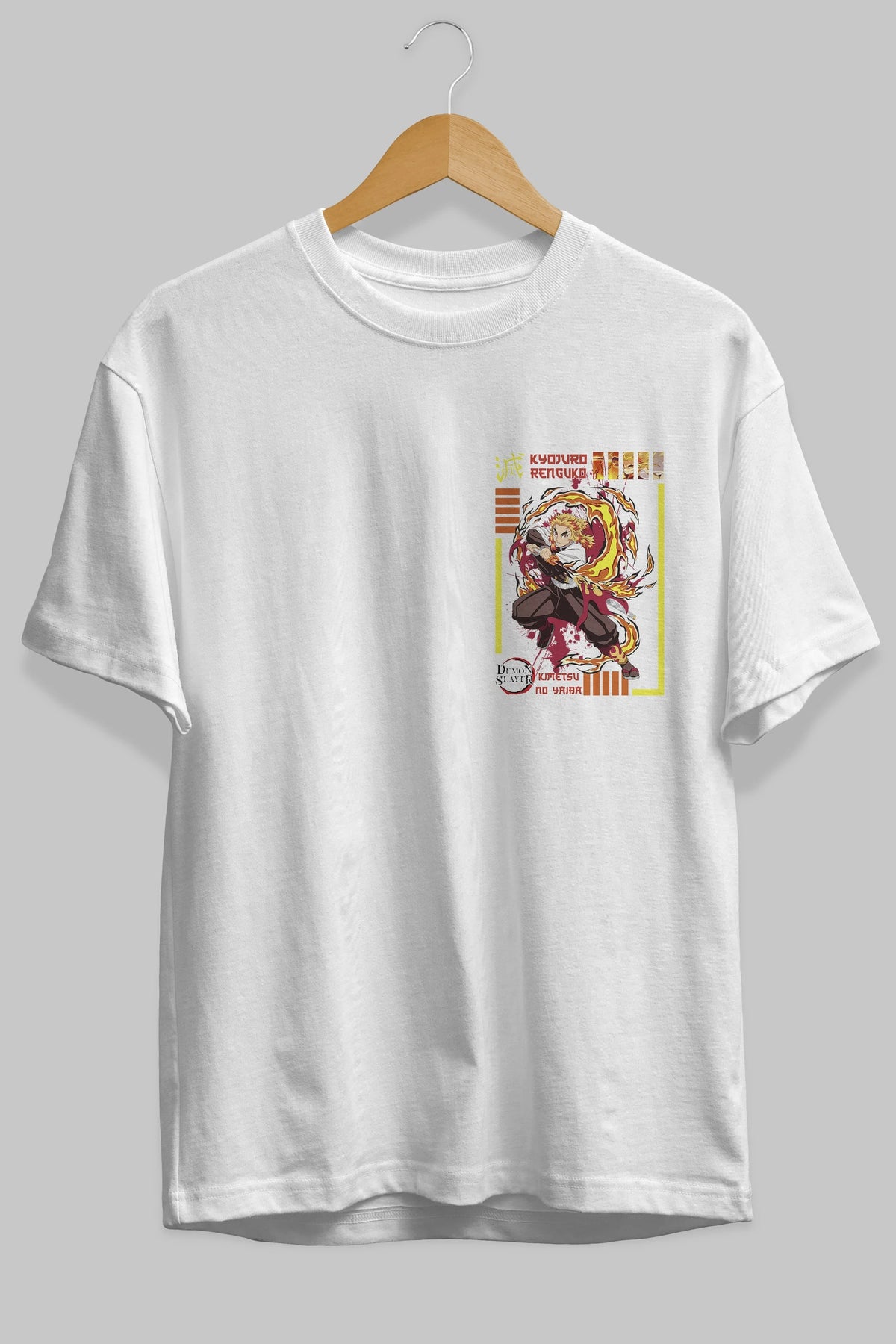 KYOJURO RENGOKU Ön Sol Baskılı Oversize t-shirt Erkek Kadın Unisex %100 Pamuk Bisiklet Yaka tişort