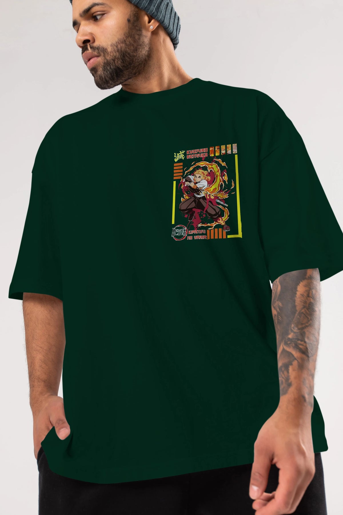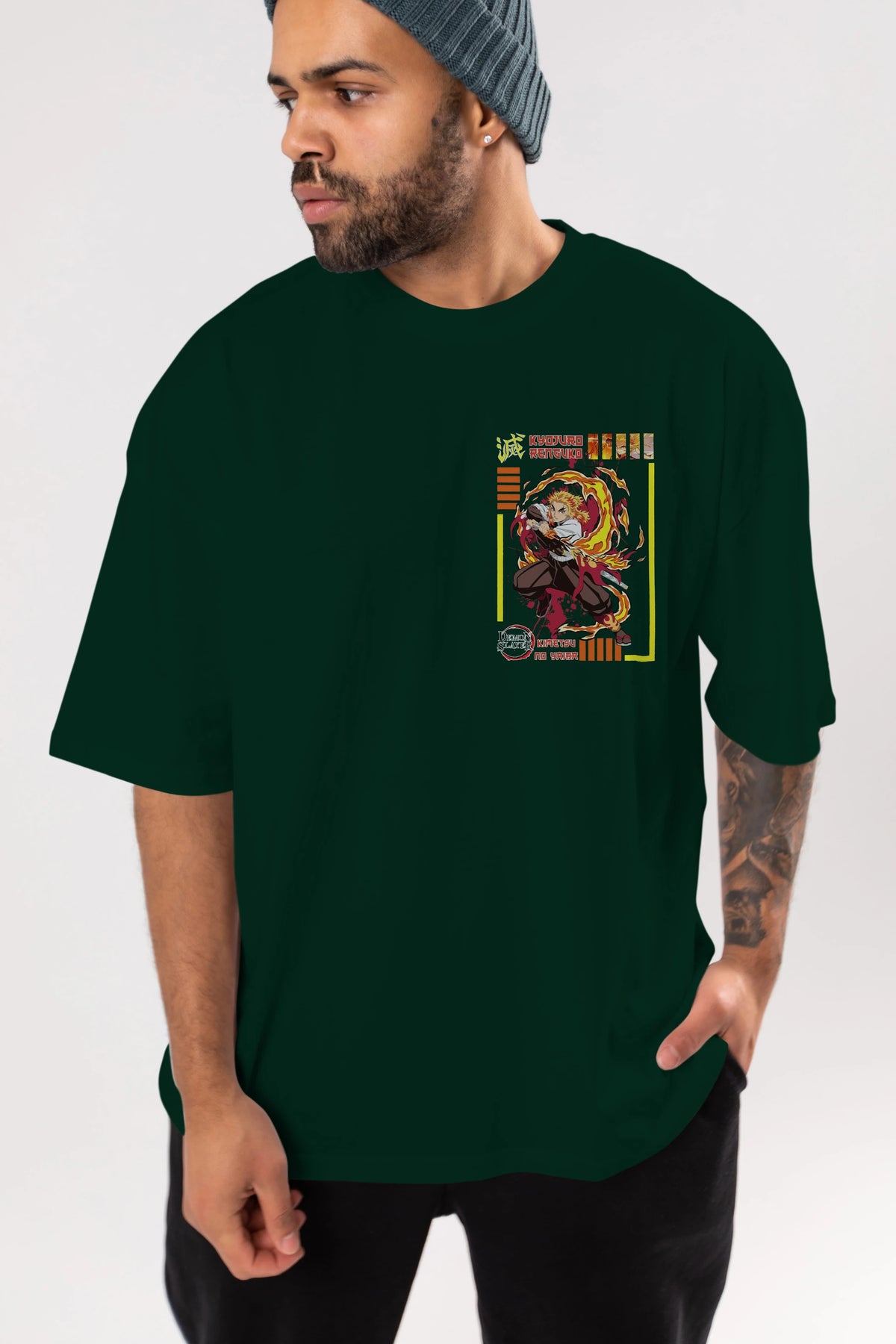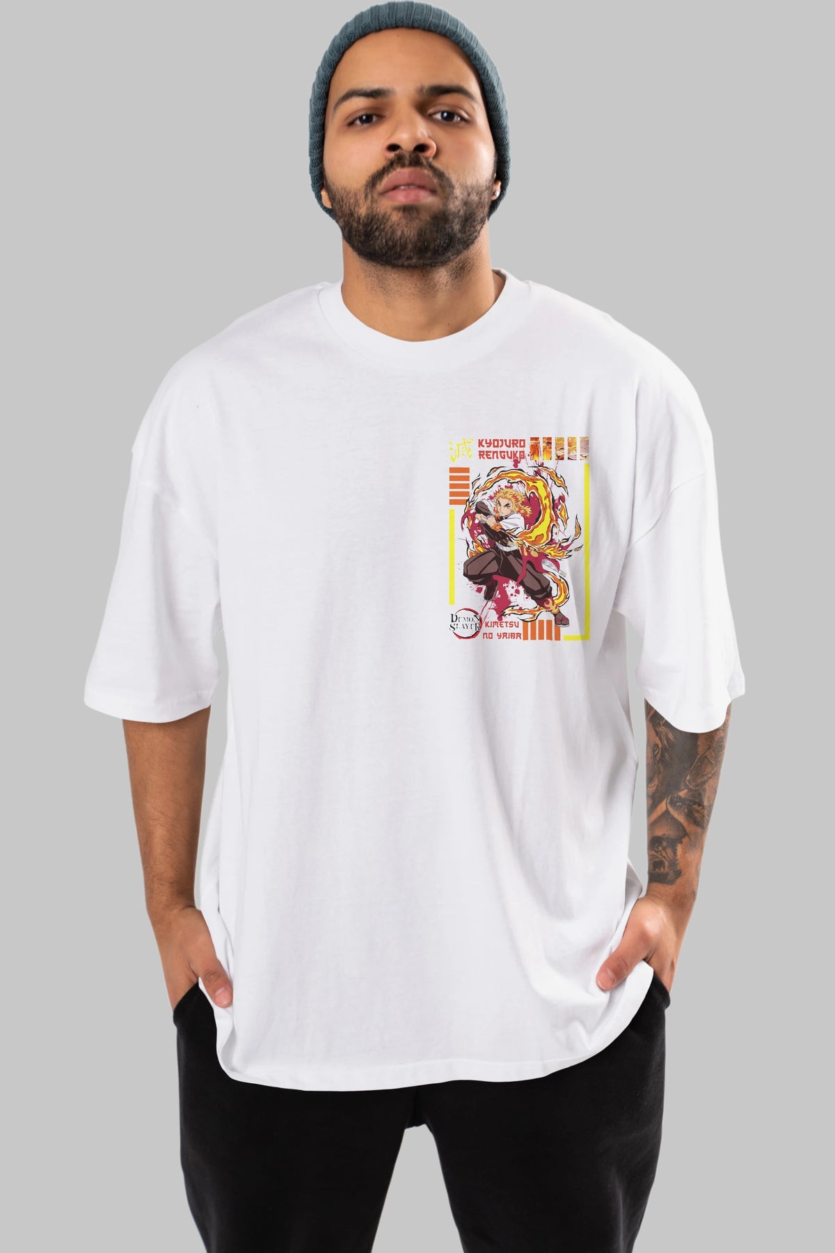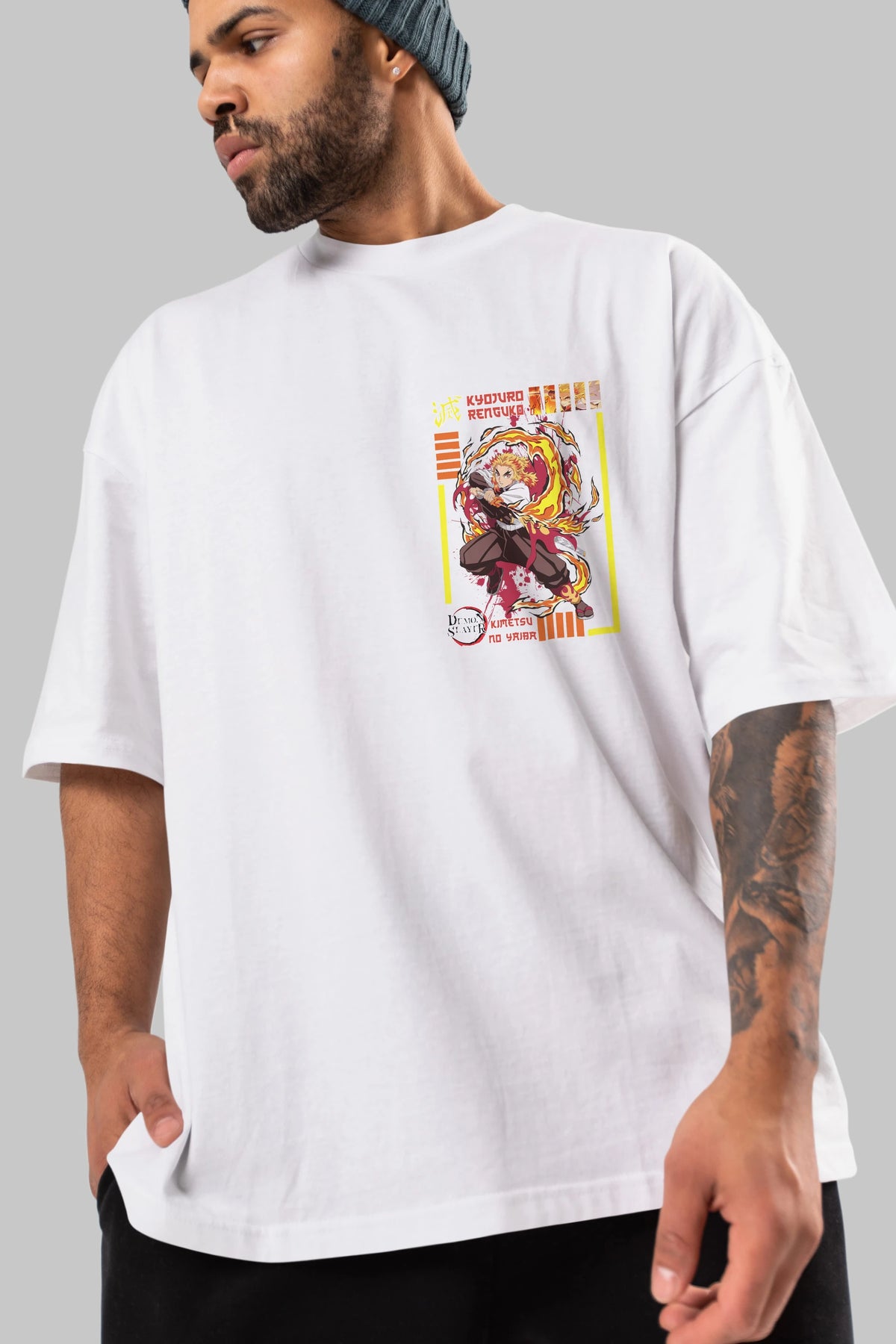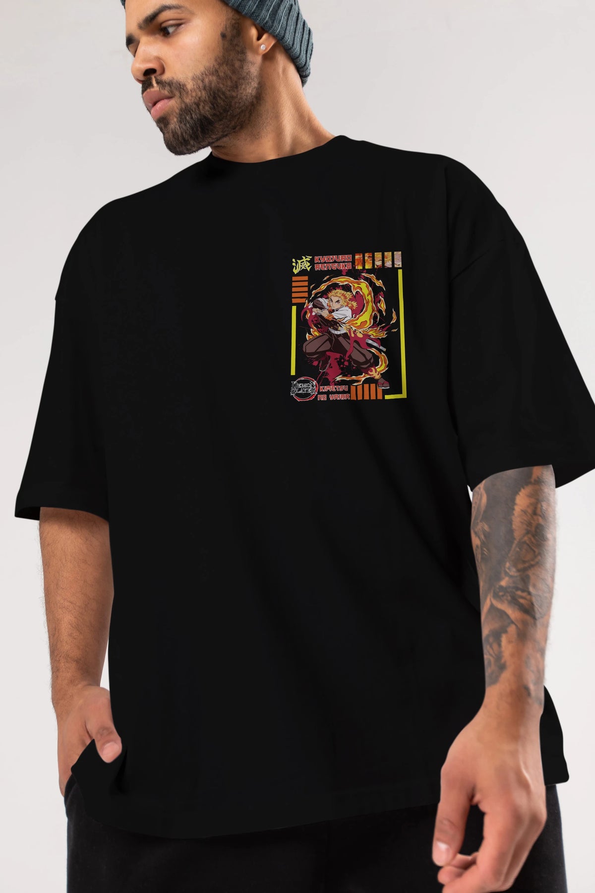 KYOJURO RENGOKU Ön Sol Baskılı Oversize t-shirt Erkek Kadın Unisex %100 Pamuk Bisiklet Yaka tişort