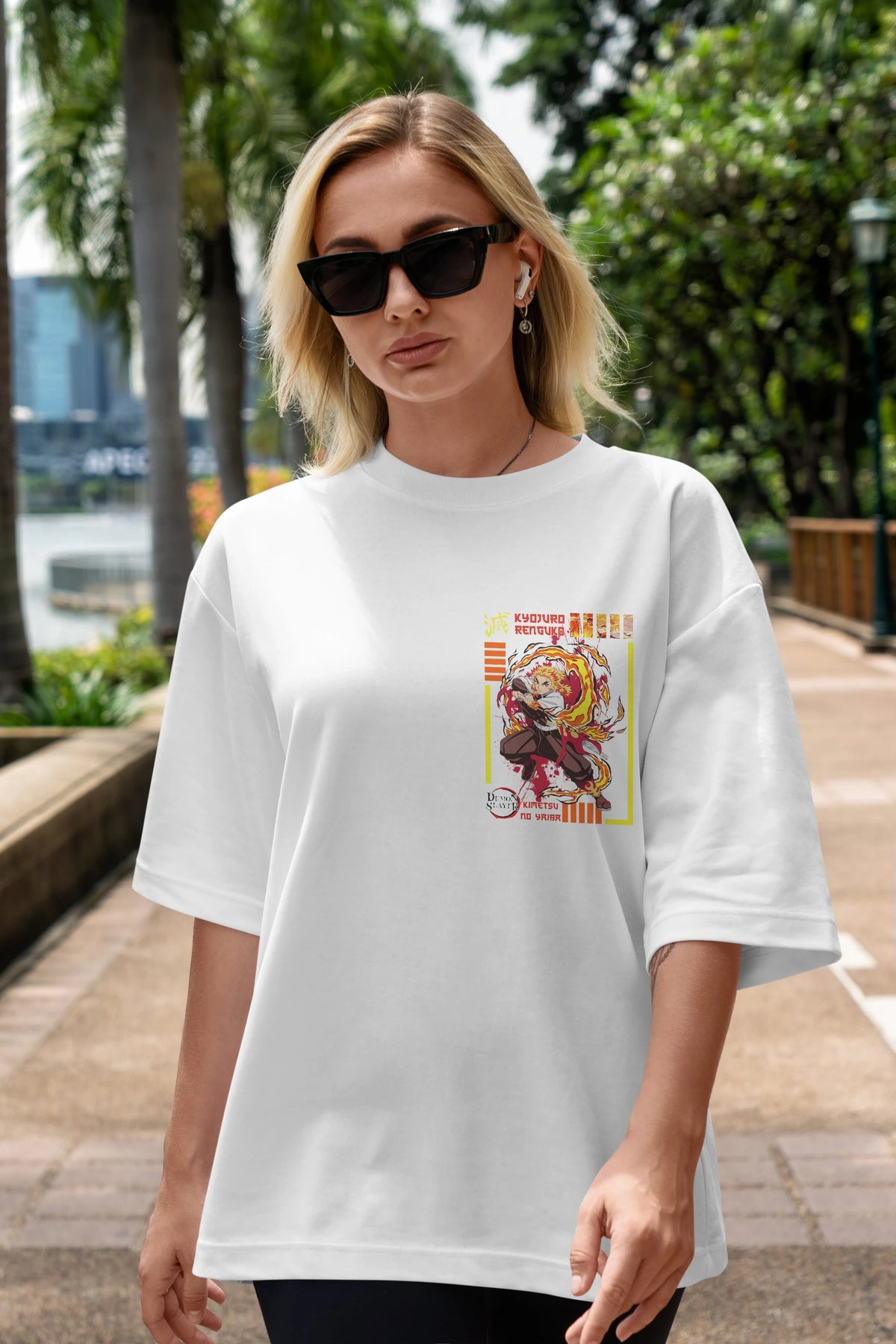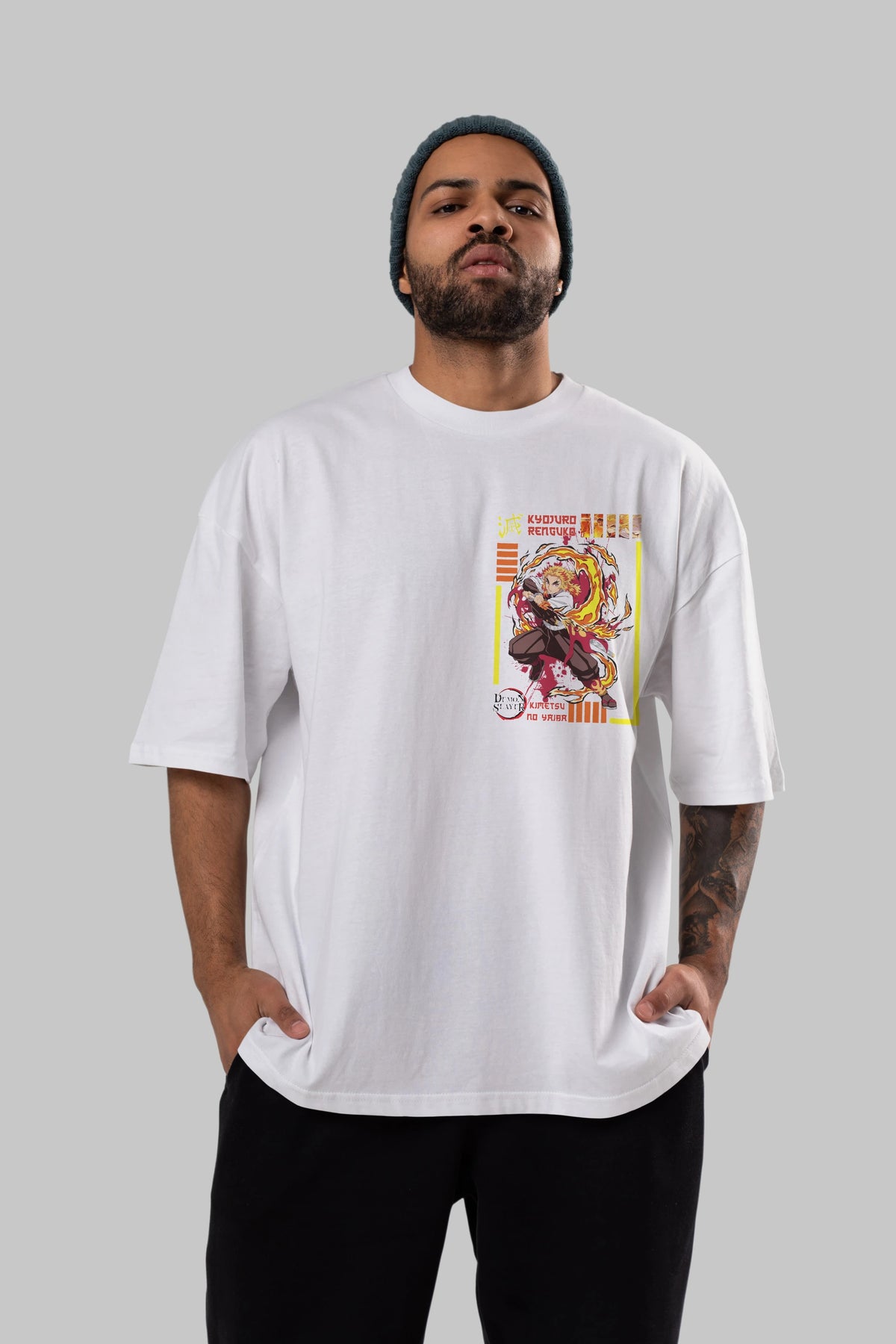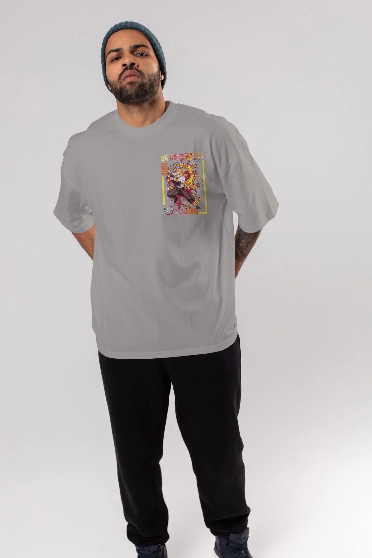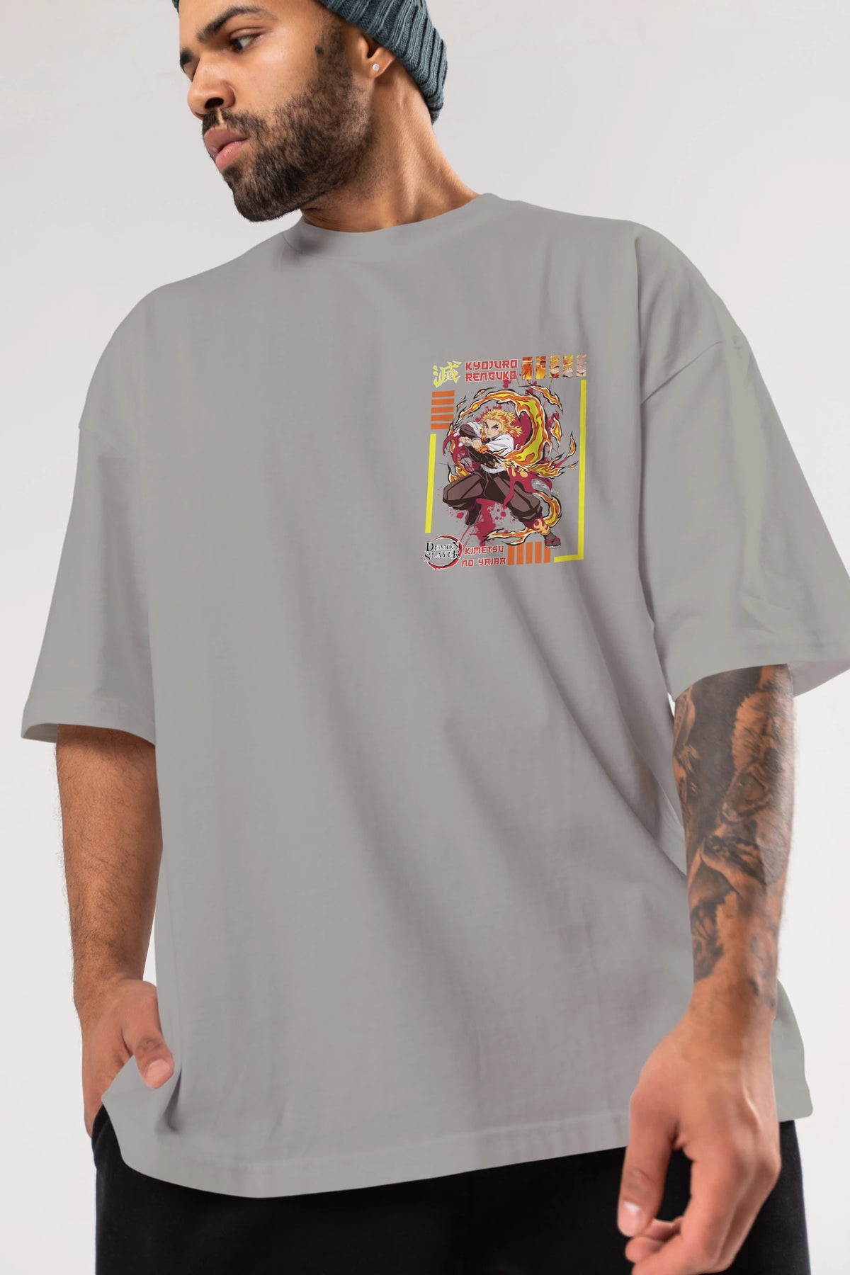 KYOJURO RENGOKU Ön Sol Baskılı Oversize t-shirt Erkek Kadın Unisex %100 Pamuk Bisiklet Yaka tişort