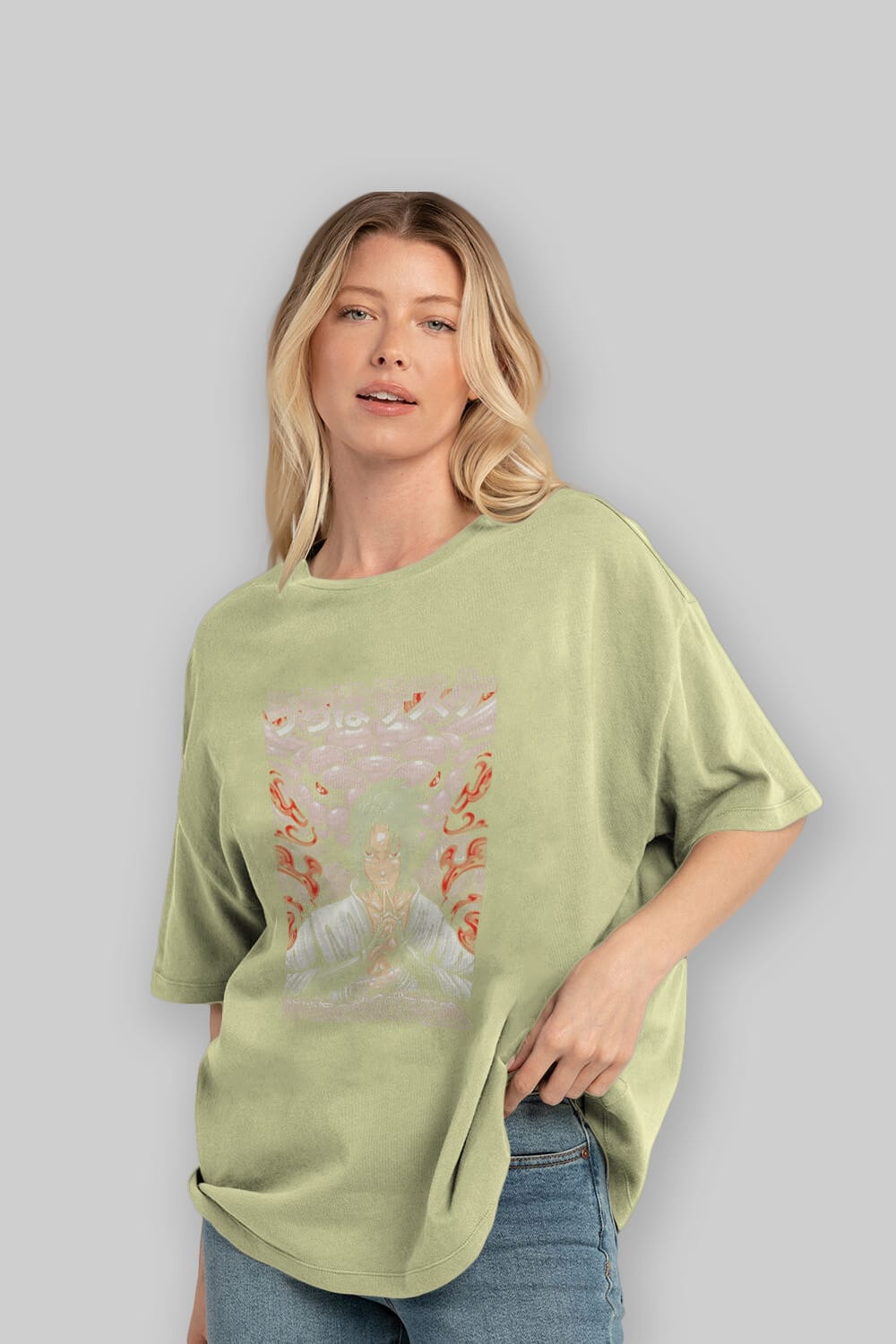 Hem erkekler hem de kadınlar için uygun, taze, modern bir baskıya sahip baskılı oversize t-shirt.