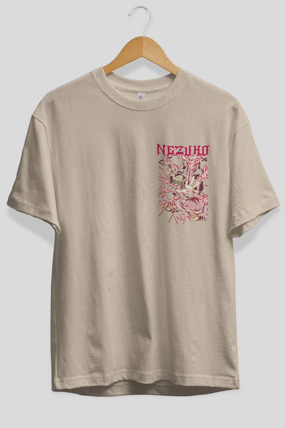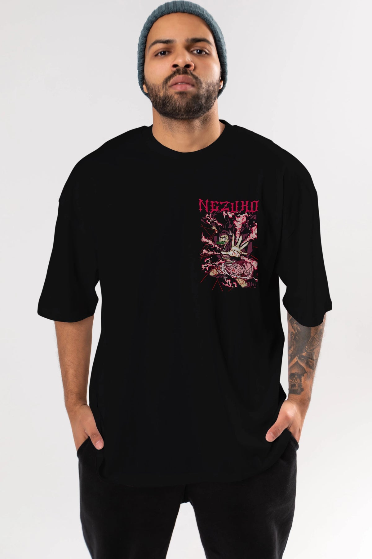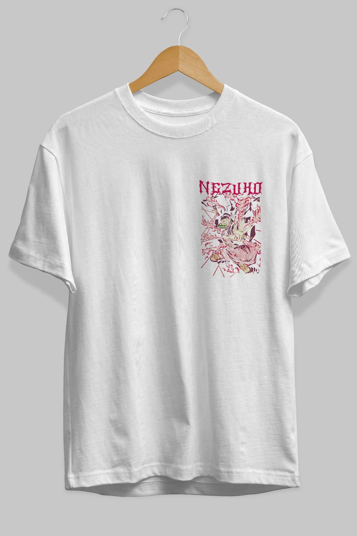 NEZUKO KAMADO Ön Sol Baskılı Oversize t-shirt Erkek Kadın Unisex %100 Pamuk Bisiklet Yaka tişort
