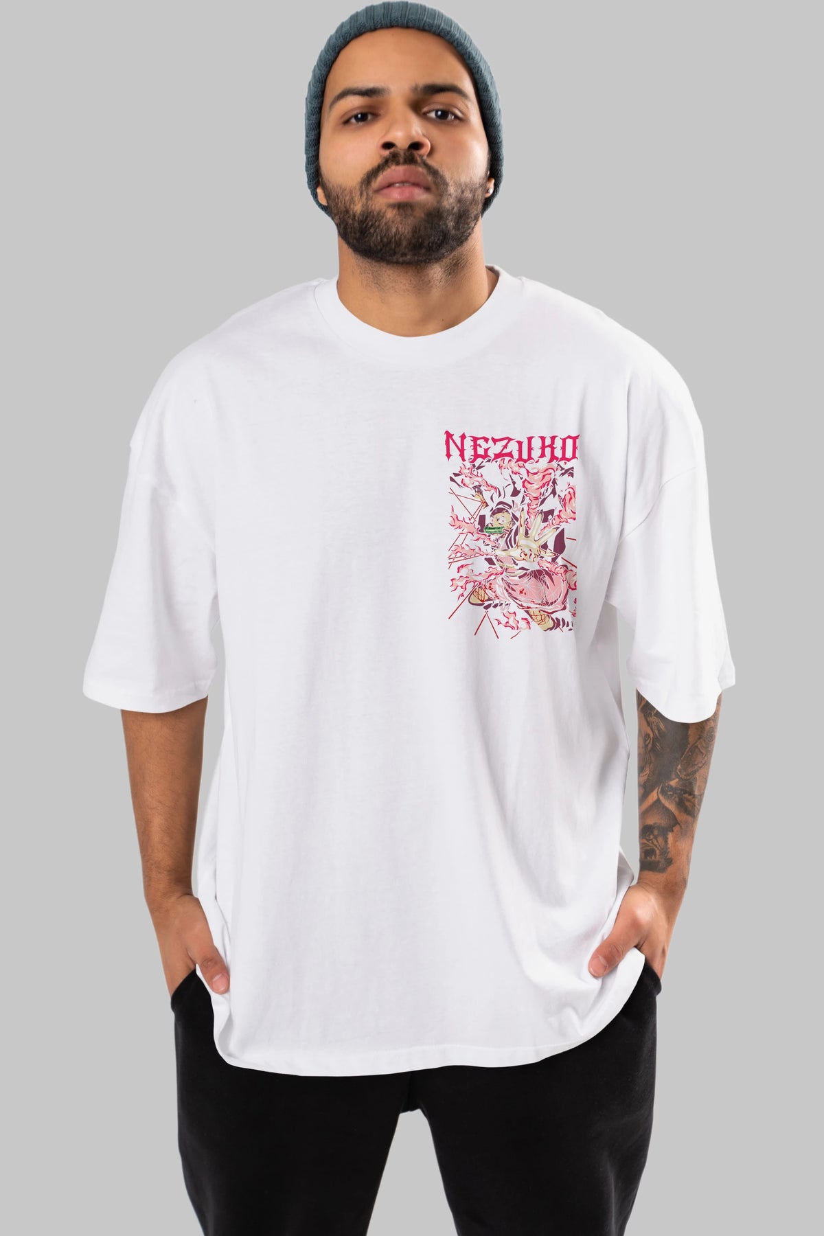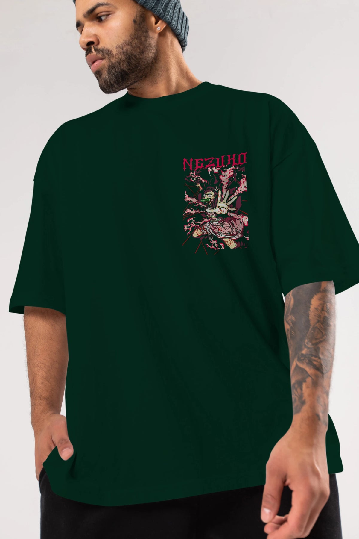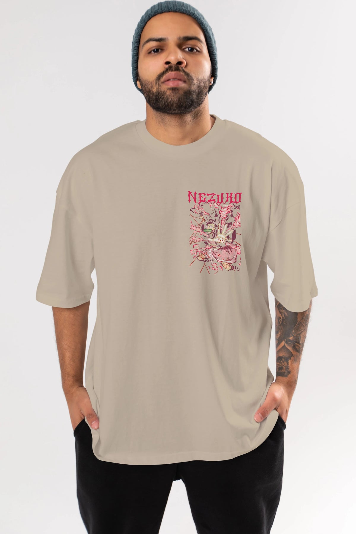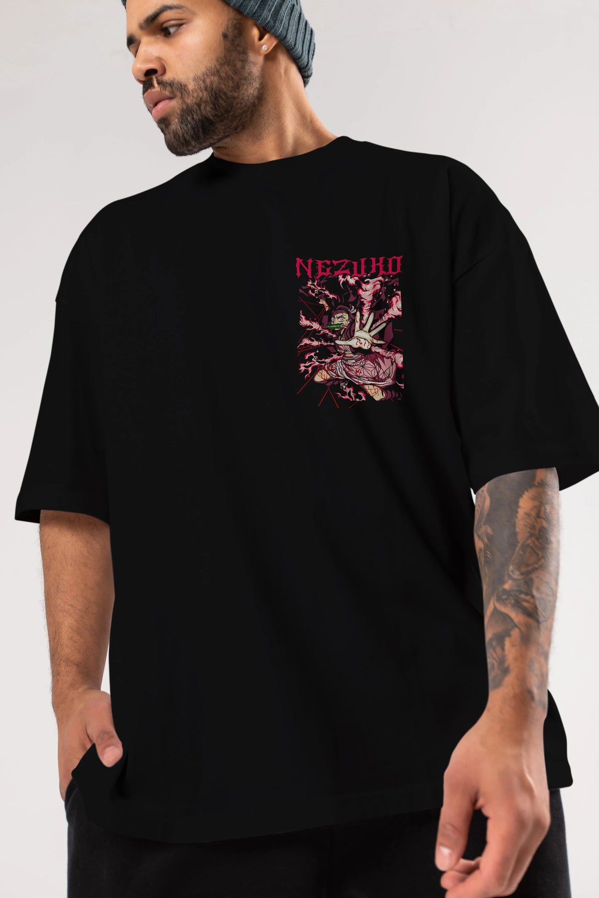 NEZUKO KAMADO Ön Sol Baskılı Oversize t-shirt Erkek Kadın Unisex %100 Pamuk Bisiklet Yaka tişort