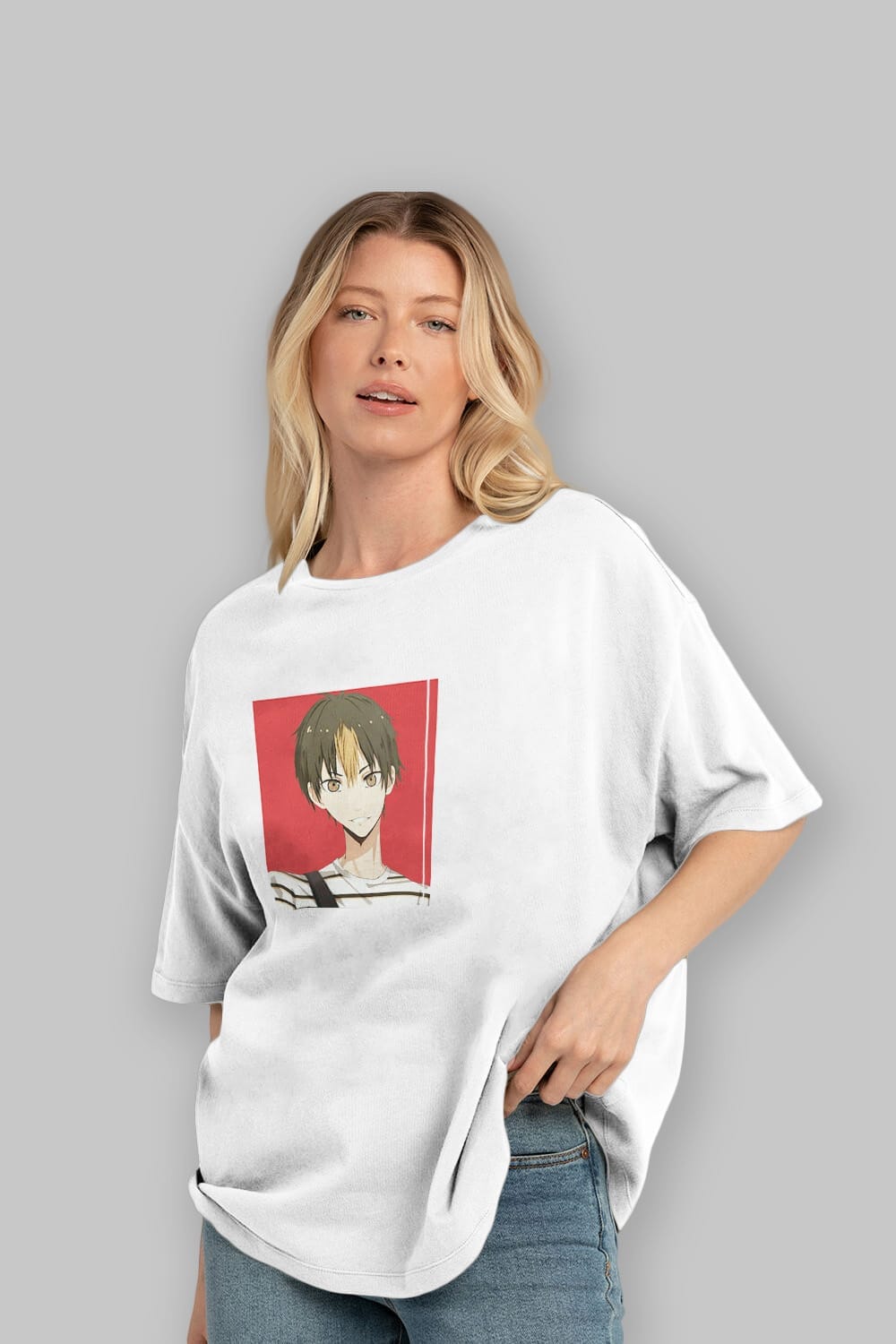 Hem erkekler hem de kadınlar için uygun, taze, modern bir baskıya sahip baskılı oversize t-shirt.