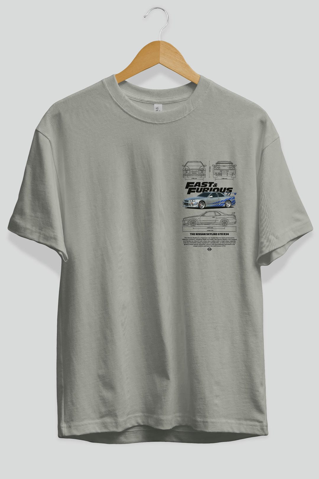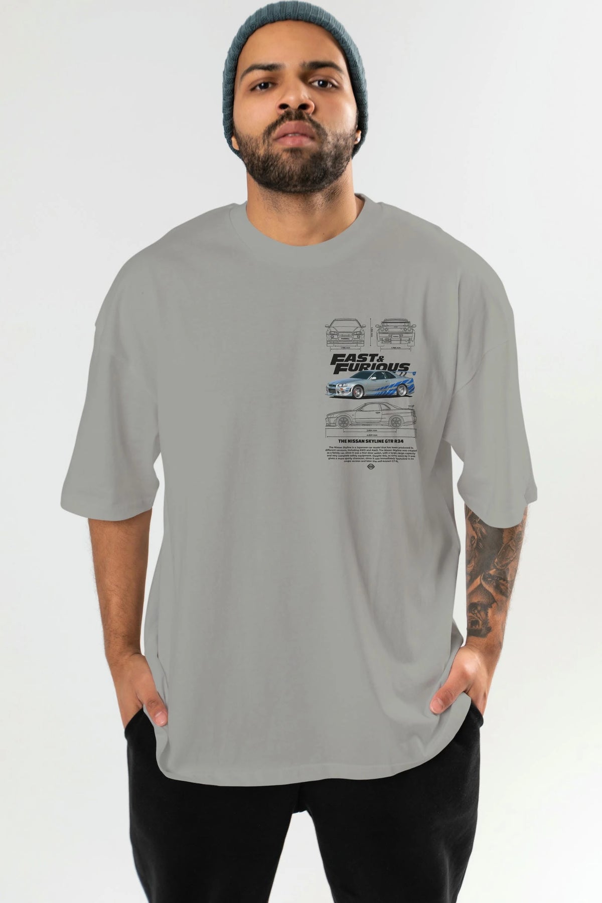 NISSAN SKYLINE R34 FAST AND FURIOUS Ön Sol Baskılı Oversize t-shirt Erkek Kadın Unisex %100 Pamuk Bisiklet Yaka tişort