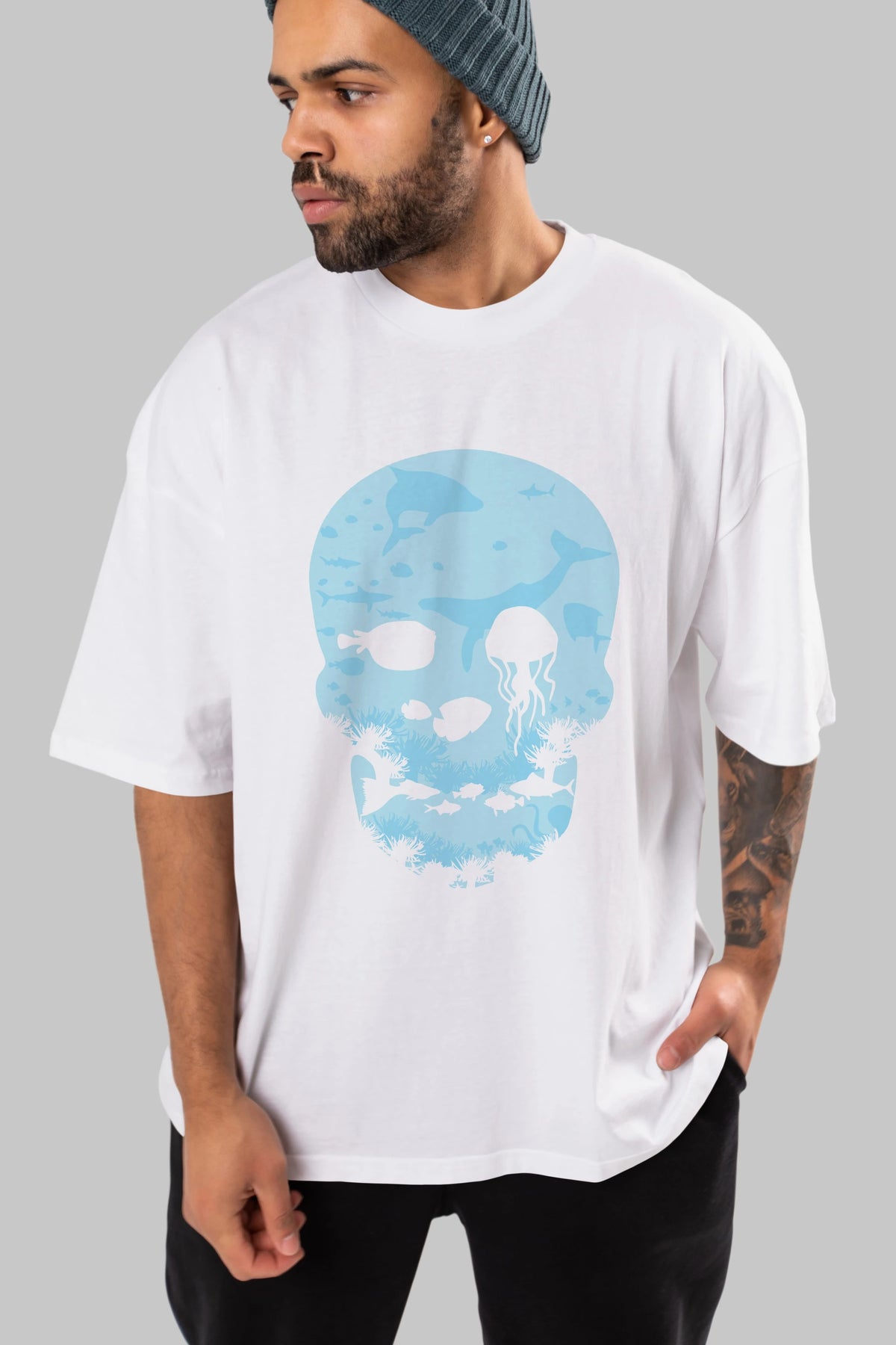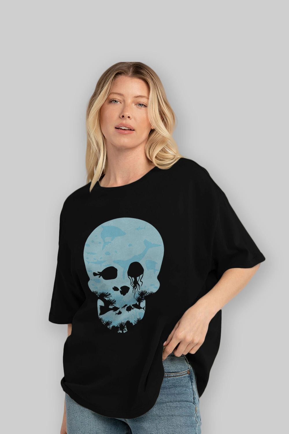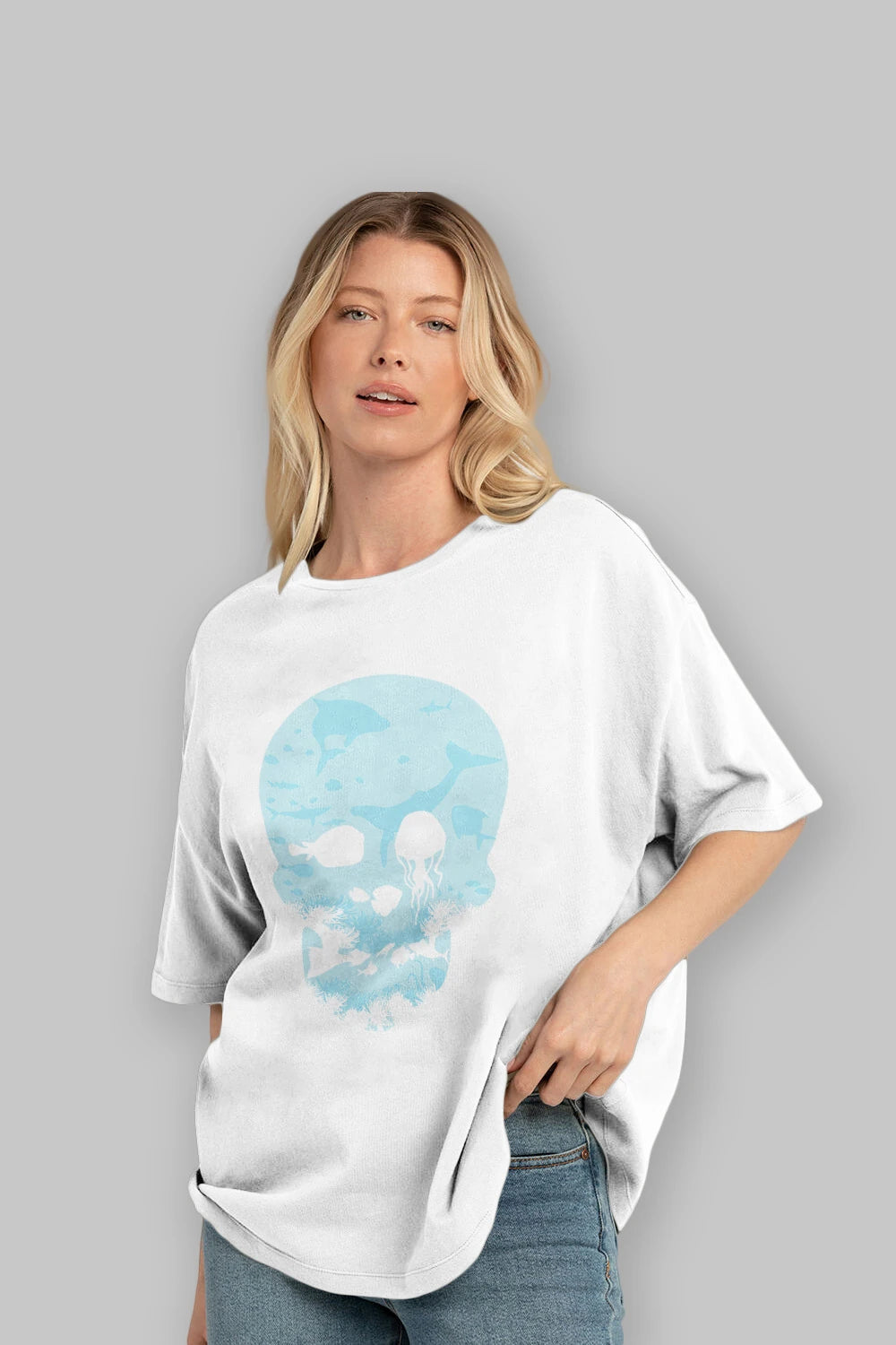 Hem erkekler hem de kadınlar için uygun, taze, modern bir baskıya sahip baskılı oversize t-shirt.