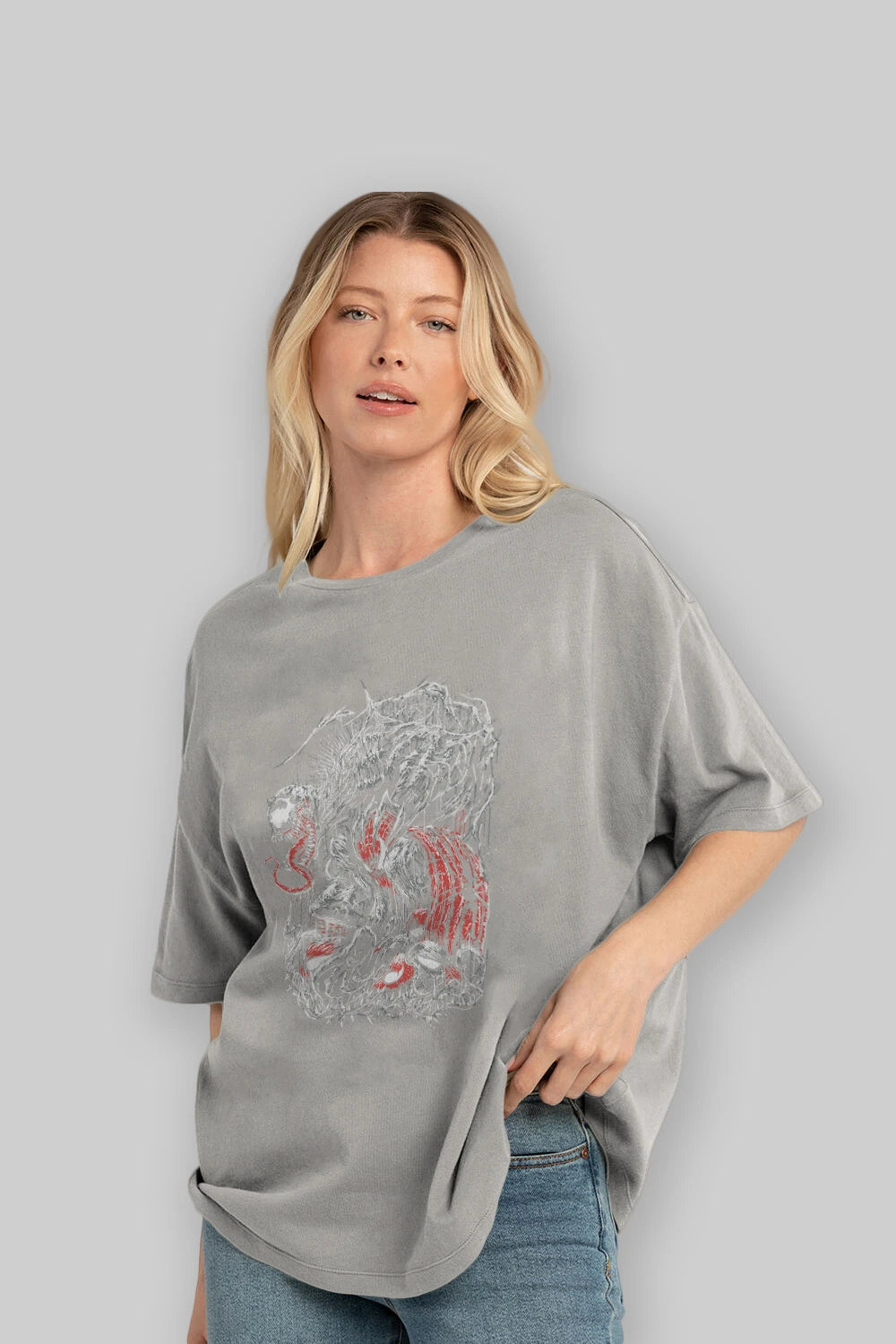 Hem erkekler hem de kadınlar için uygun, taze, modern bir baskıya sahip baskılı oversize t-shirt.