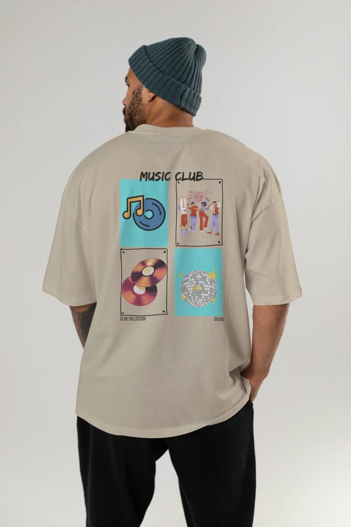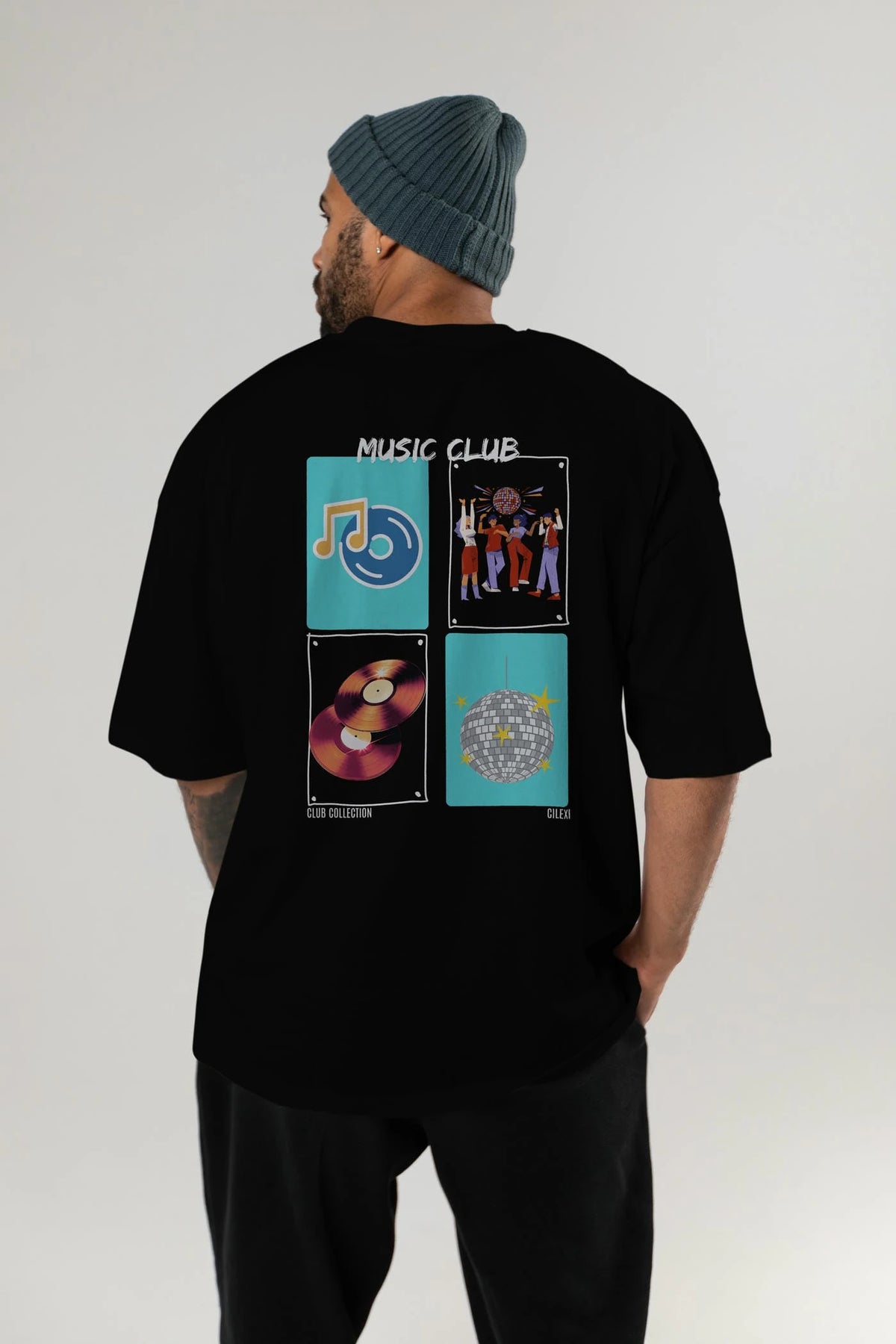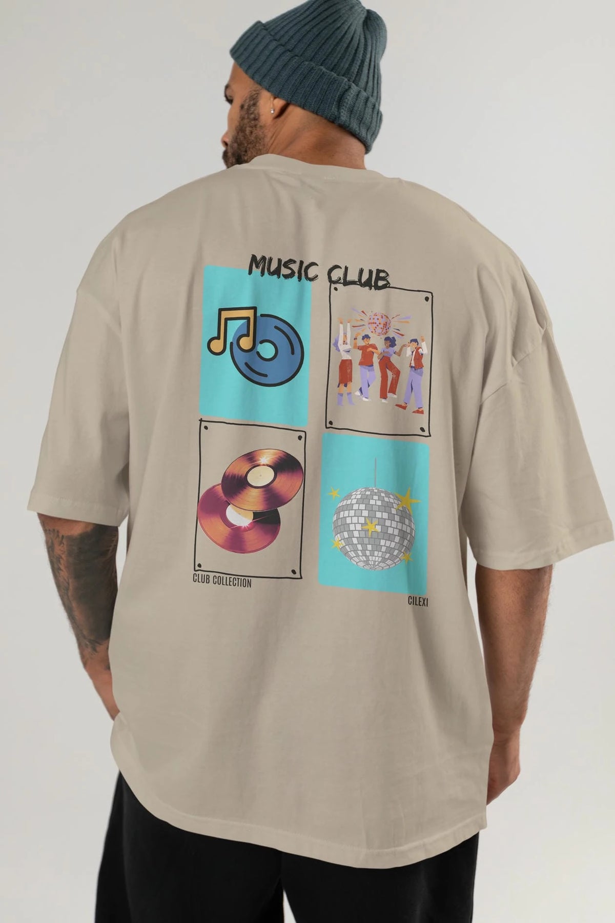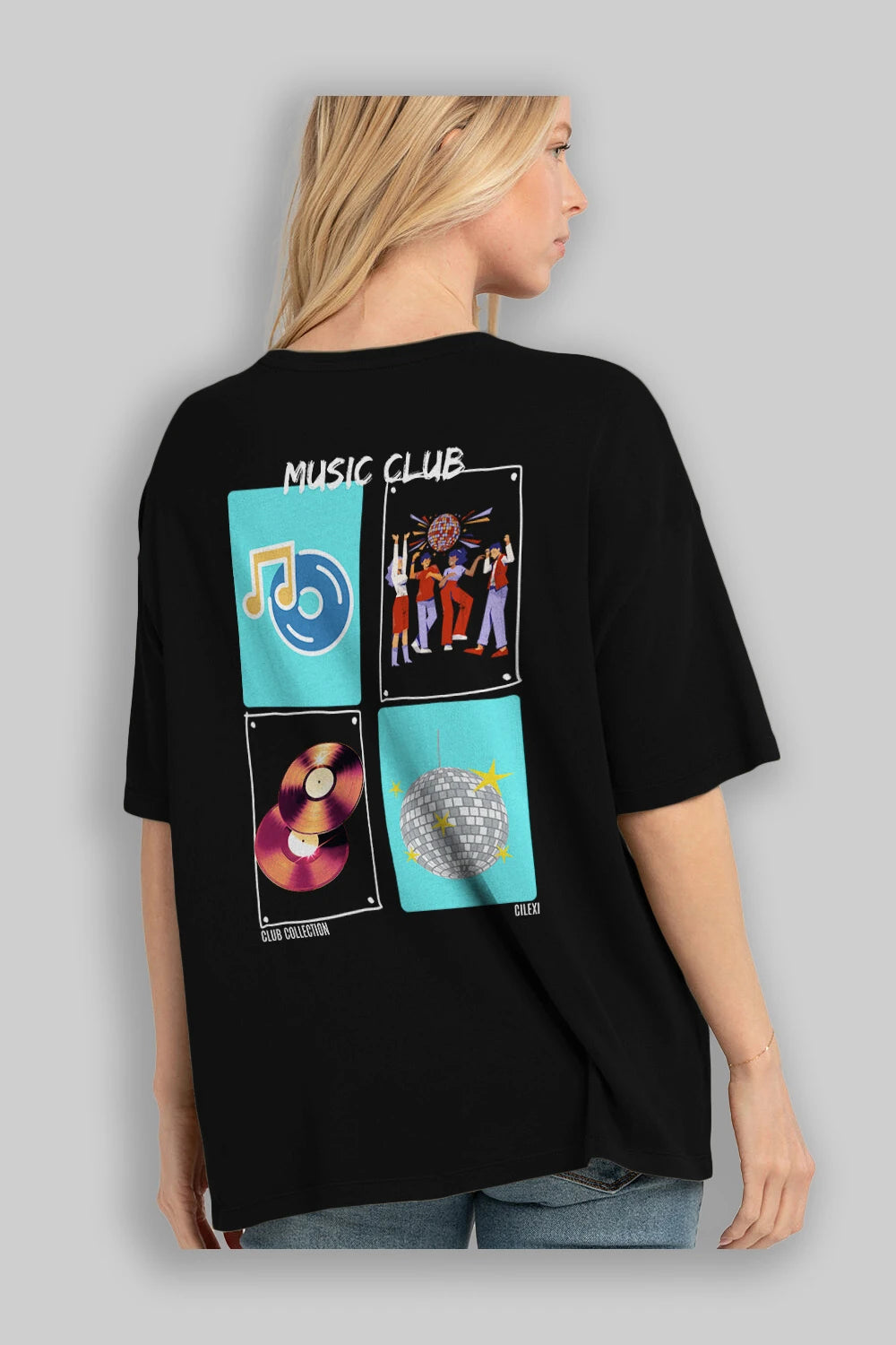 Music Club Arka Baskılı Oversize t-shirt Erkek Kadın %100 Pamuk Bisiklet Yaka tişort
