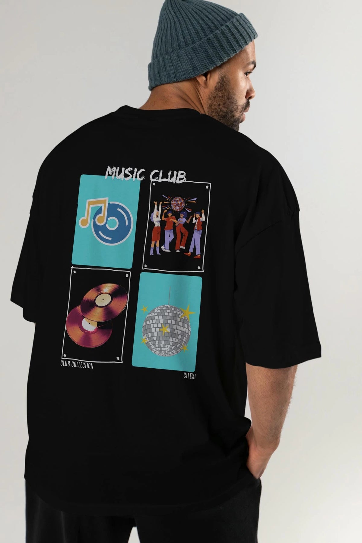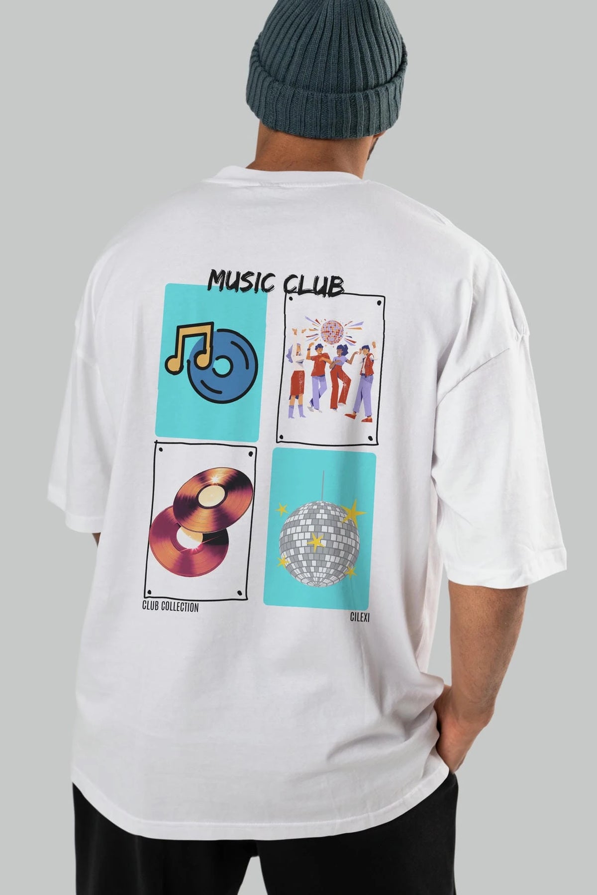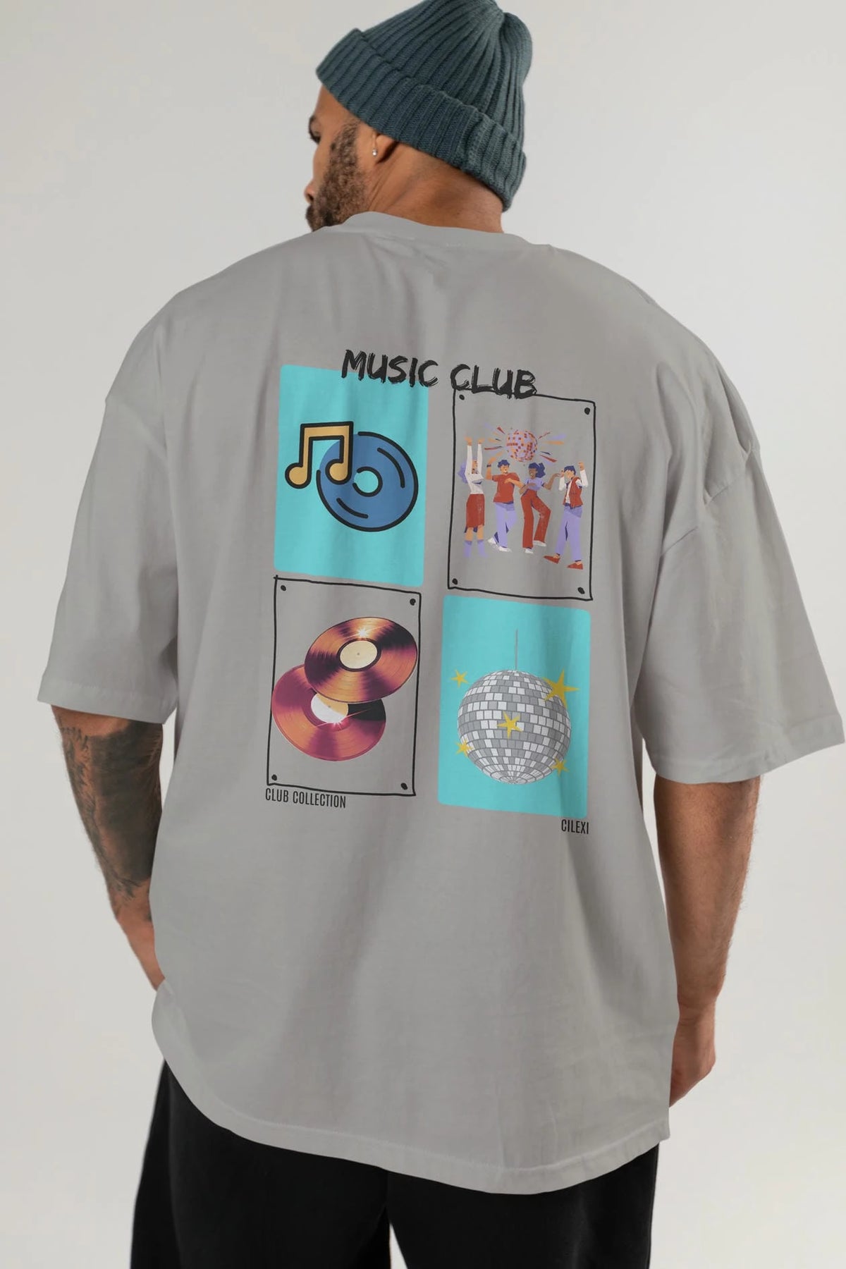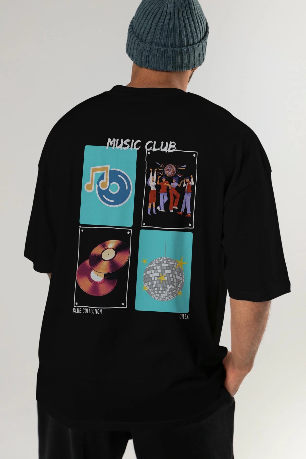 Music Club Arka Baskılı Oversize t-shirt Erkek Kadın %100 Pamuk Bisiklet Yaka tişort