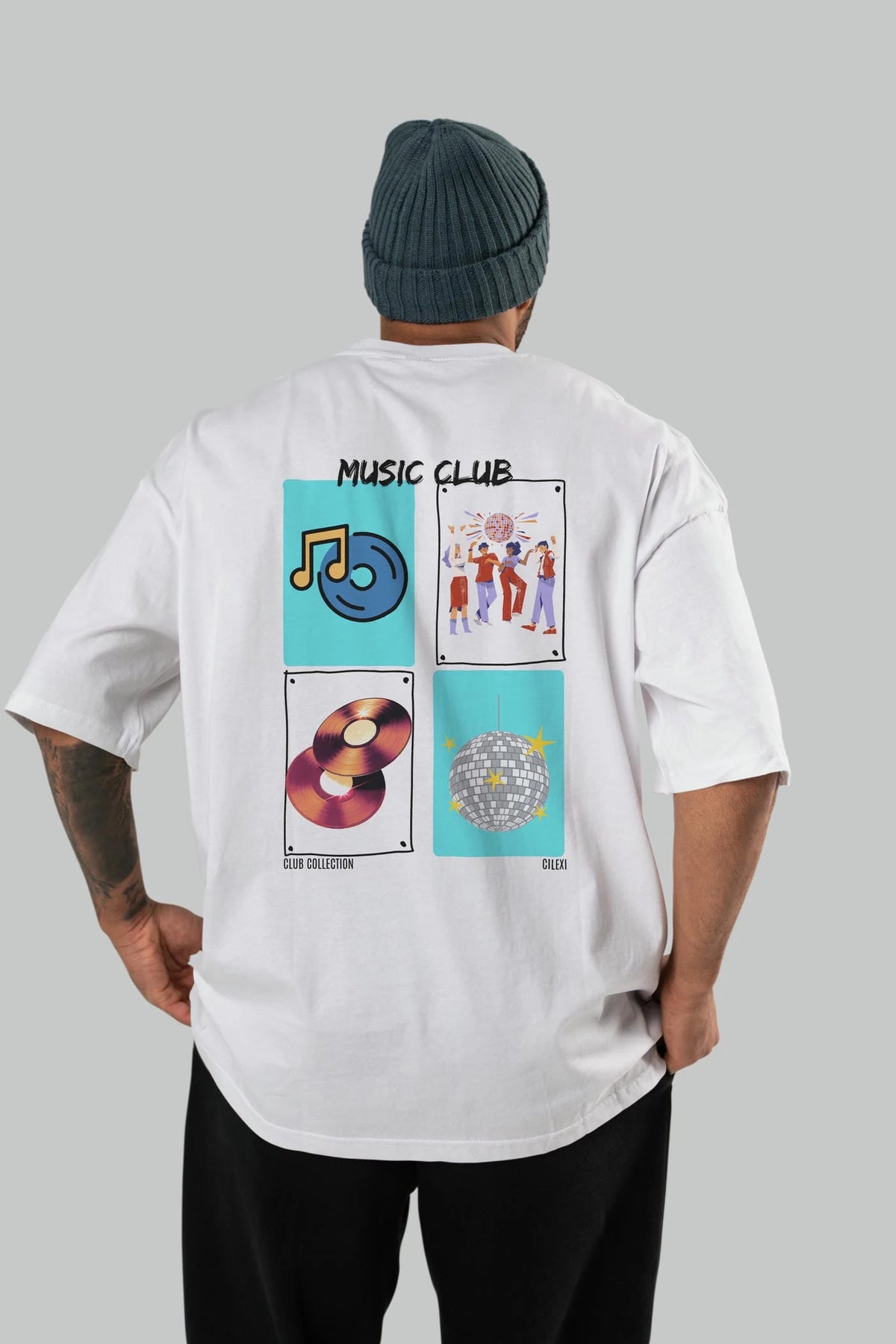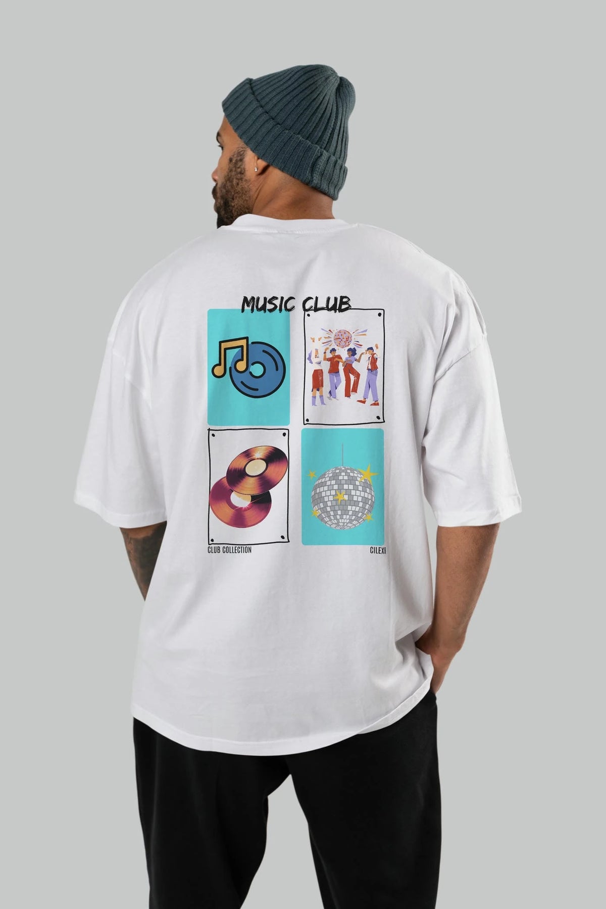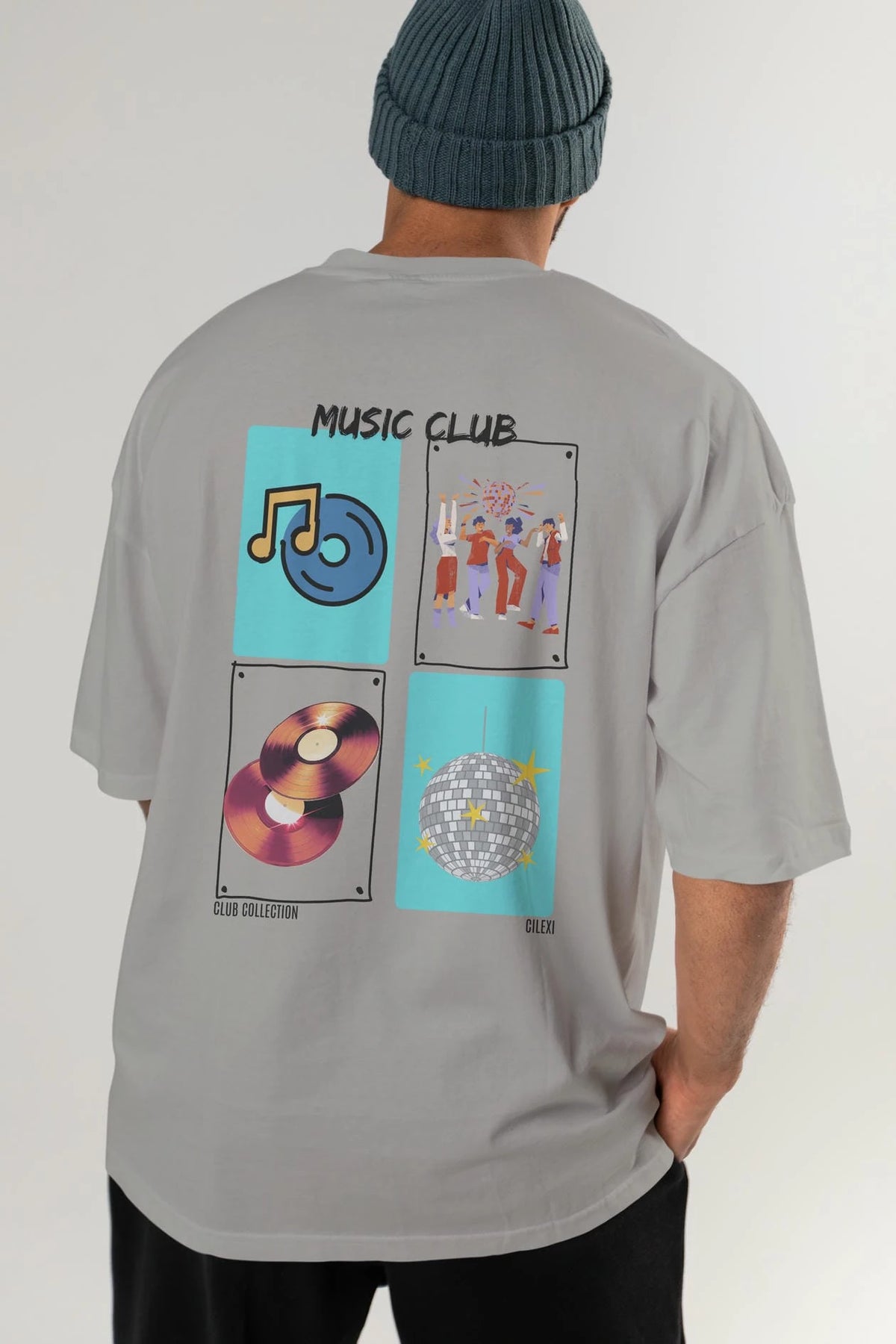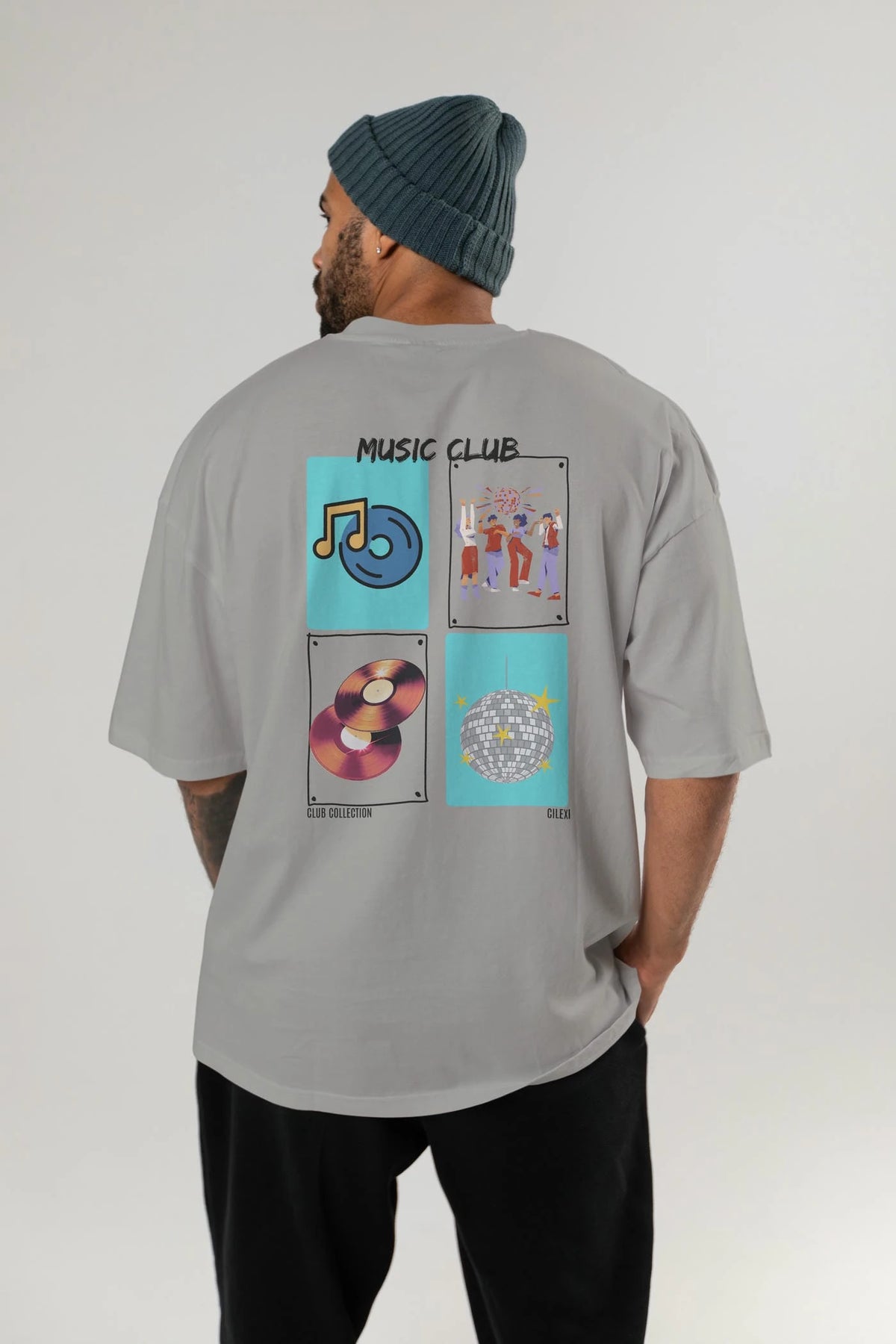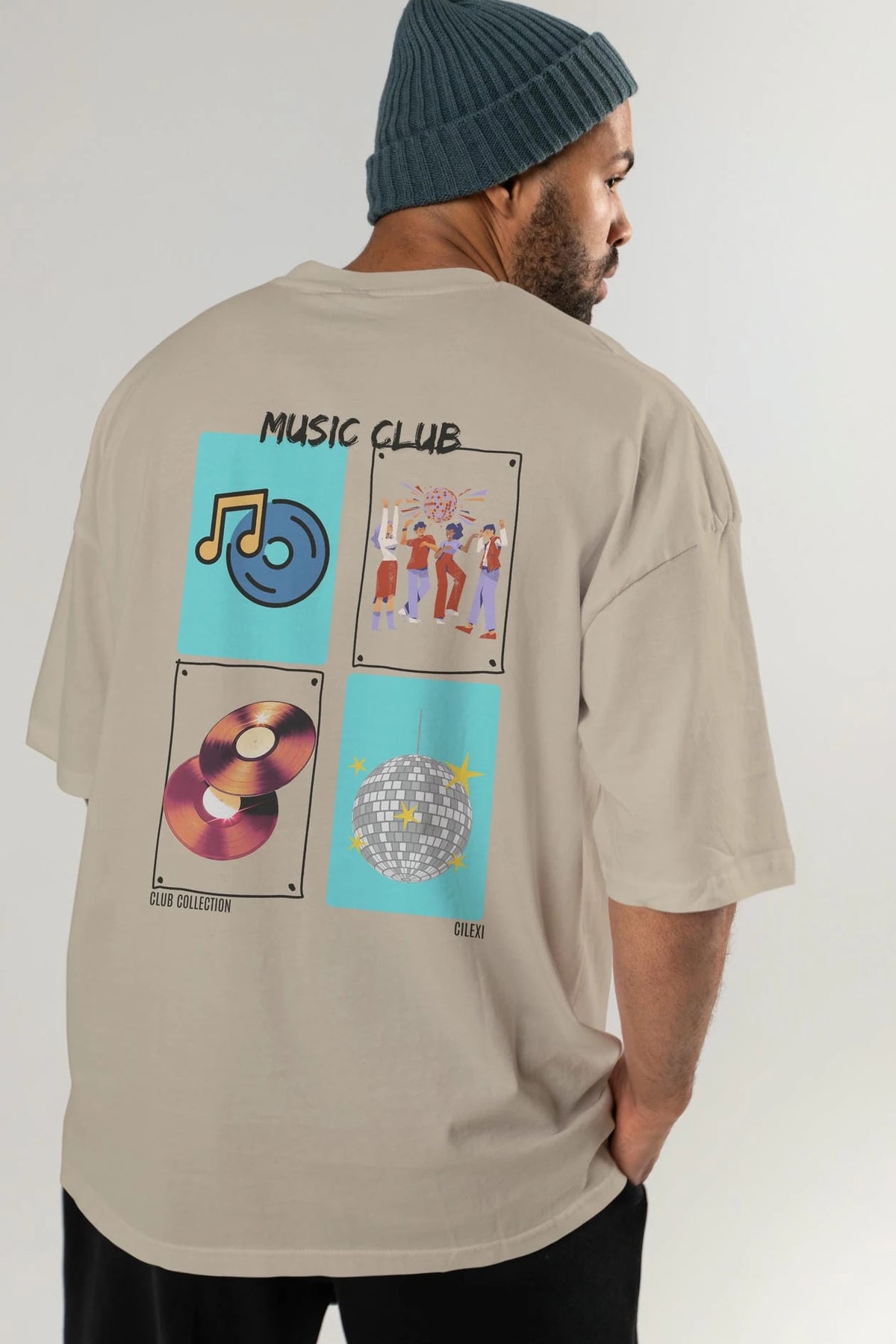 Music Club Arka Baskılı Oversize t-shirt Erkek Kadın %100 Pamuk Bisiklet Yaka tişort