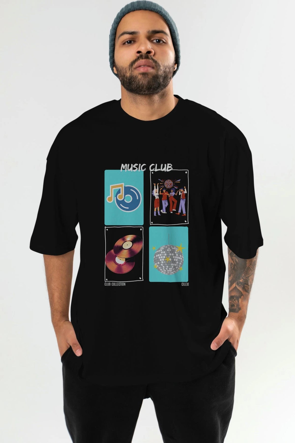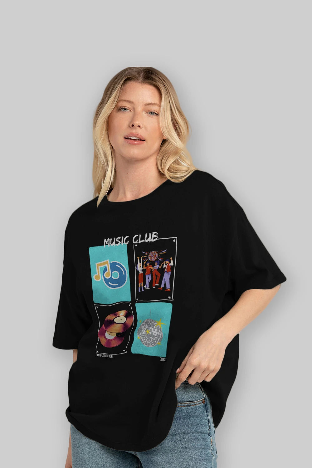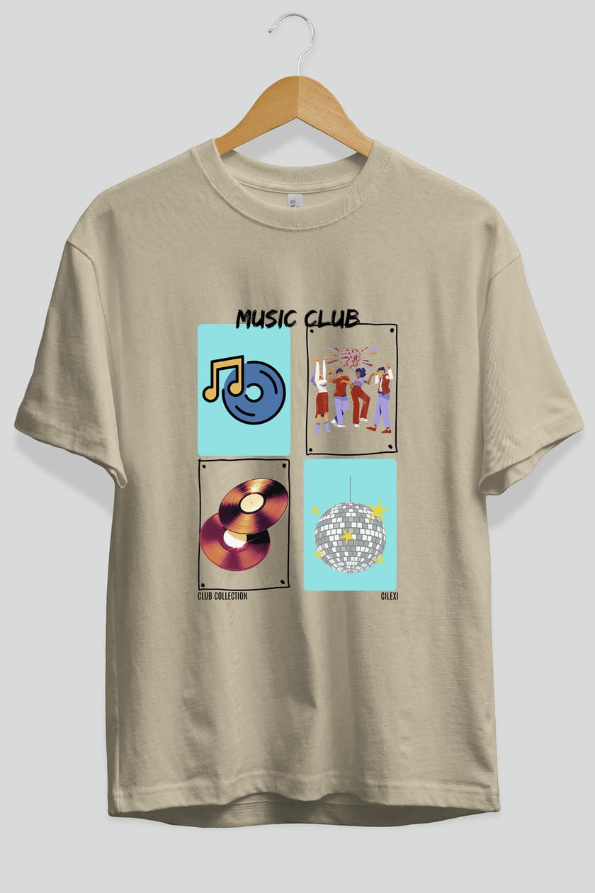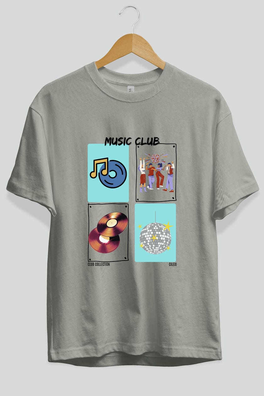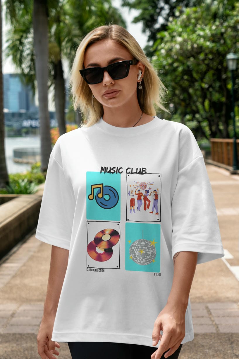 Music Club ön Baskılı Oversize t-shirt Erkek Kadın %100 Pamuk Bisiklet Yaka tişort