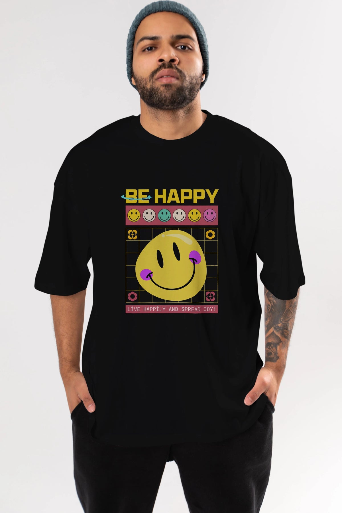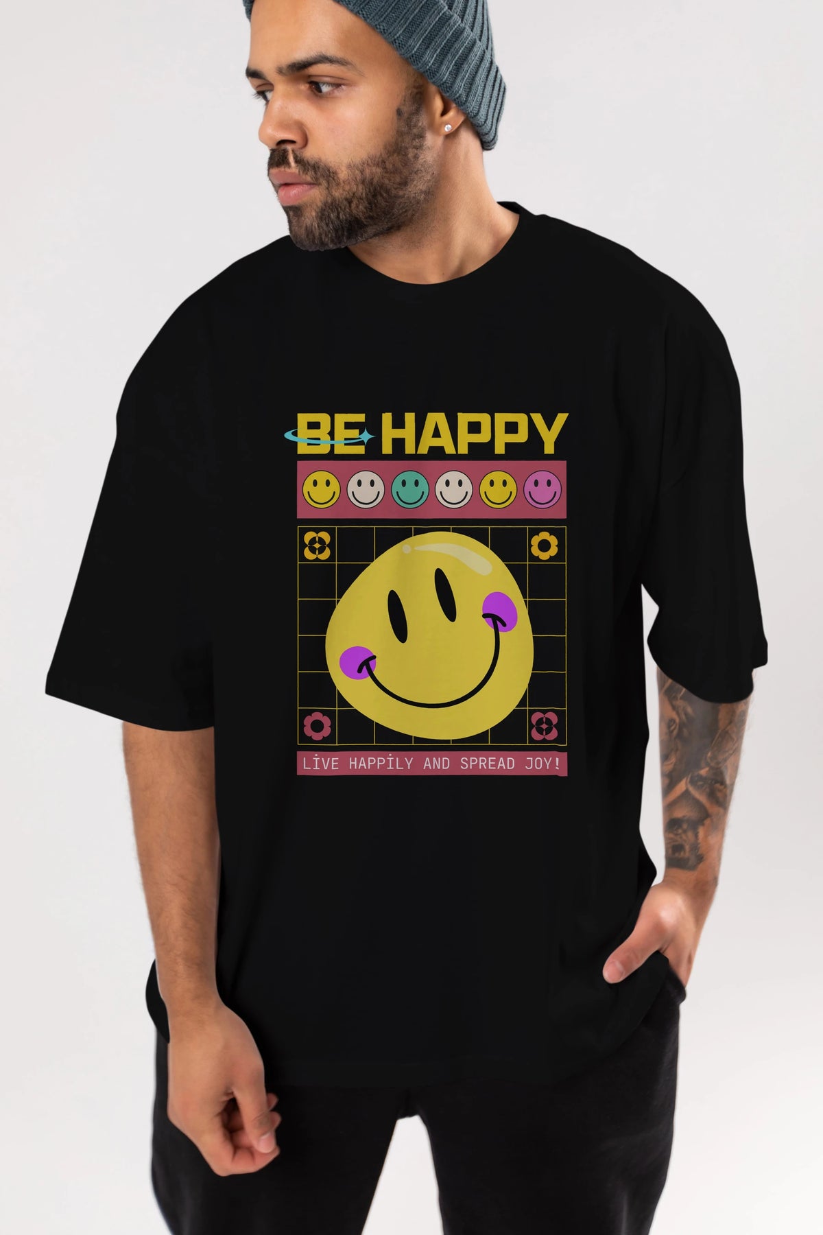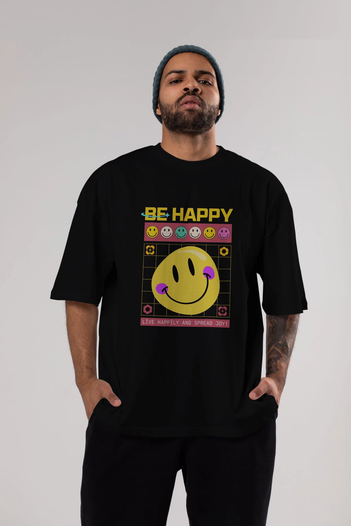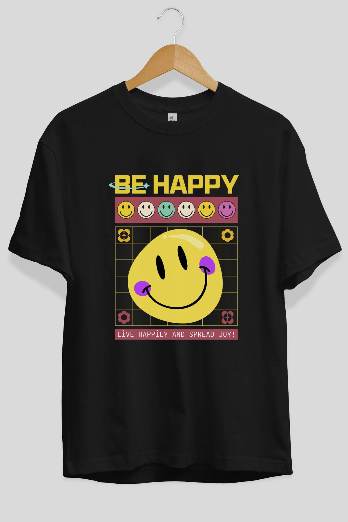 Be Happy Yazılı Ön Baskılı Oversize t-shirt Erkek Kadın Unisex