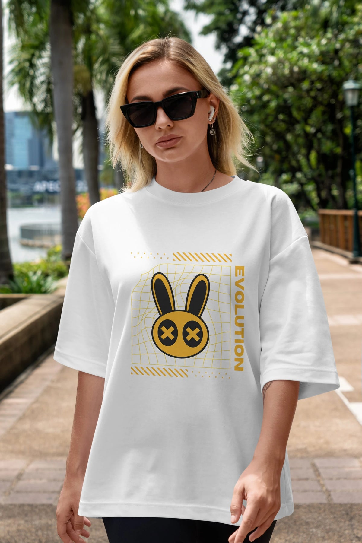 Hem erkekler hem de kadınlar için uygun, taze, modern bir baskıya sahip baskılı oversize t-shirt.