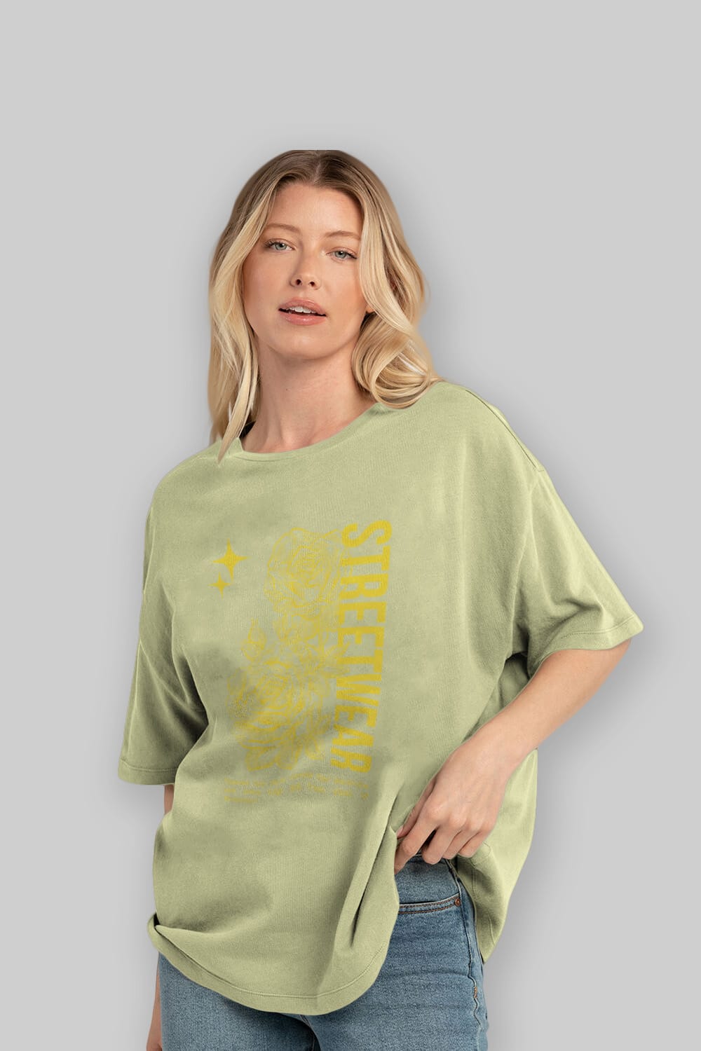 Hem erkekler hem de kadınlar için uygun, taze, modern bir baskıya sahip baskılı oversize t-shirt.