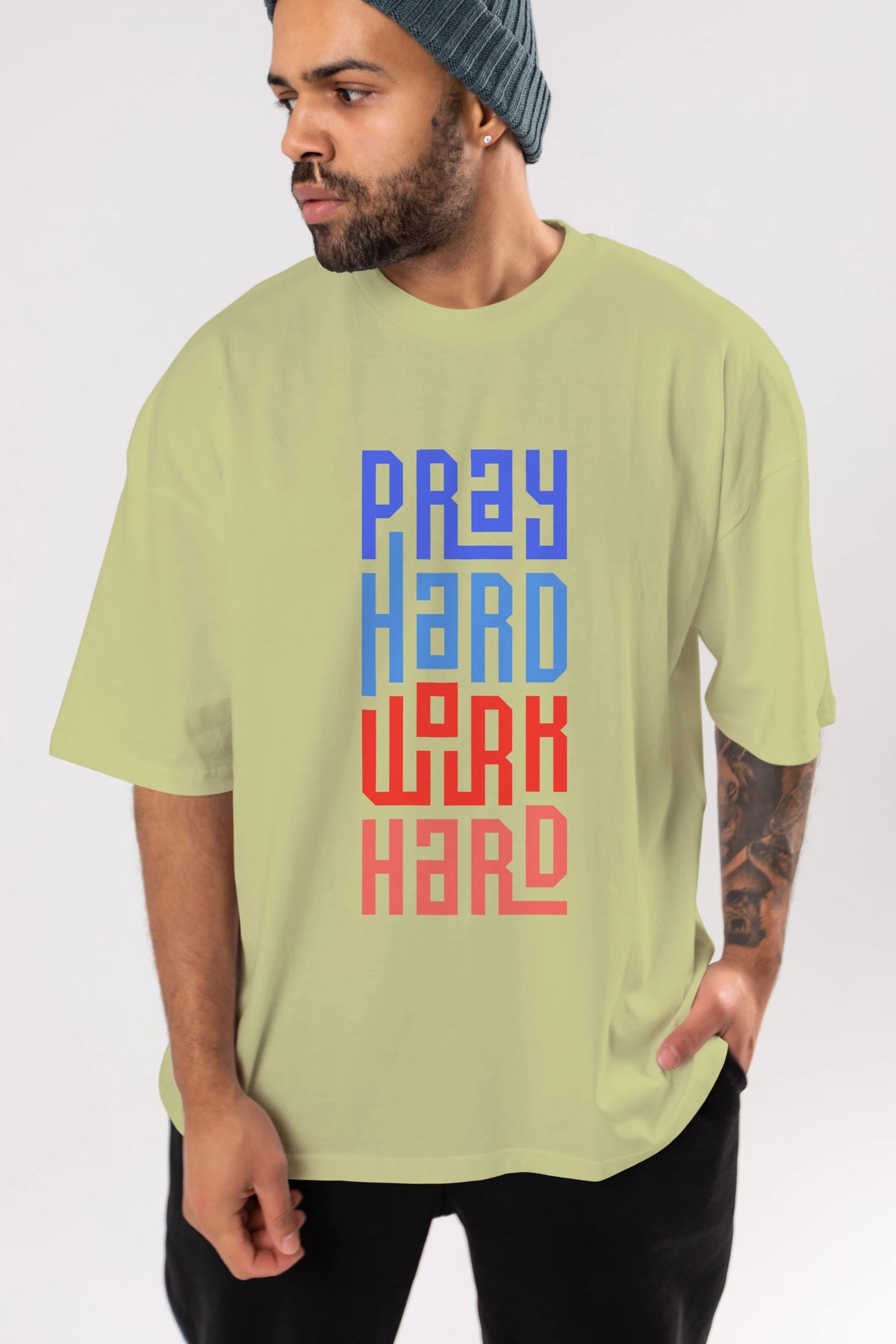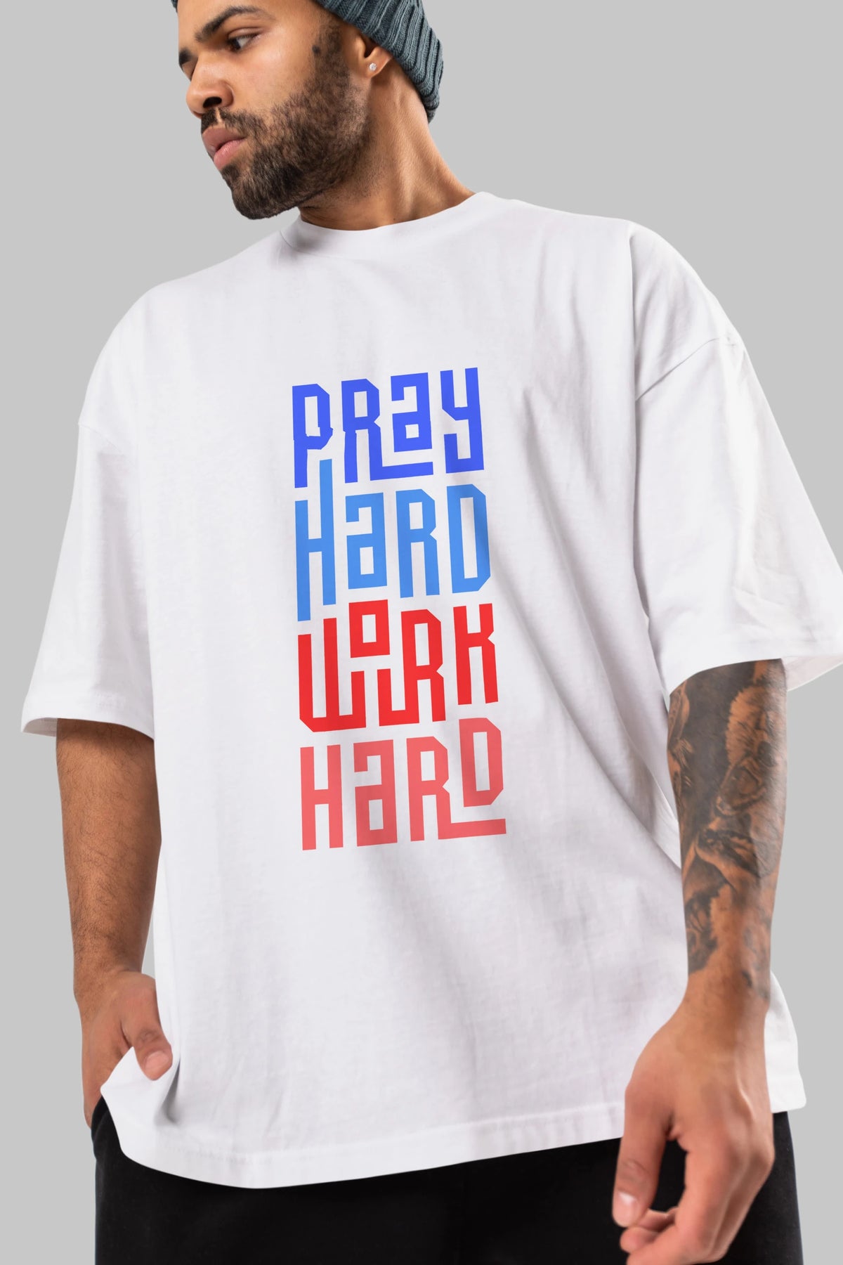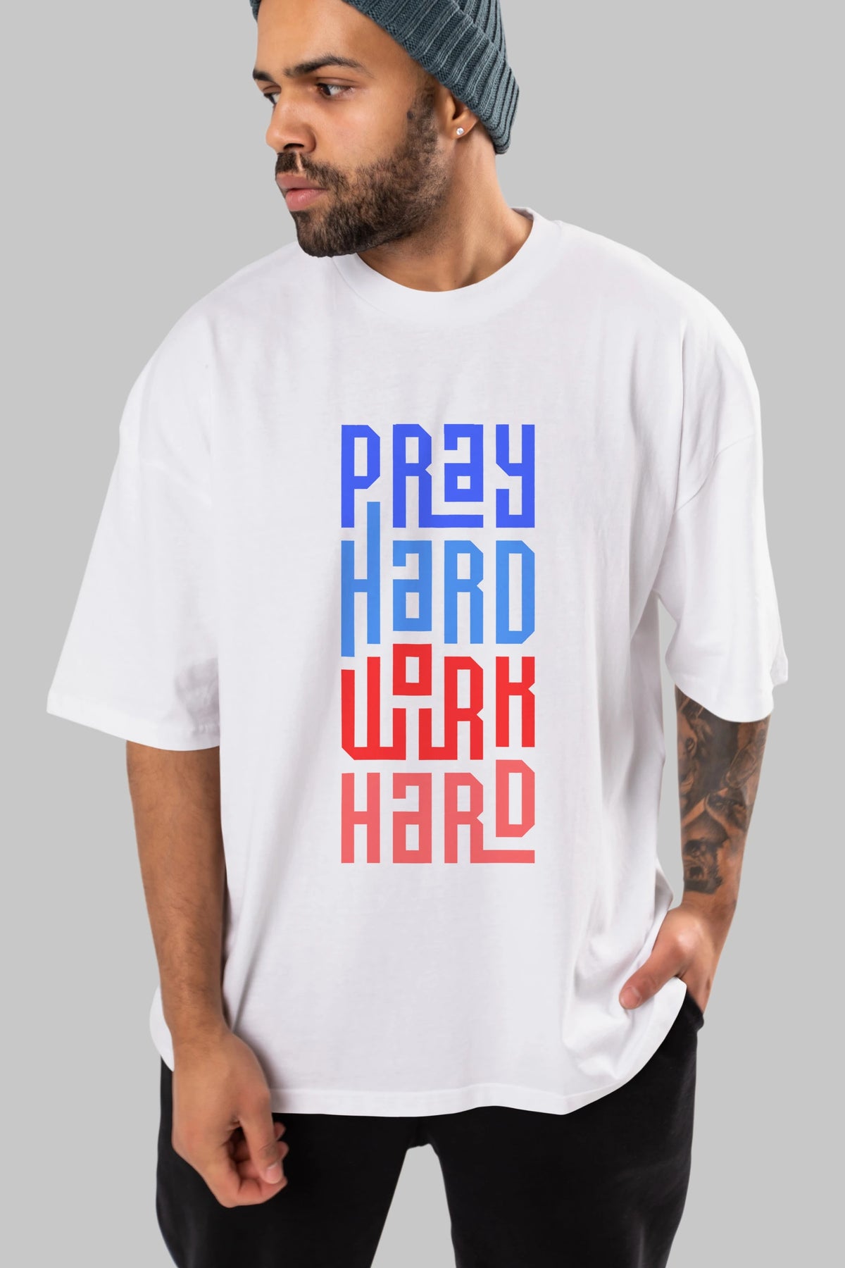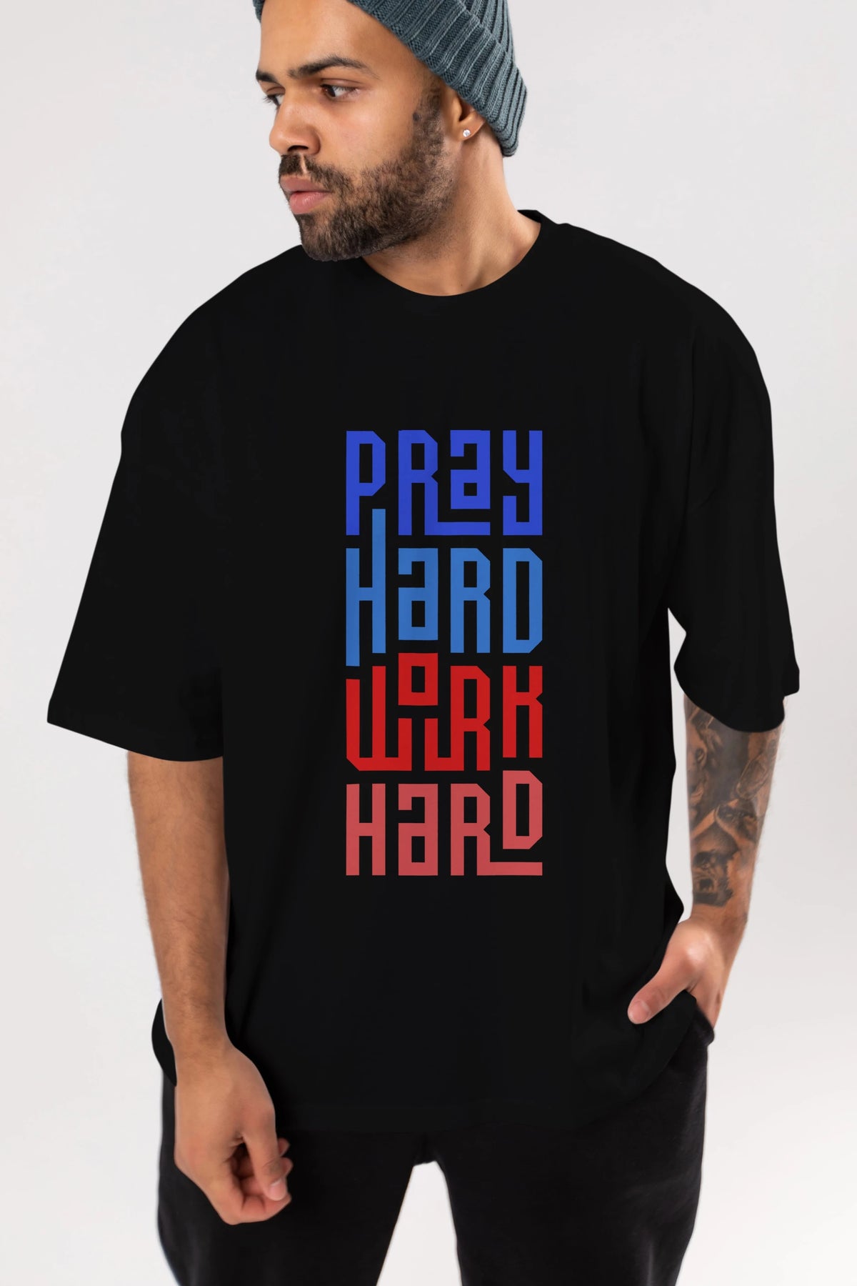 Pray Hard Work Hard Yazılı Ön Baskılı Oversize t-shirt Erkek Kadın Unisex