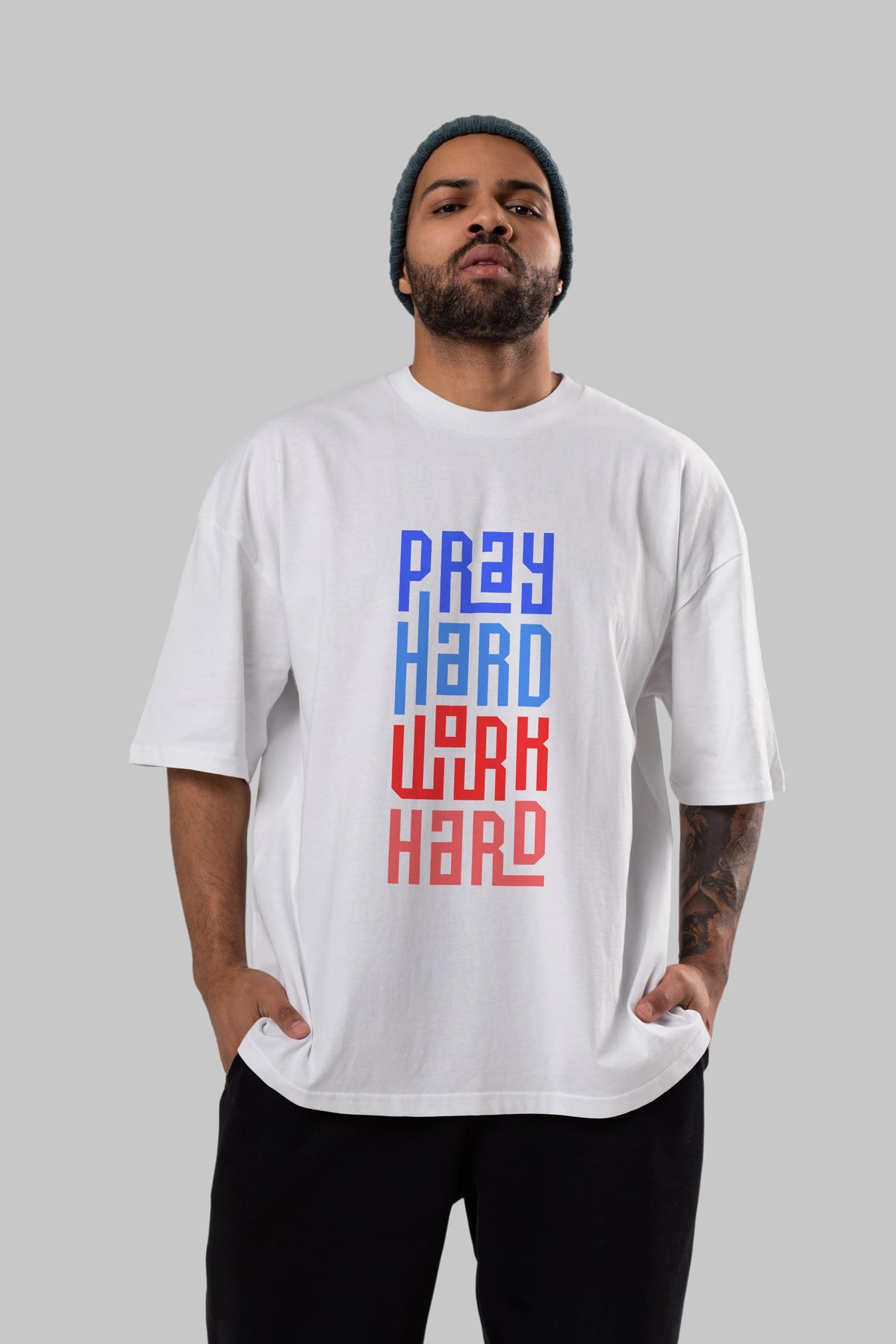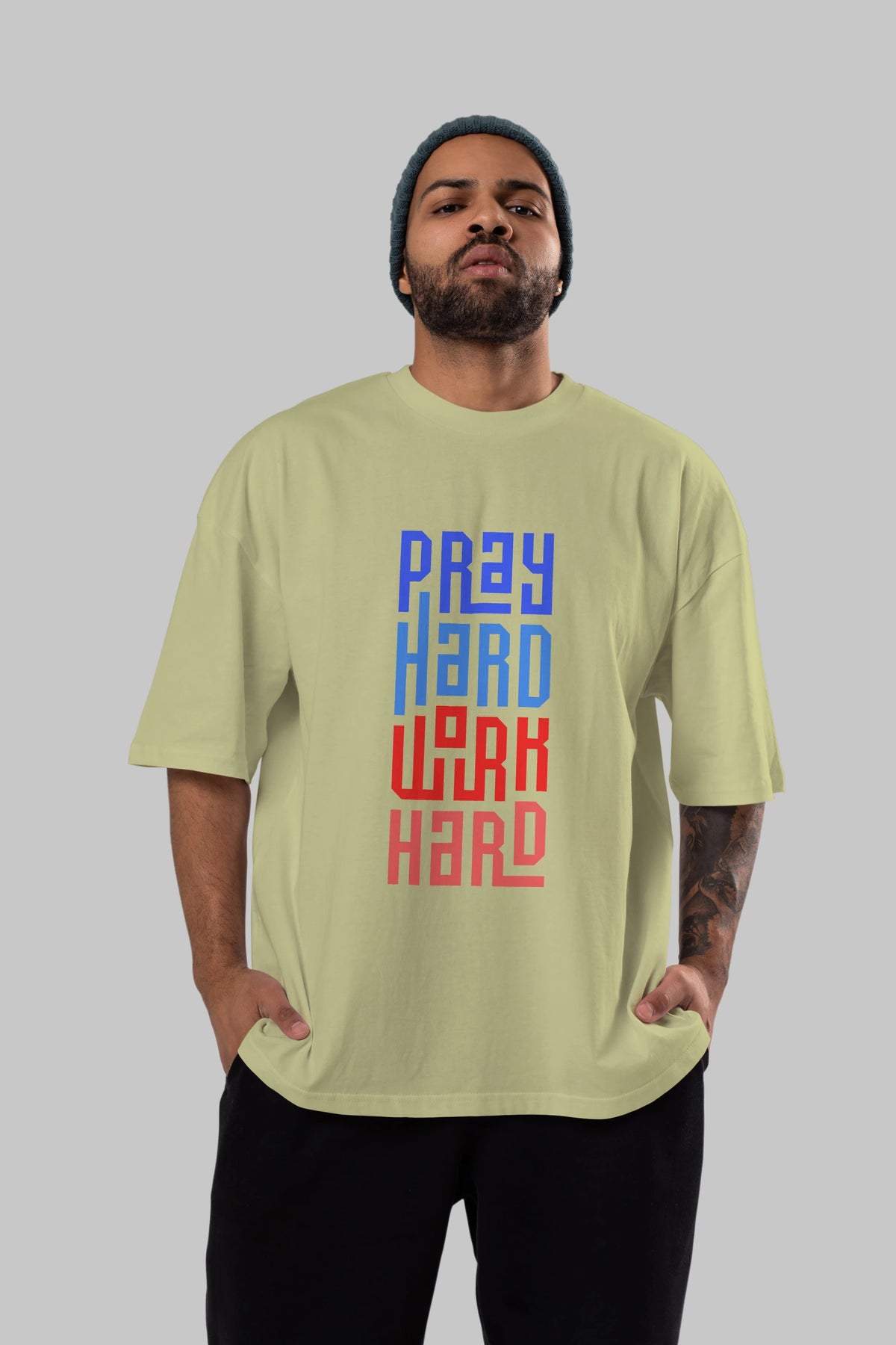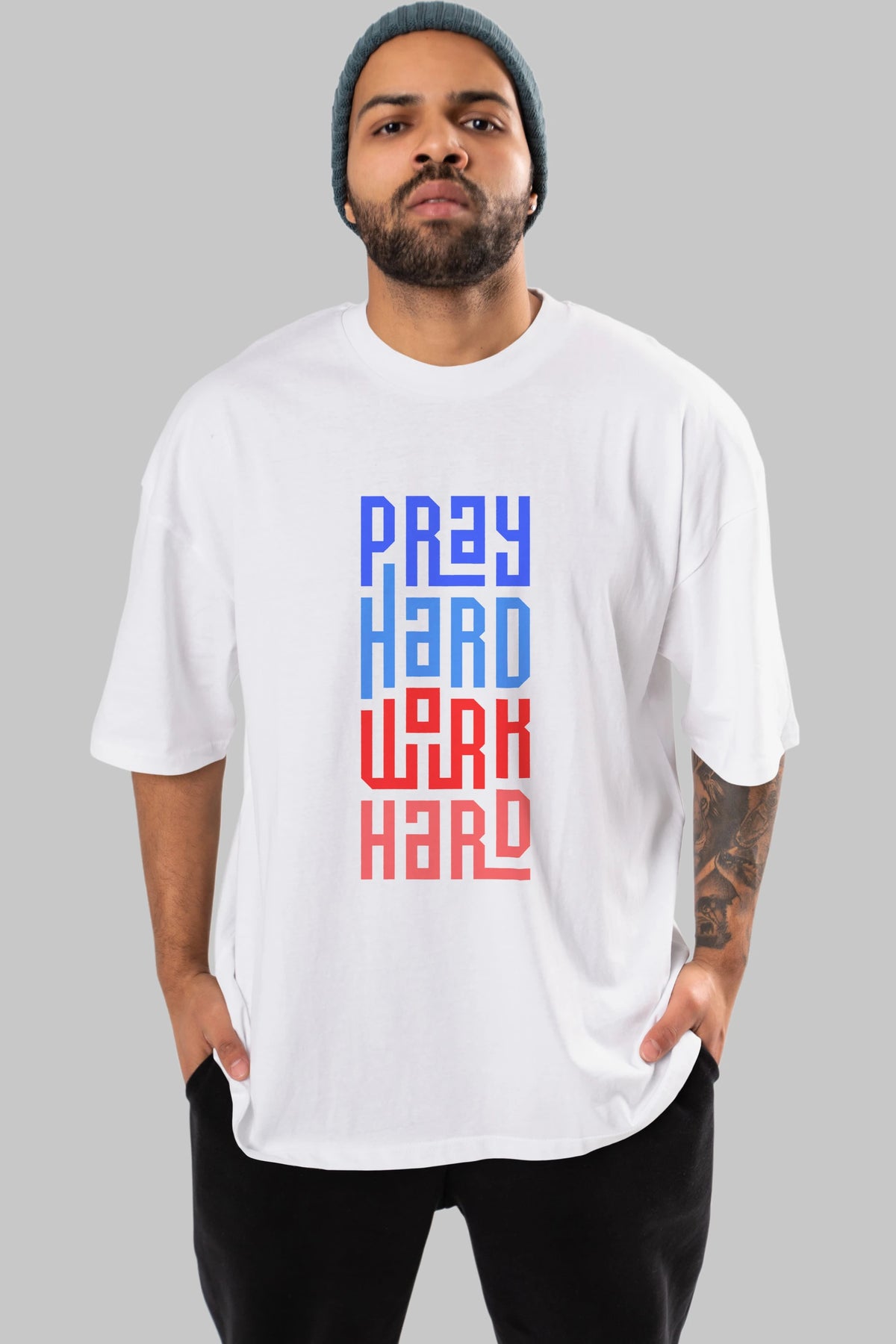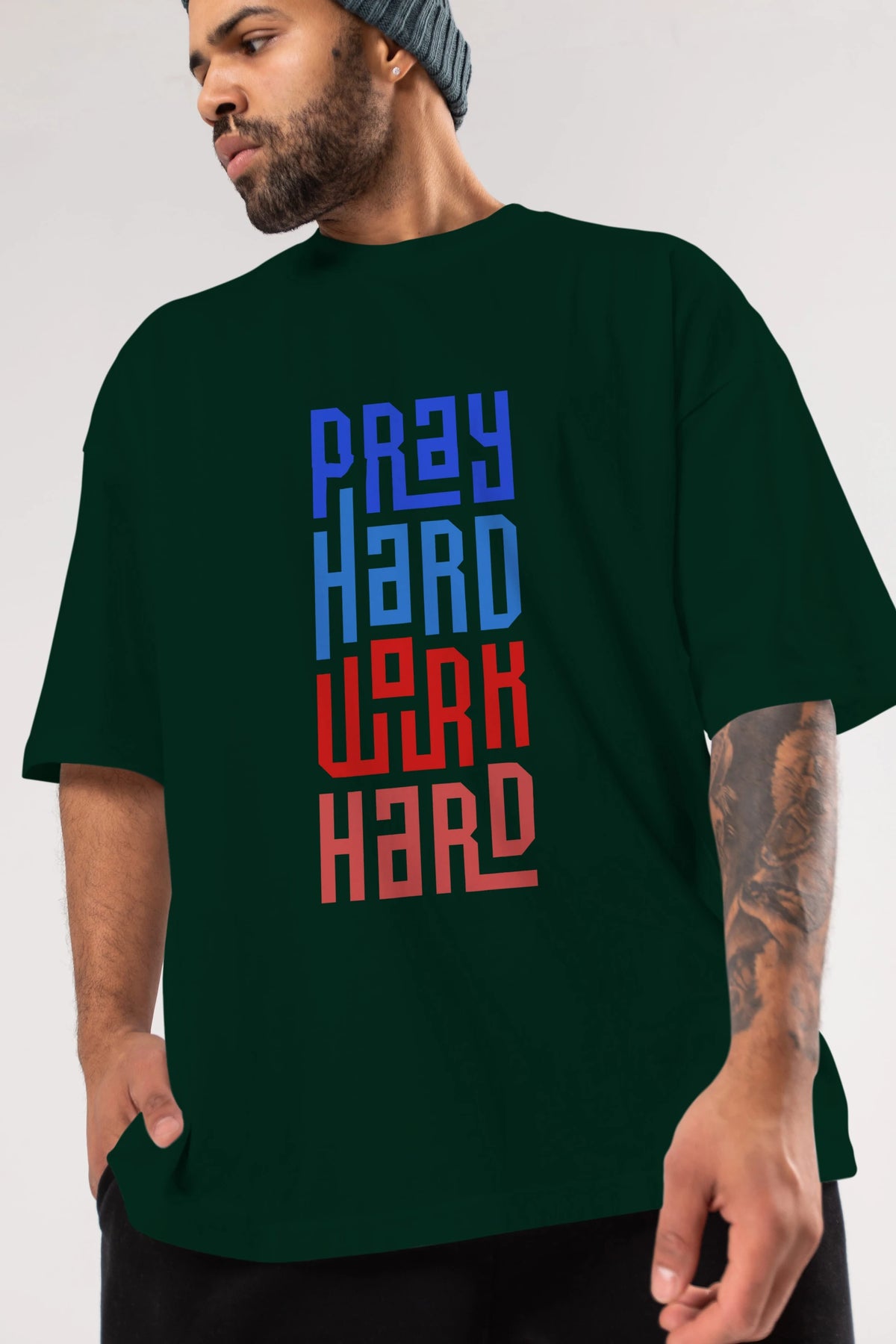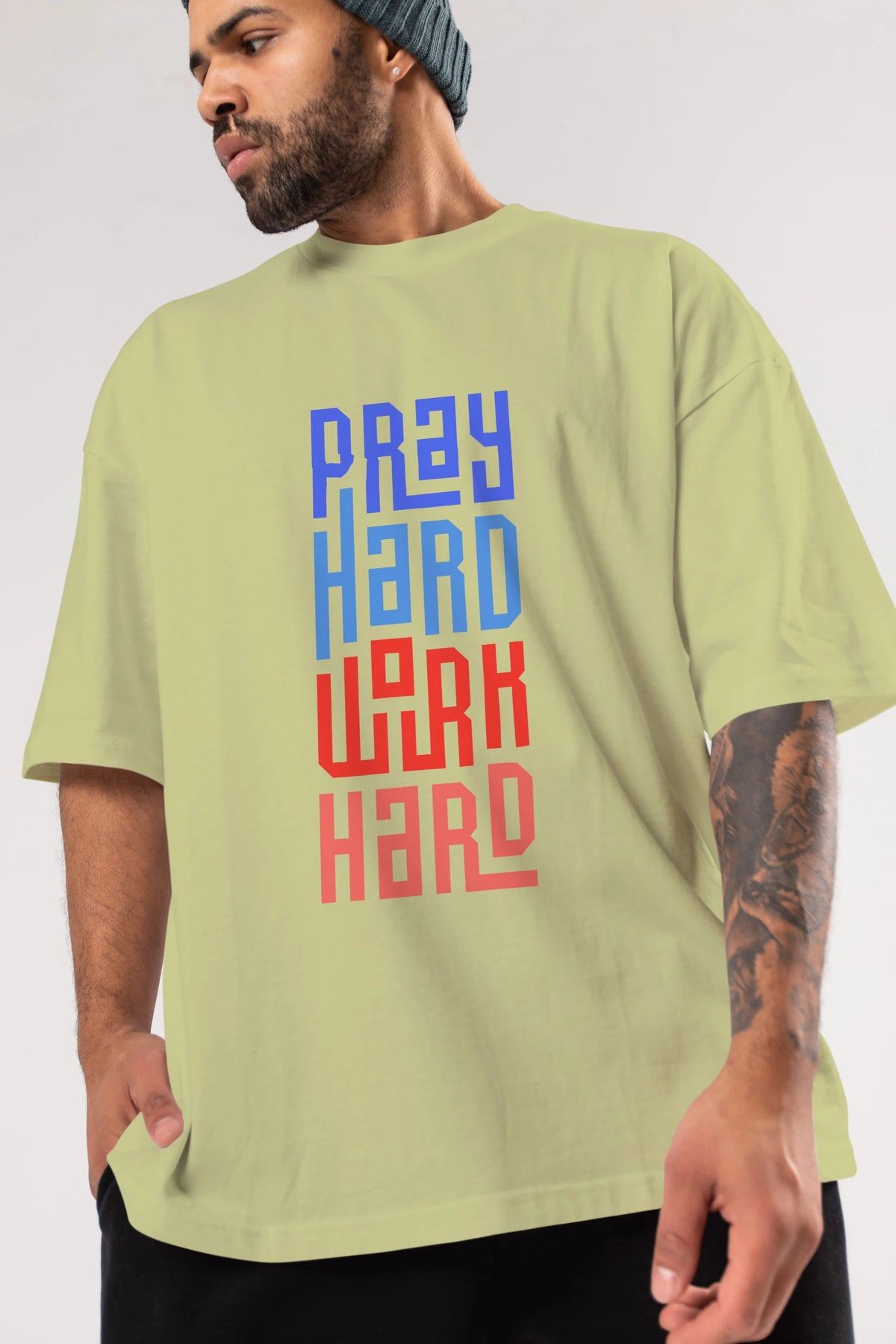 Pray Hard Work Hard Yazılı Ön Baskılı Oversize t-shirt Erkek Kadın Unisex