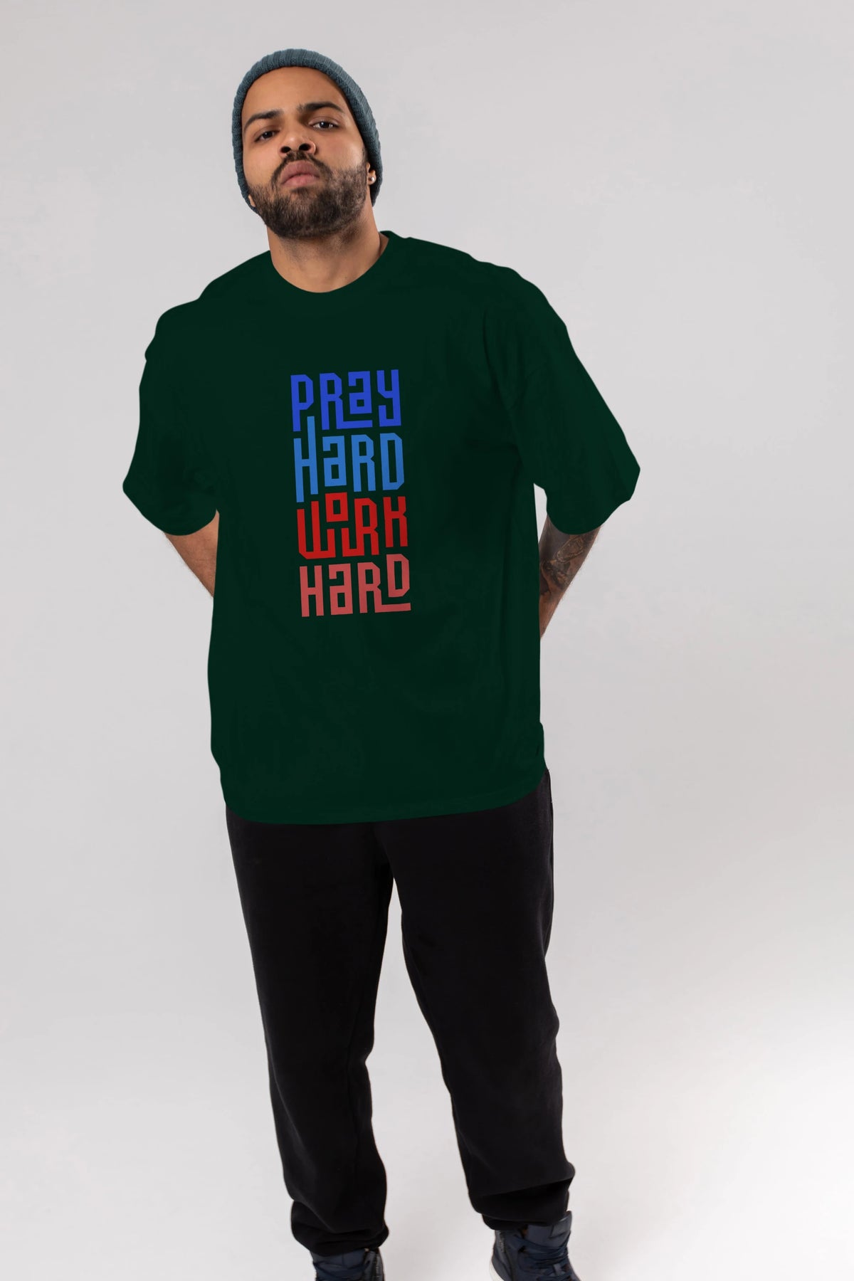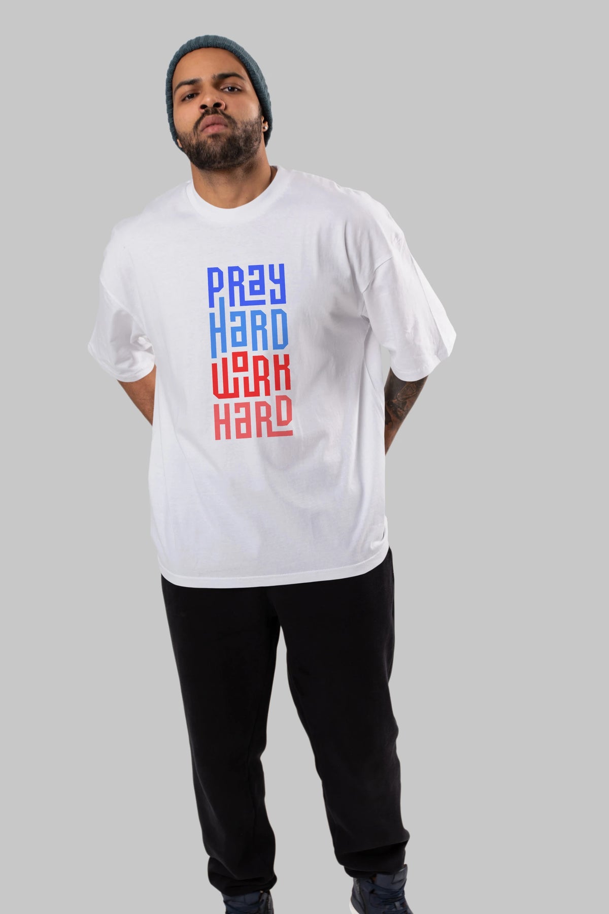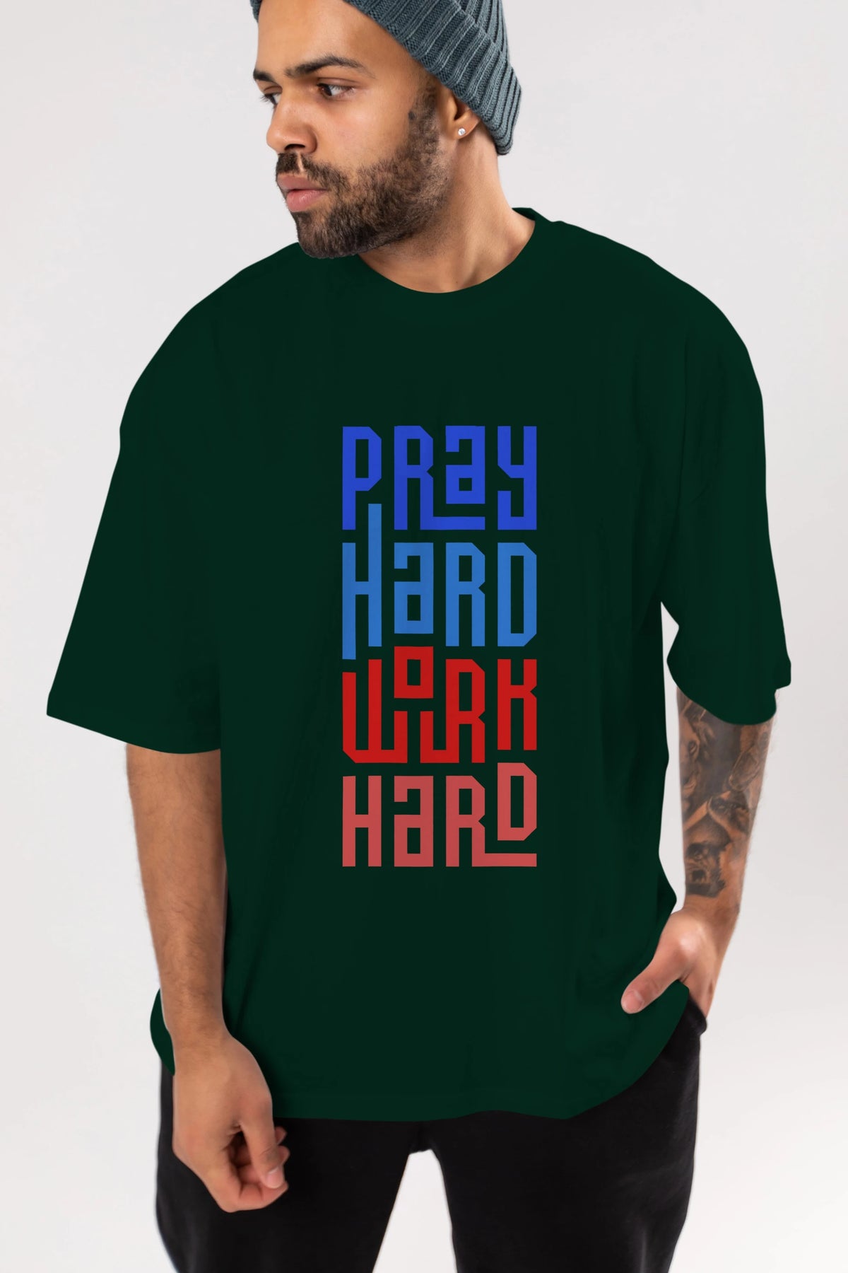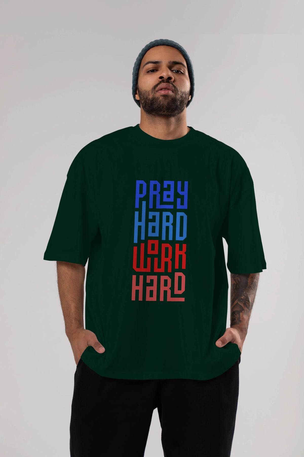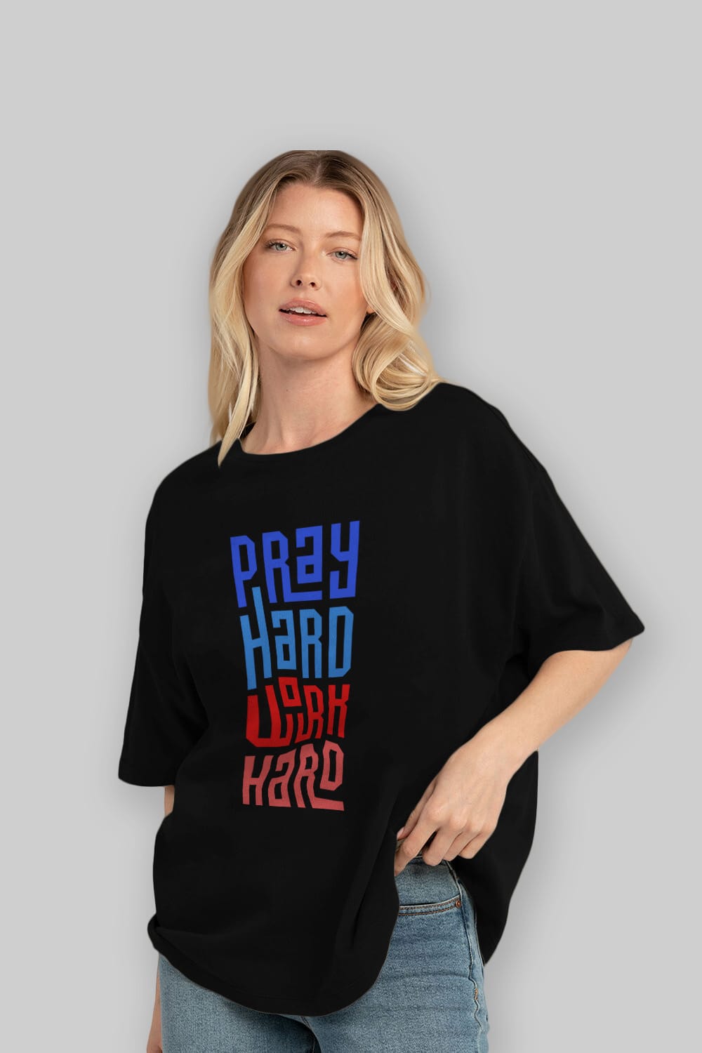 Pray Hard Work Hard Yazılı Ön Baskılı Oversize t-shirt Erkek Kadın Unisex