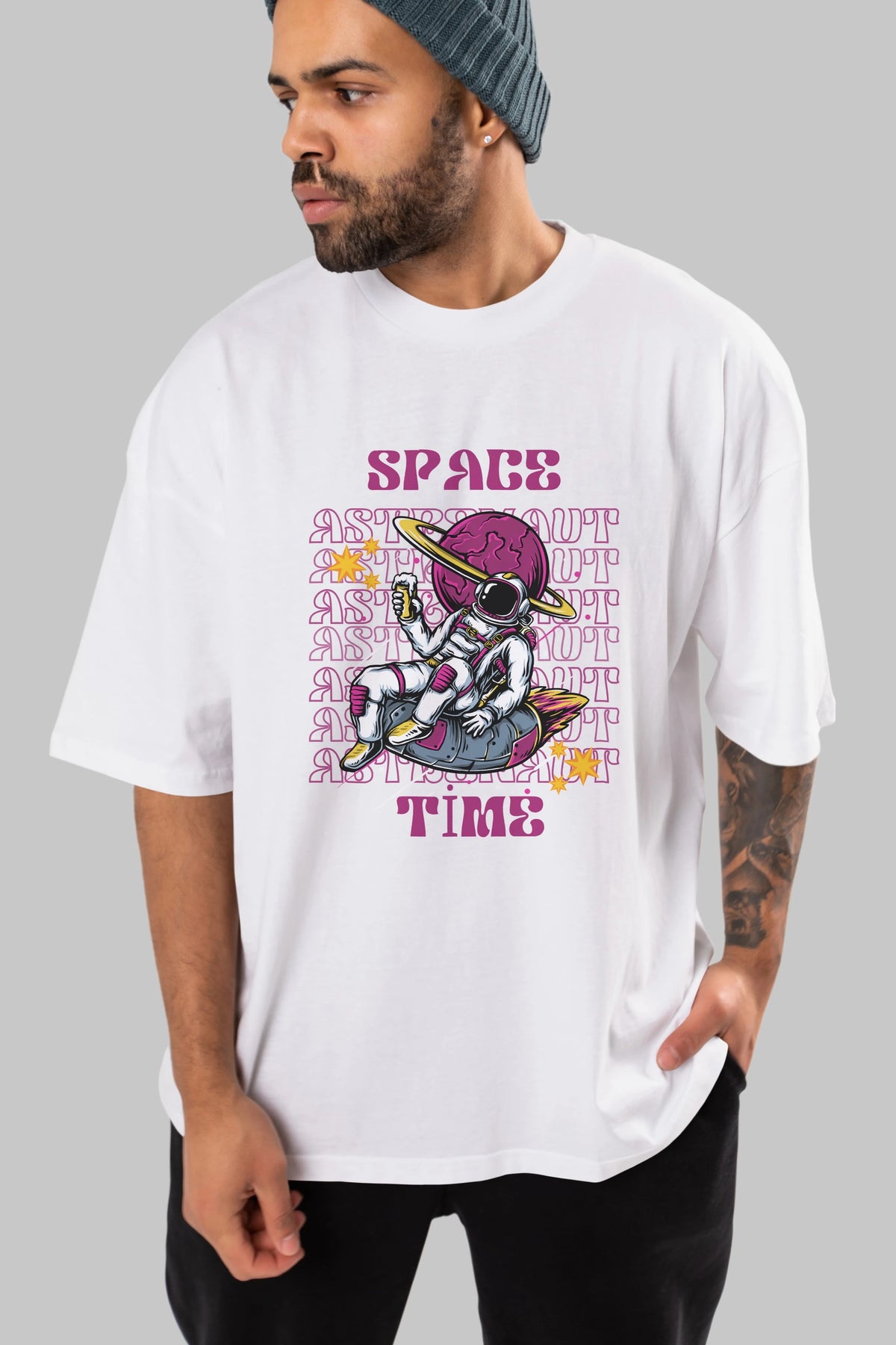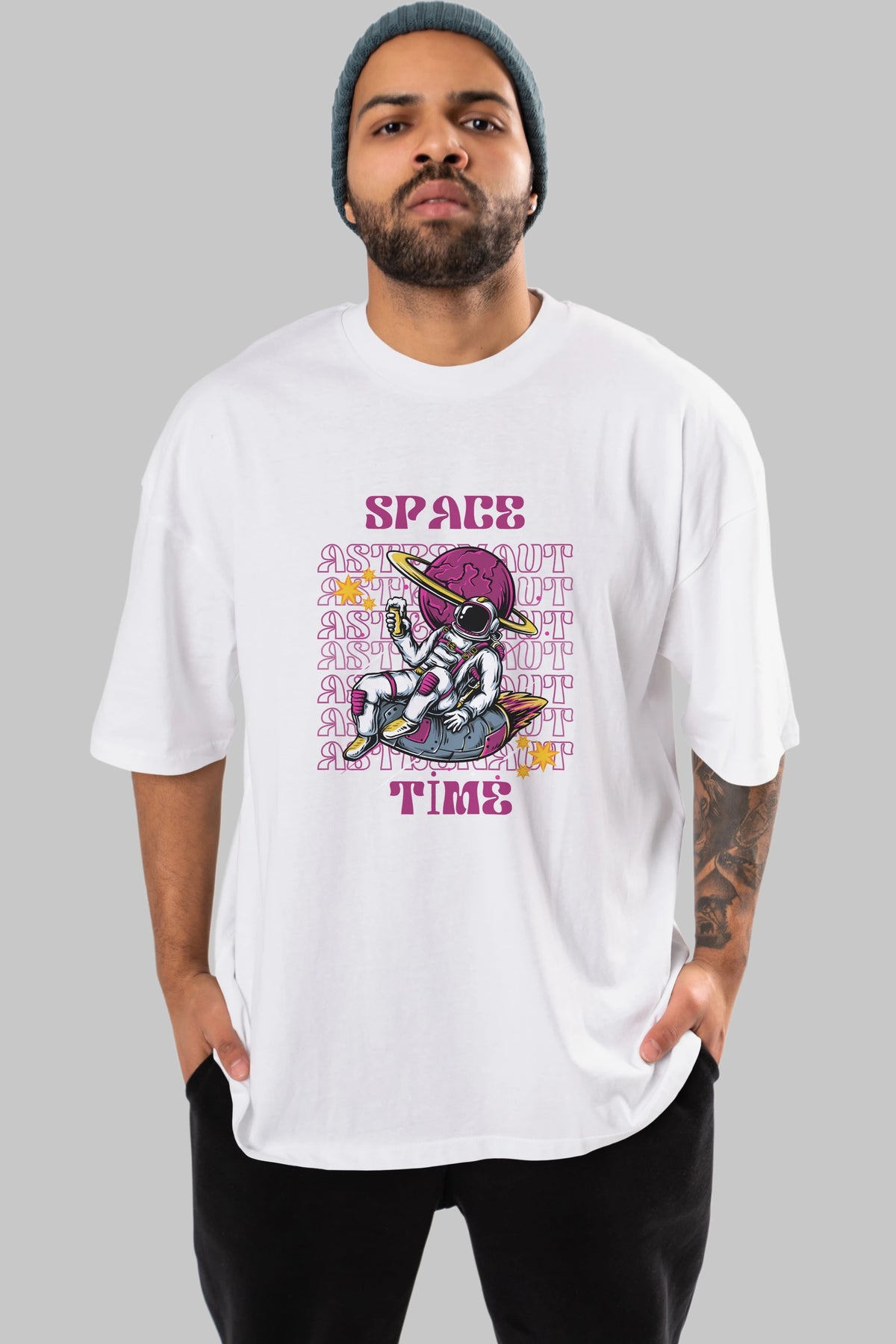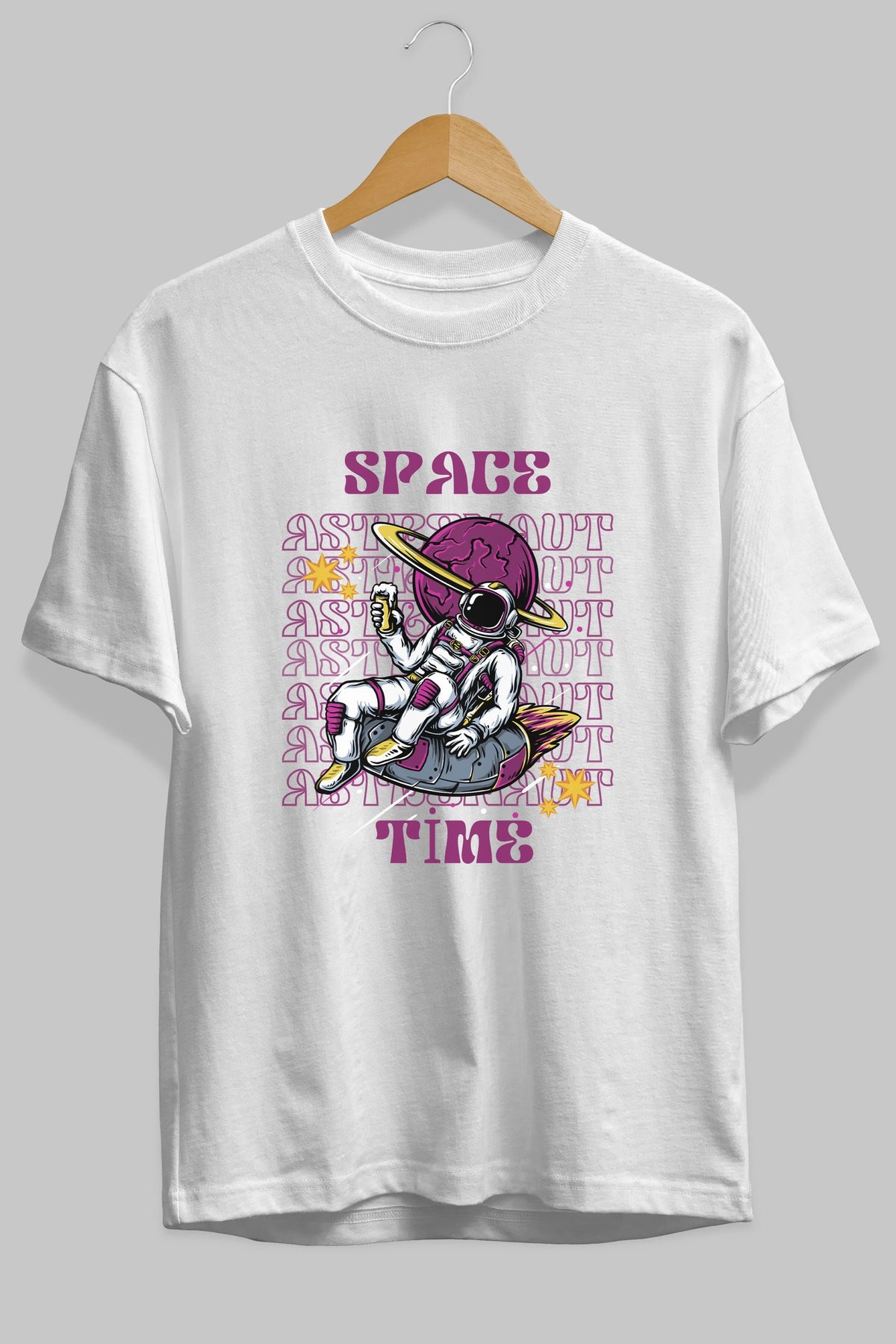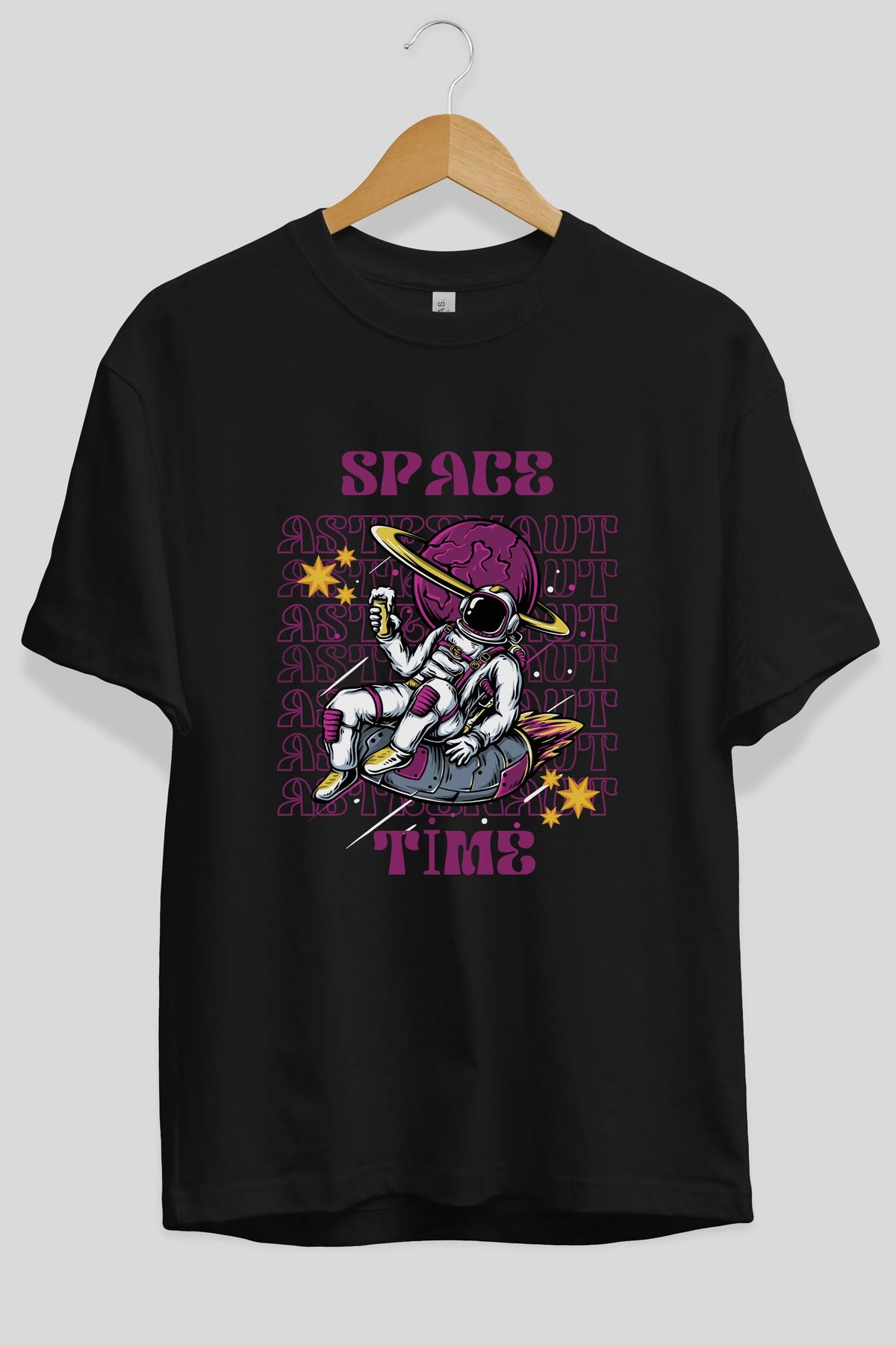 Space Time Astronaut Yazılı Ön Baskılı Oversize t-shirt Erkek Kadın Unisex