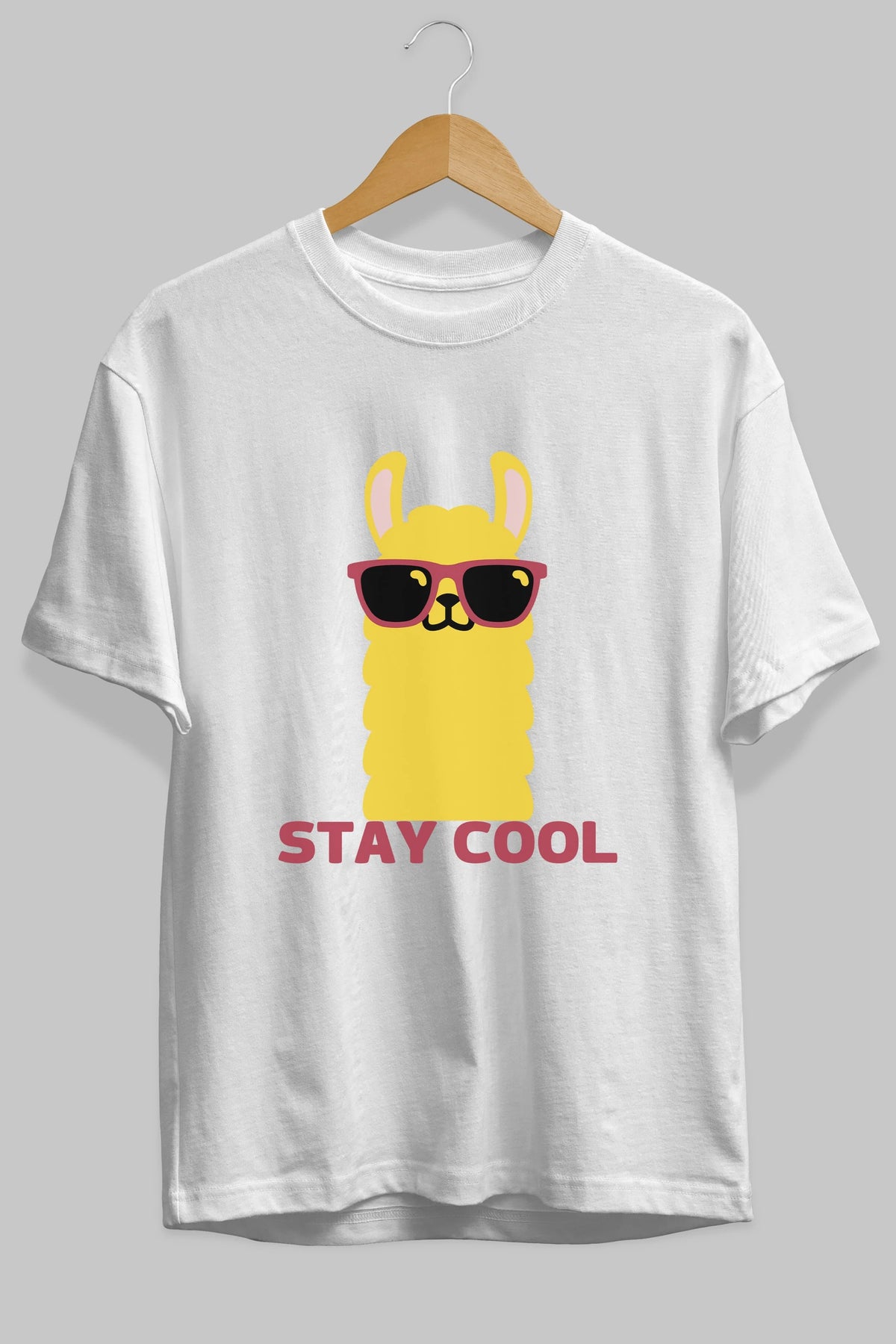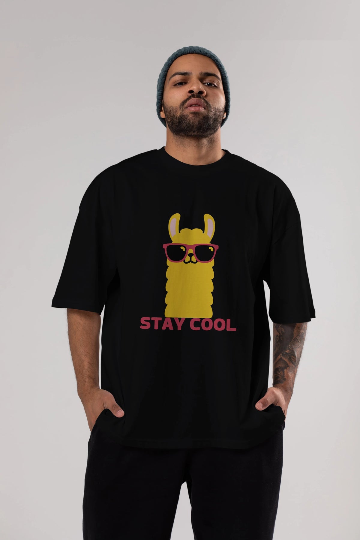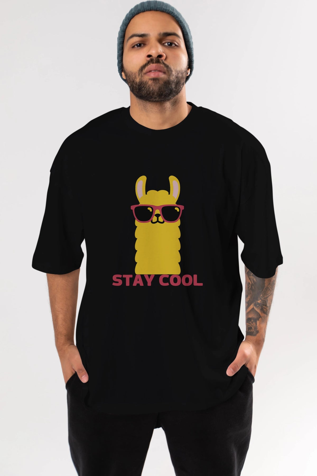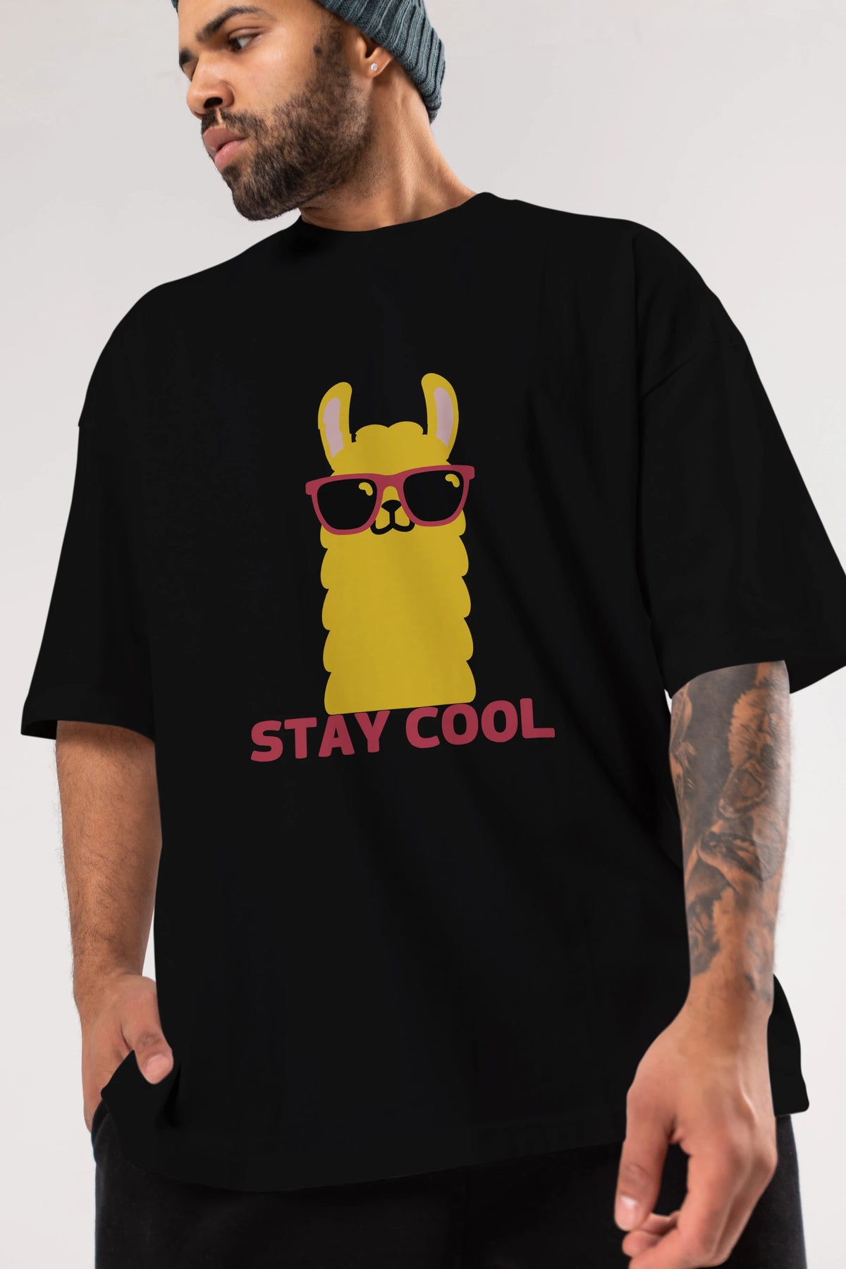 Stay Cool Yazılı Lama Ön Baskılı Oversize t-shirt Erkek Kadın Unisex