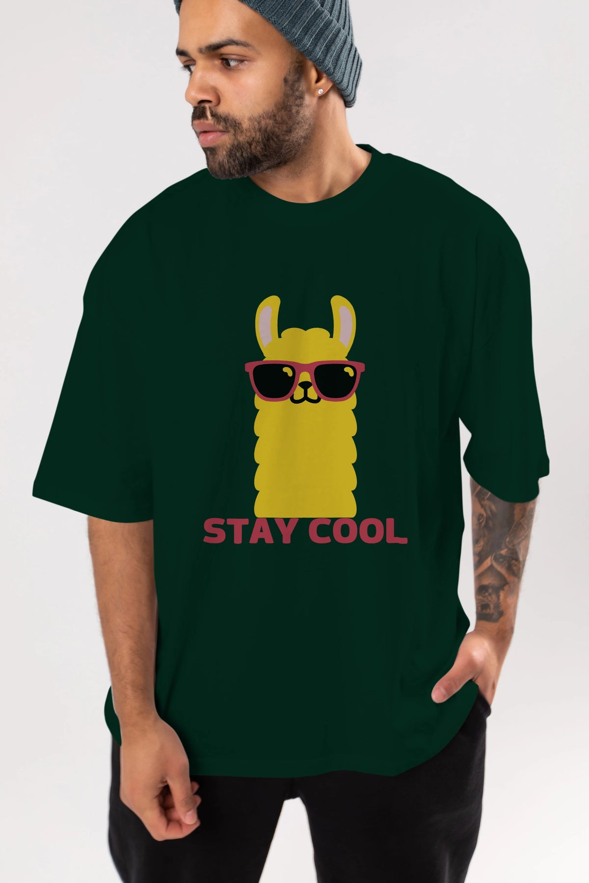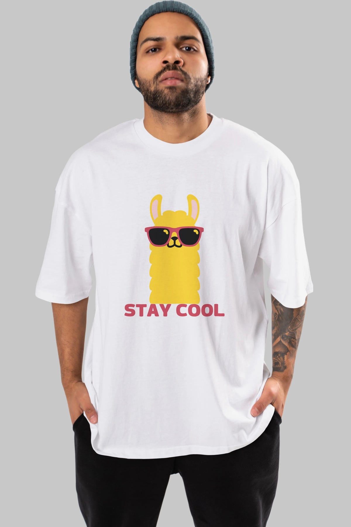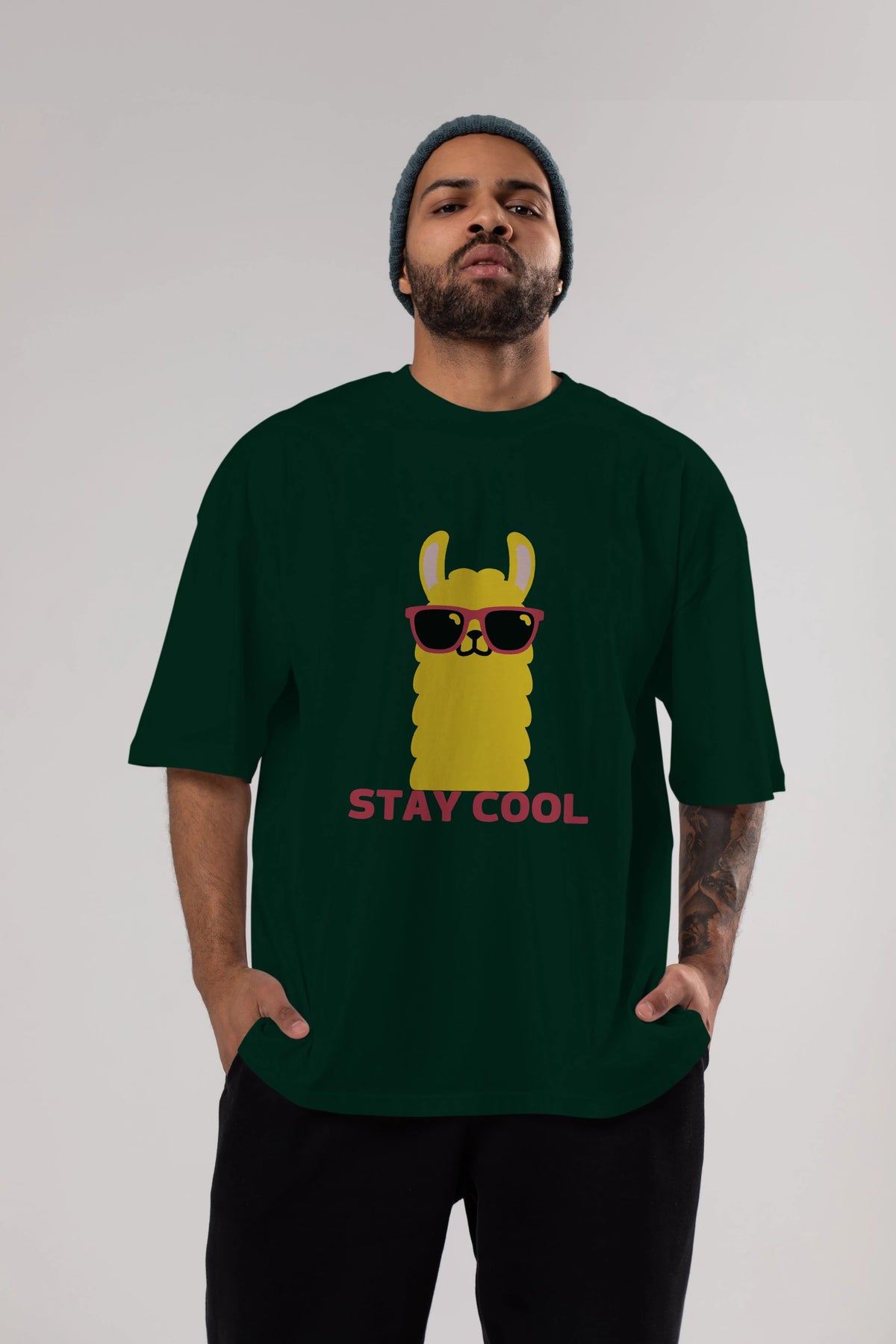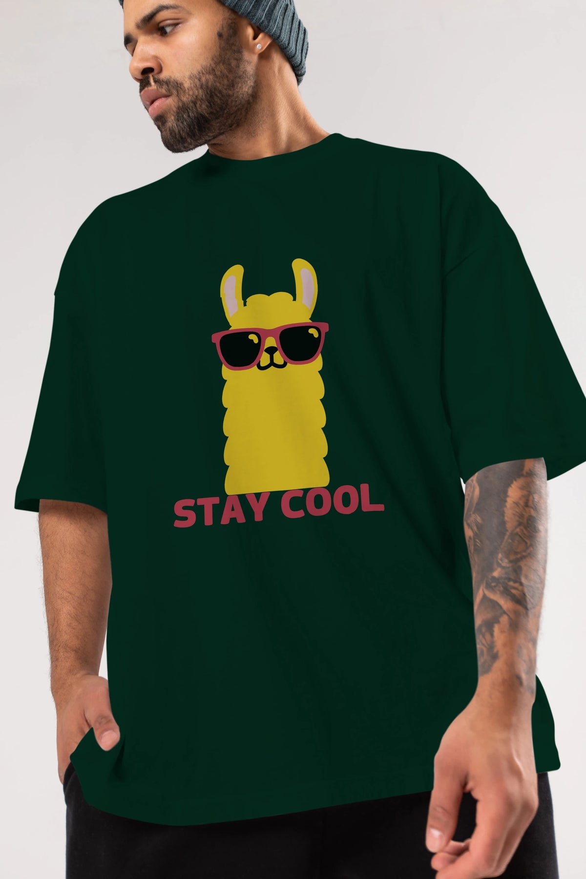 Stay Cool Yazılı Lama Ön Baskılı Oversize t-shirt Erkek Kadın Unisex