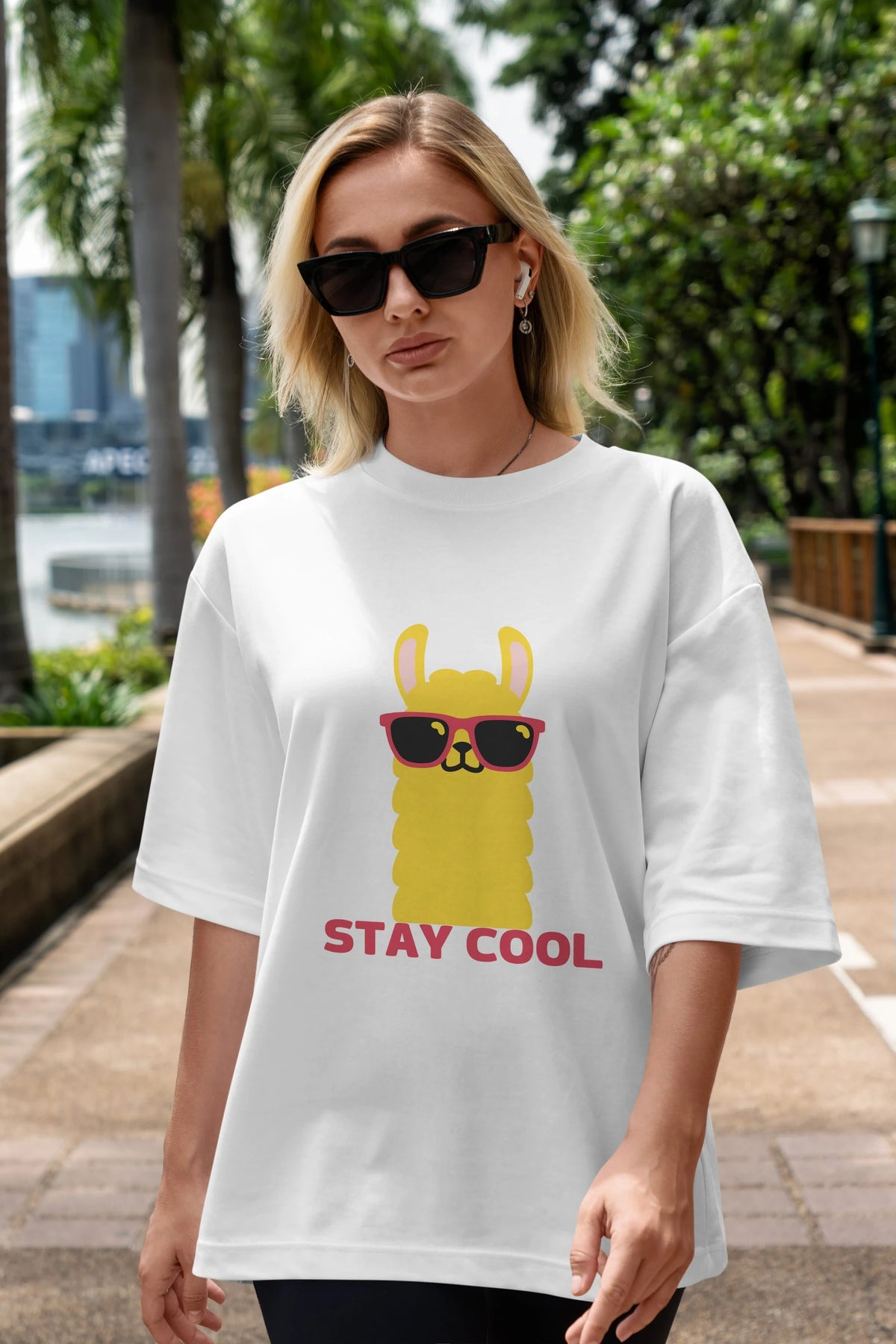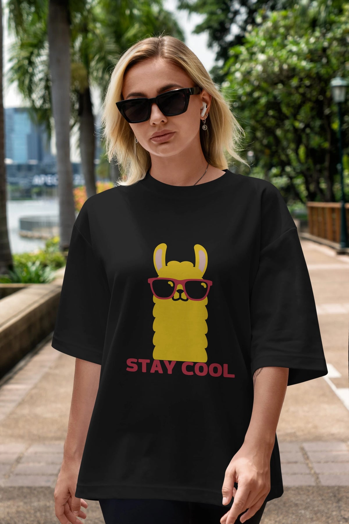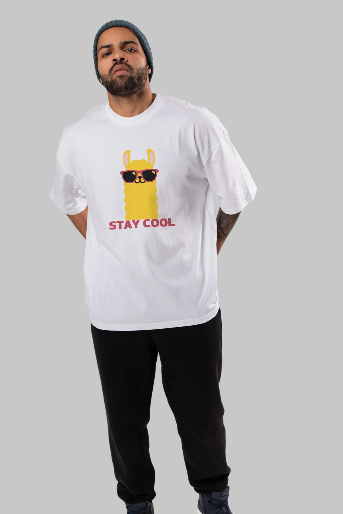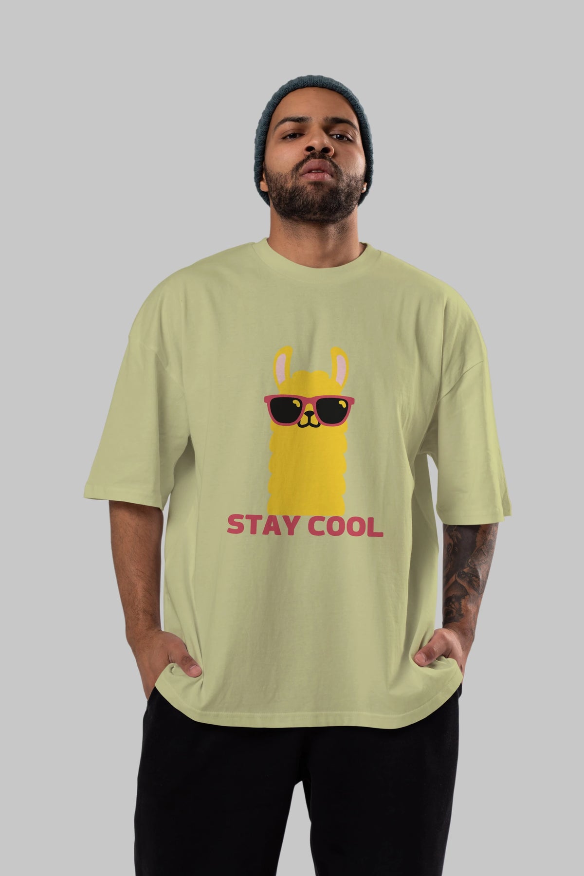 Stay Cool Yazılı Lama Ön Baskılı Oversize t-shirt Erkek Kadın Unisex