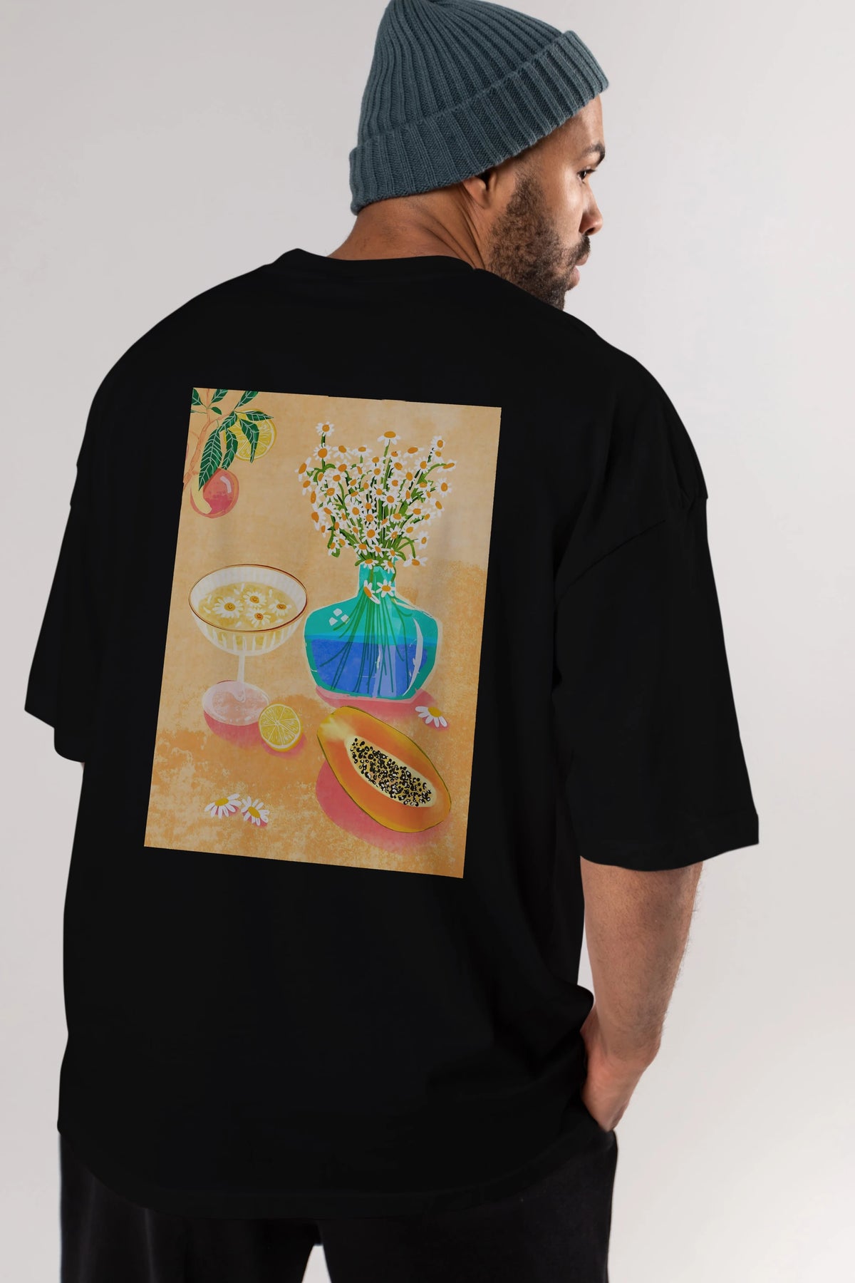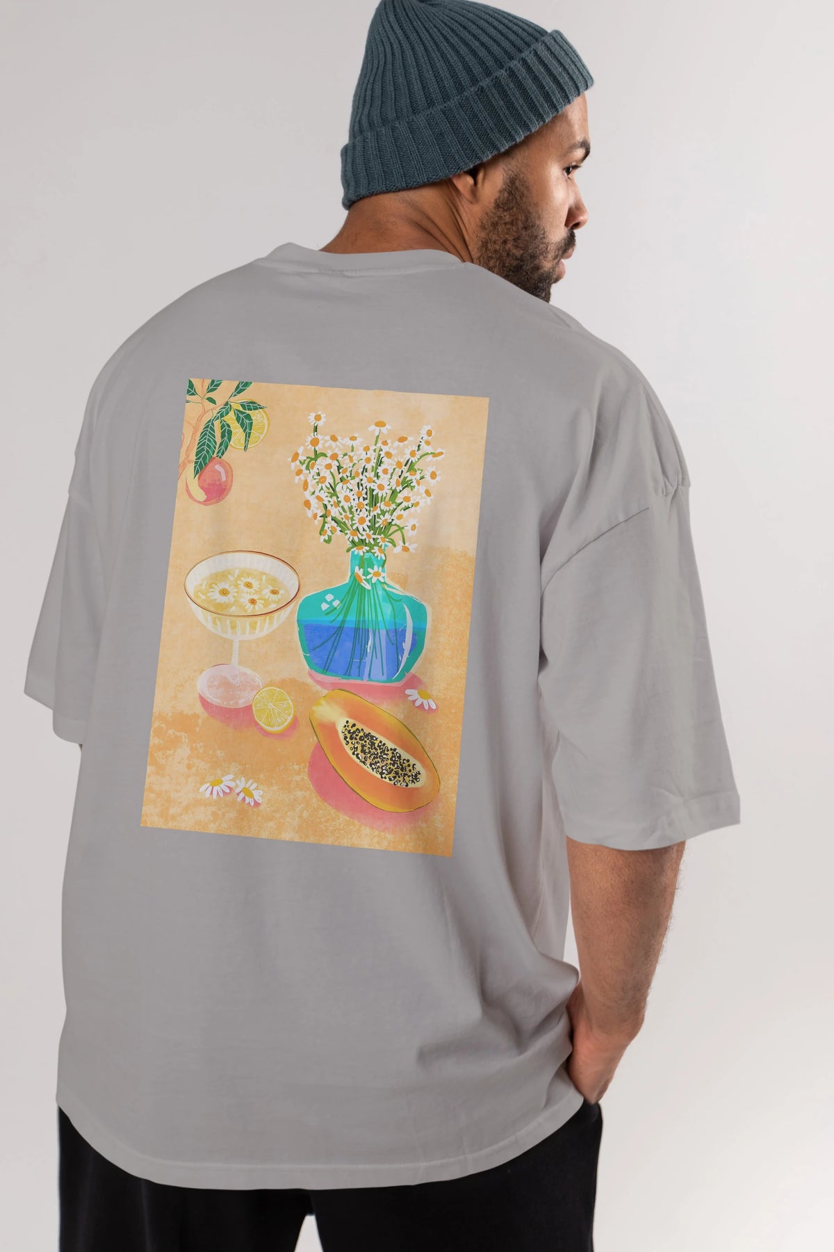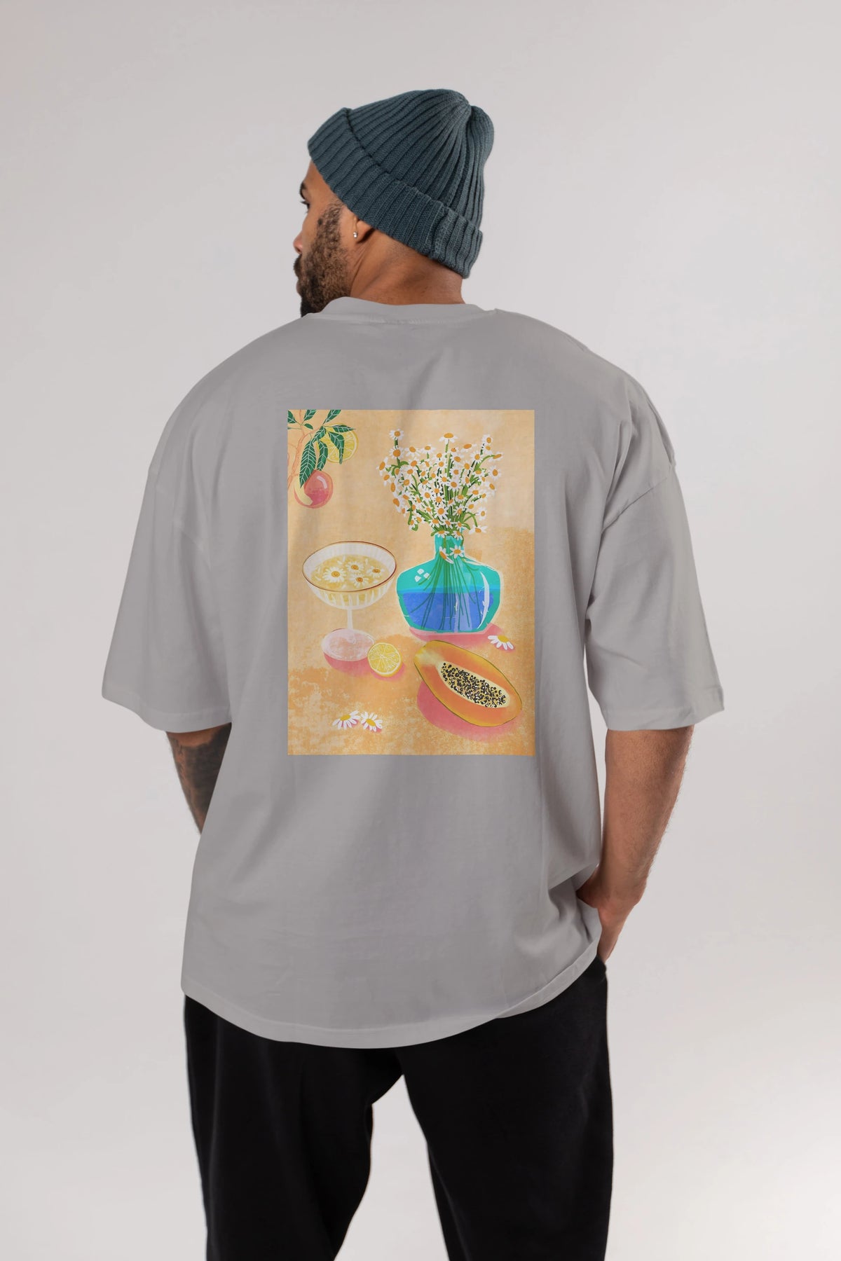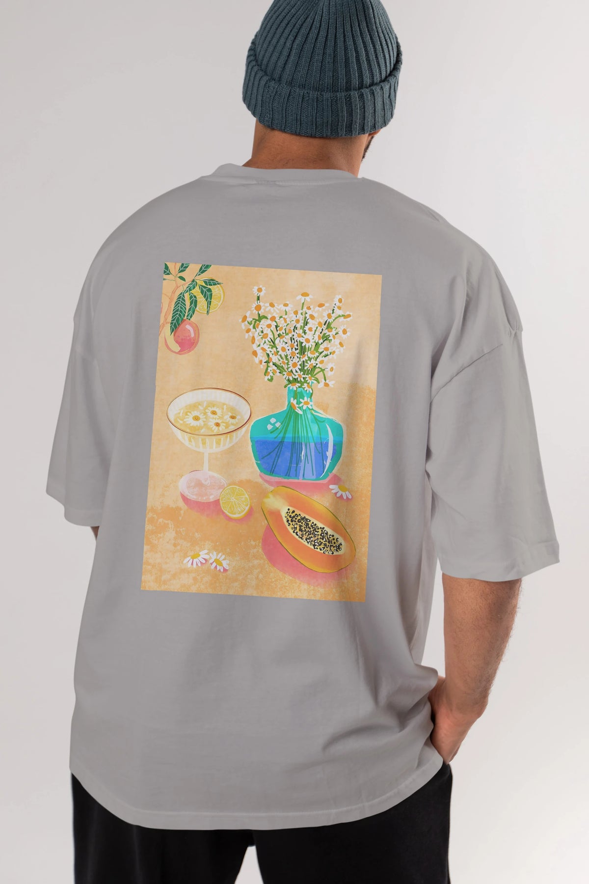 Hem erkekler hem de kadınlar için uygun, taze, modern bir baskıya sahip baskılı oversize t-shirt.