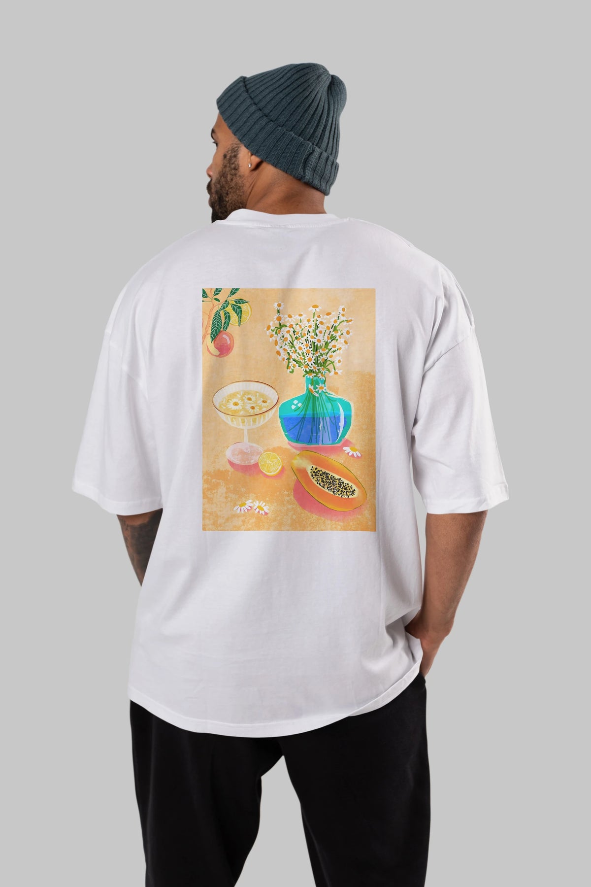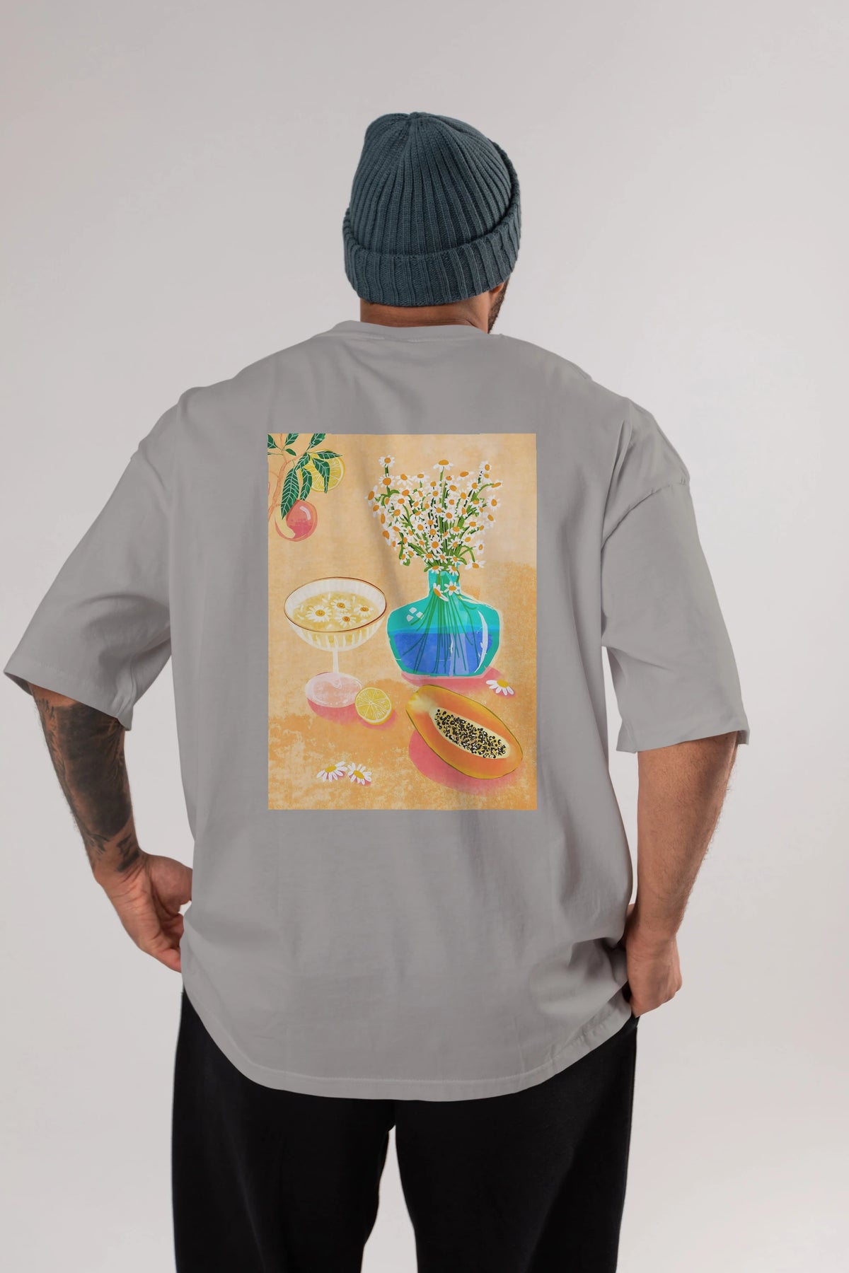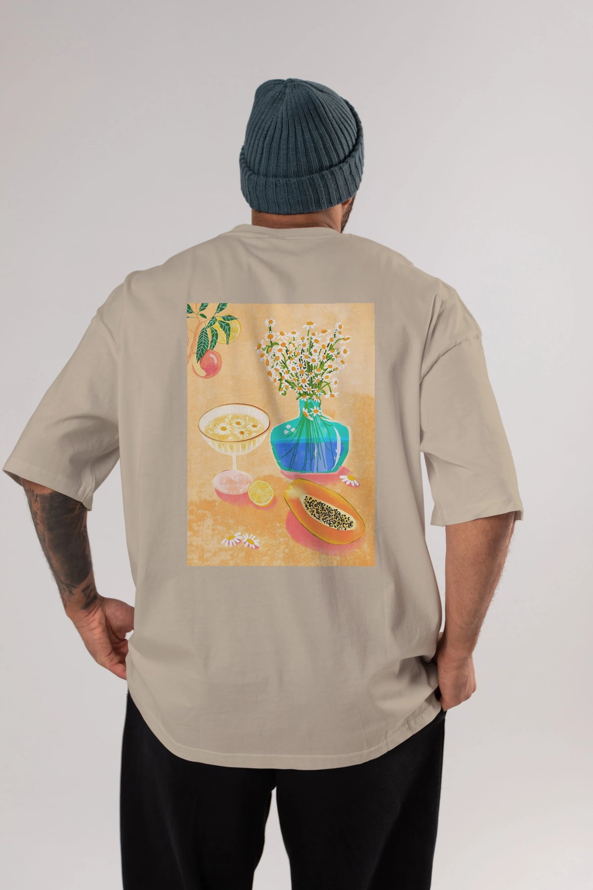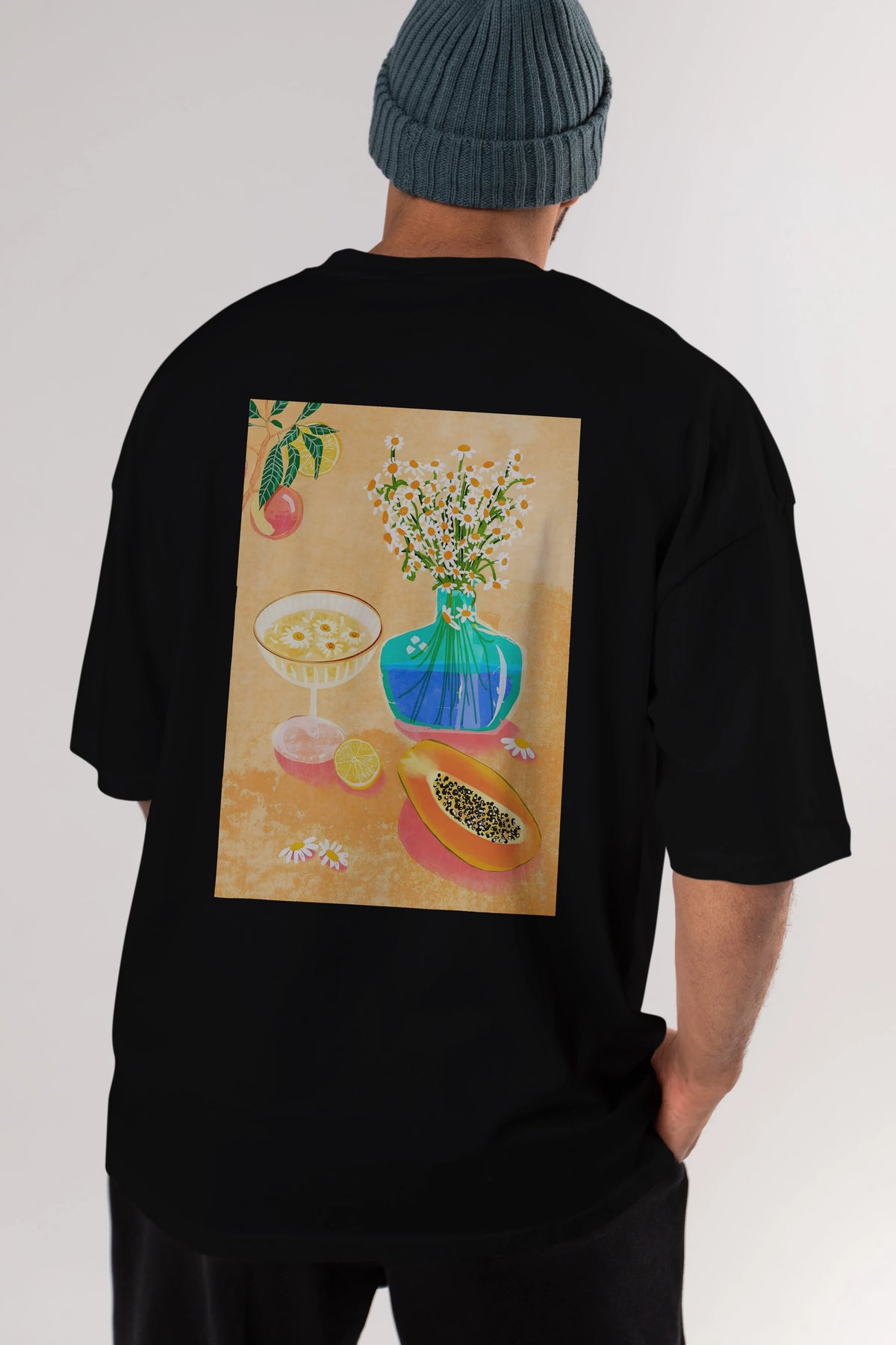 Hem erkekler hem de kadınlar için uygun, taze, modern bir baskıya sahip baskılı oversize t-shirt.