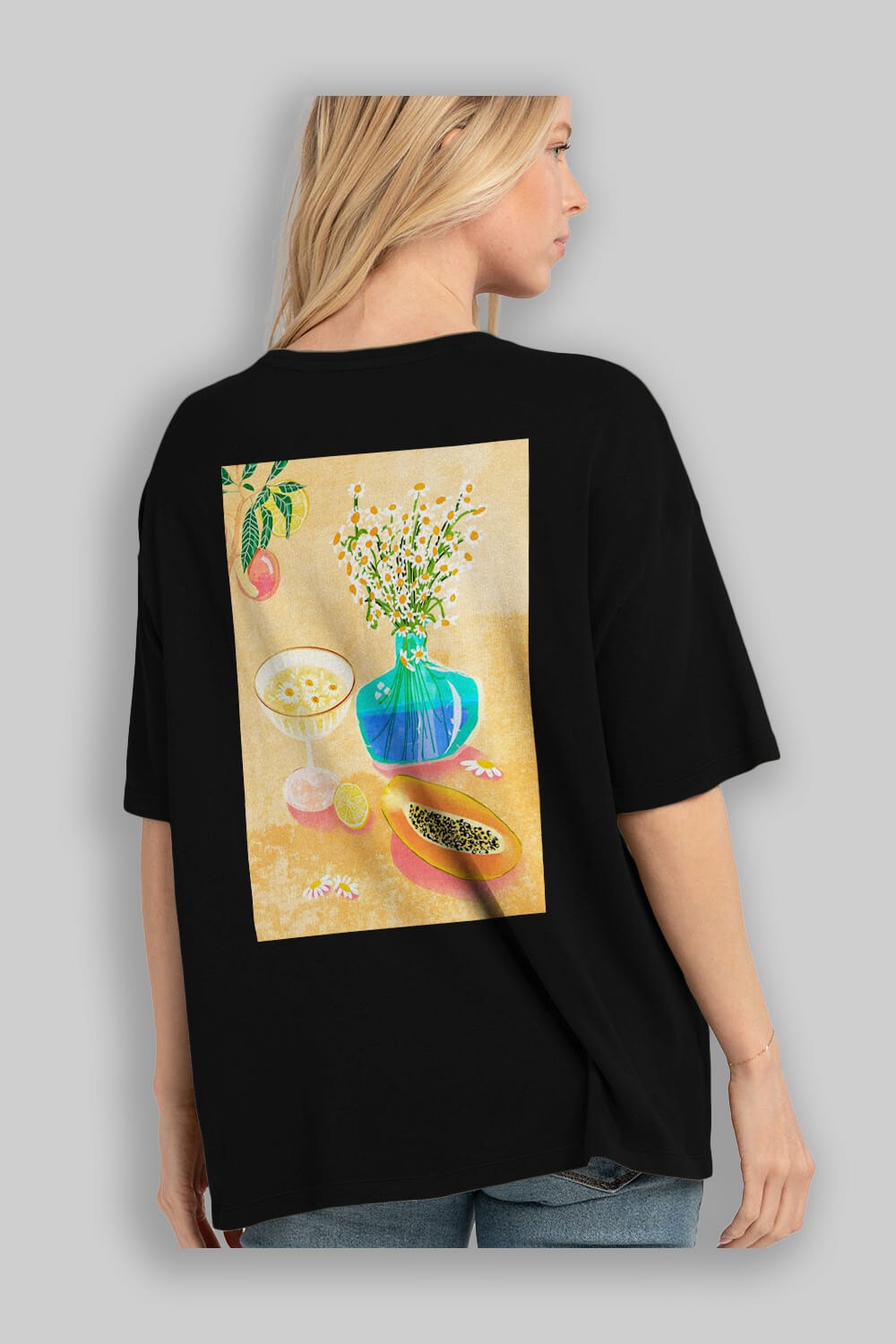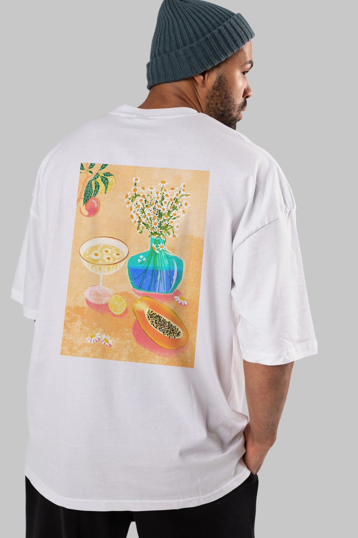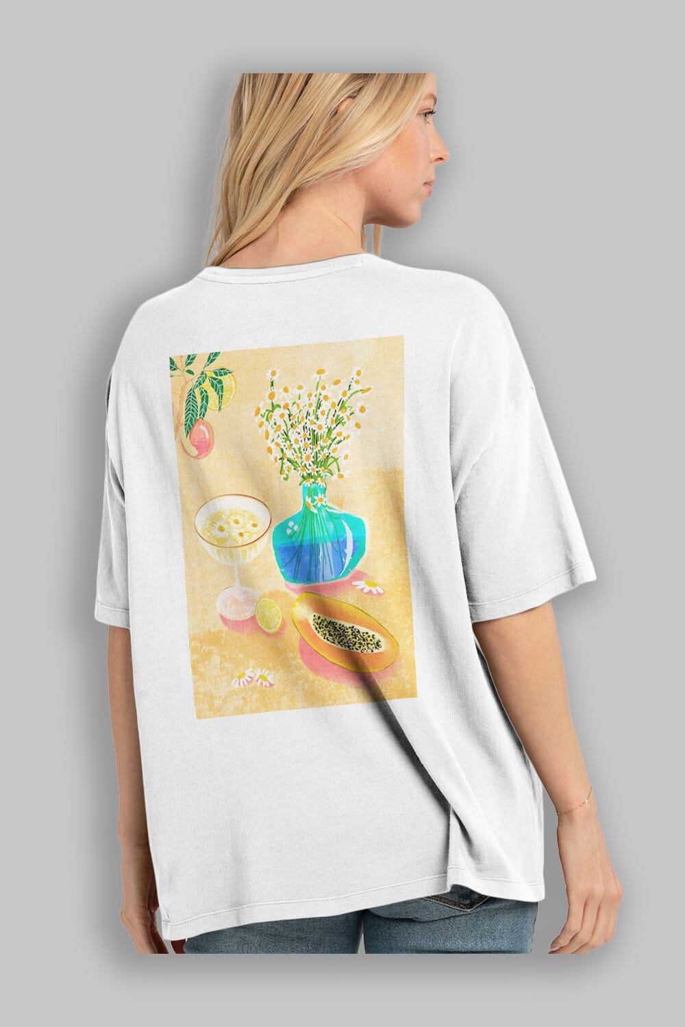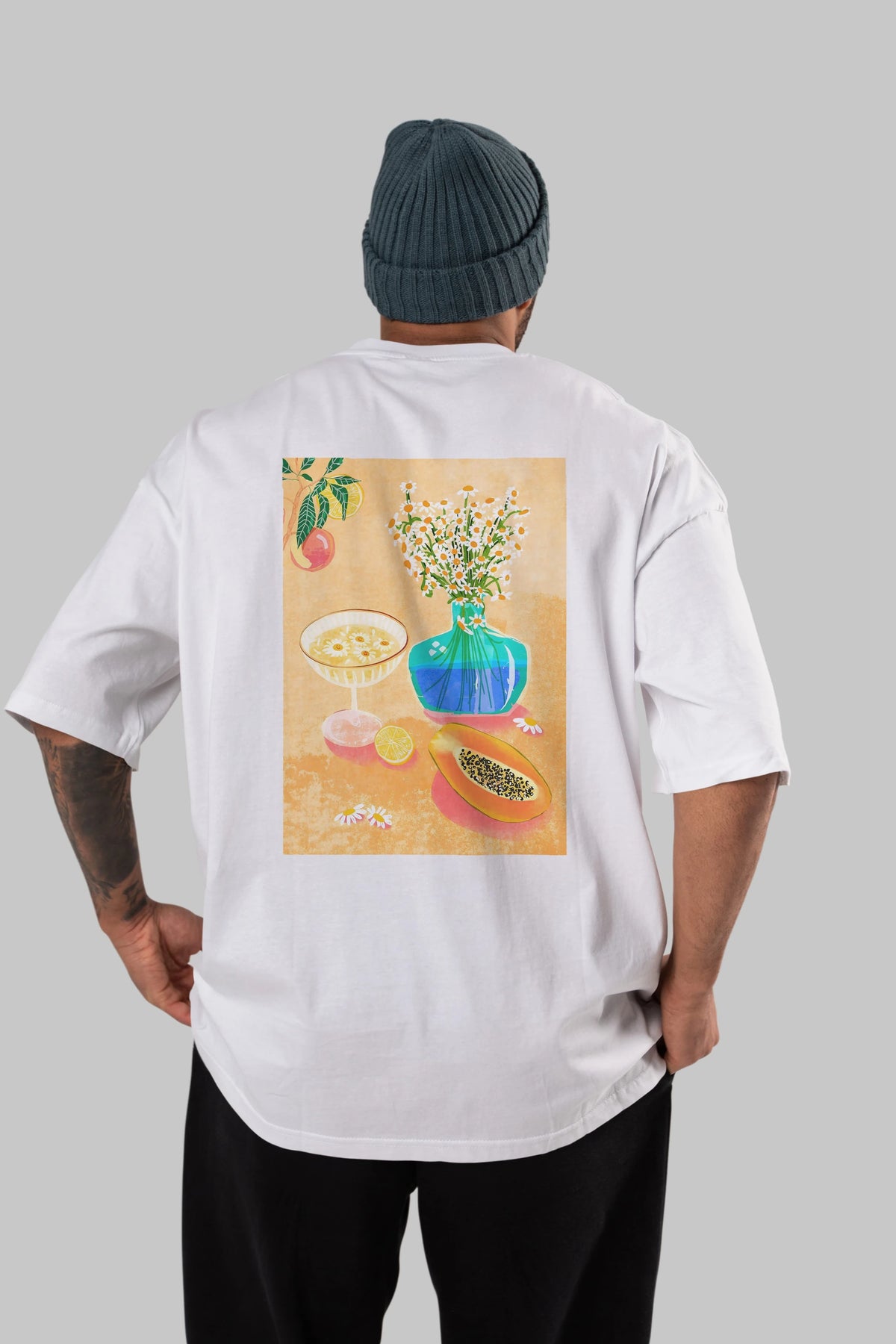 Hem erkekler hem de kadınlar için uygun, taze, modern bir baskıya sahip baskılı oversize t-shirt.