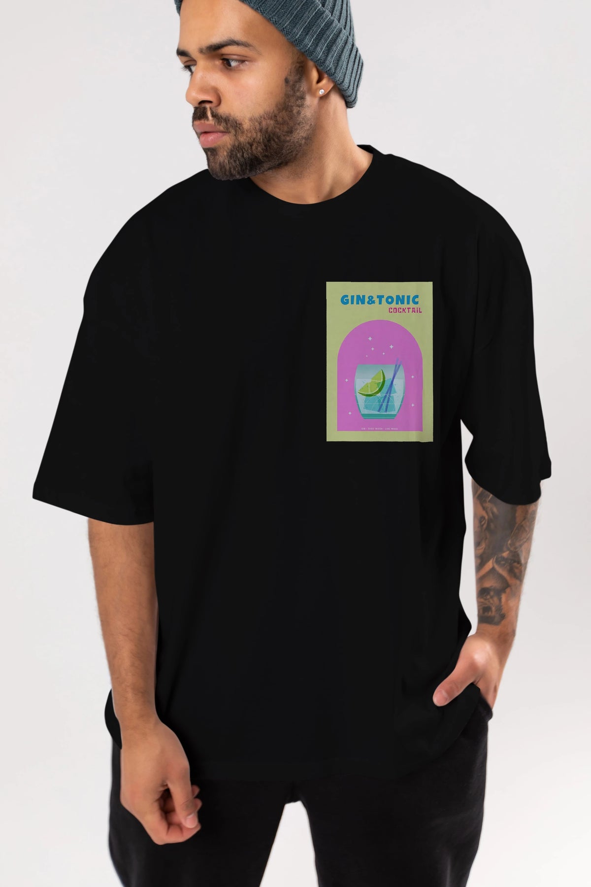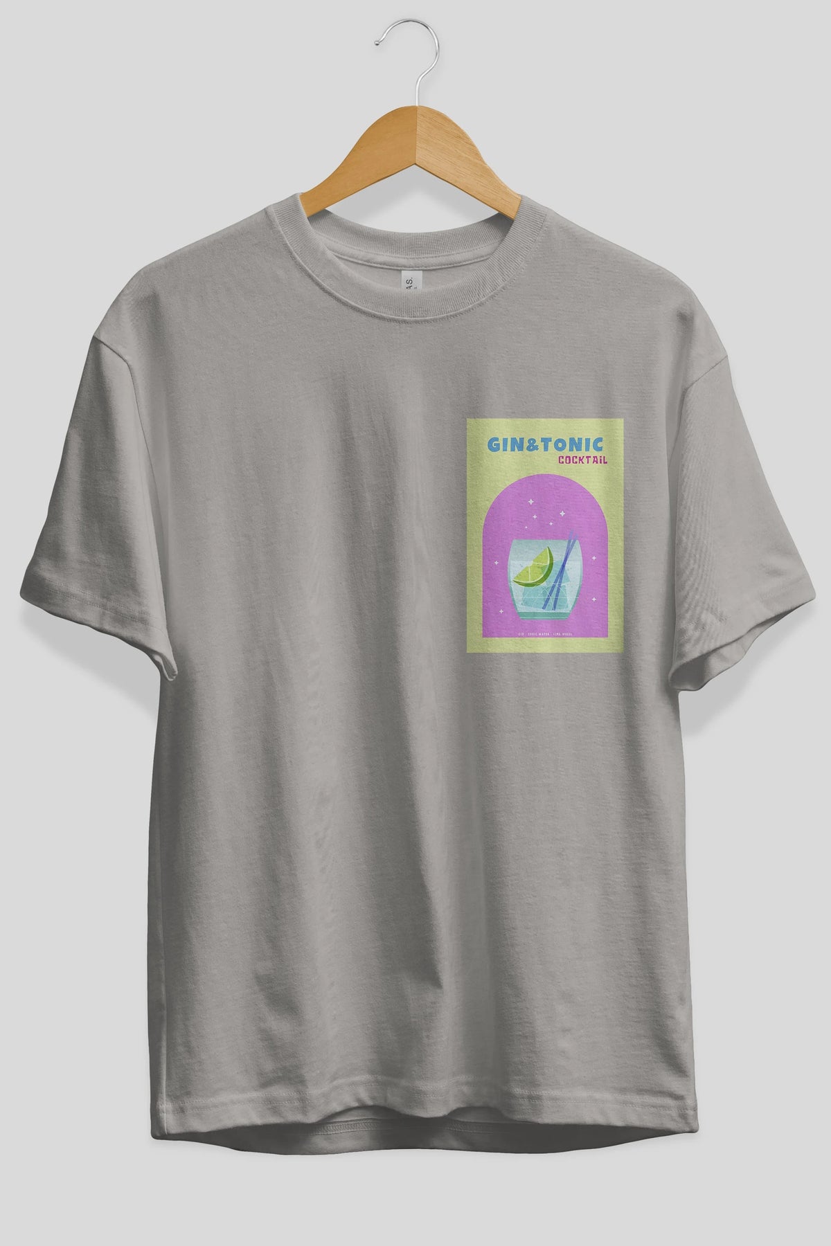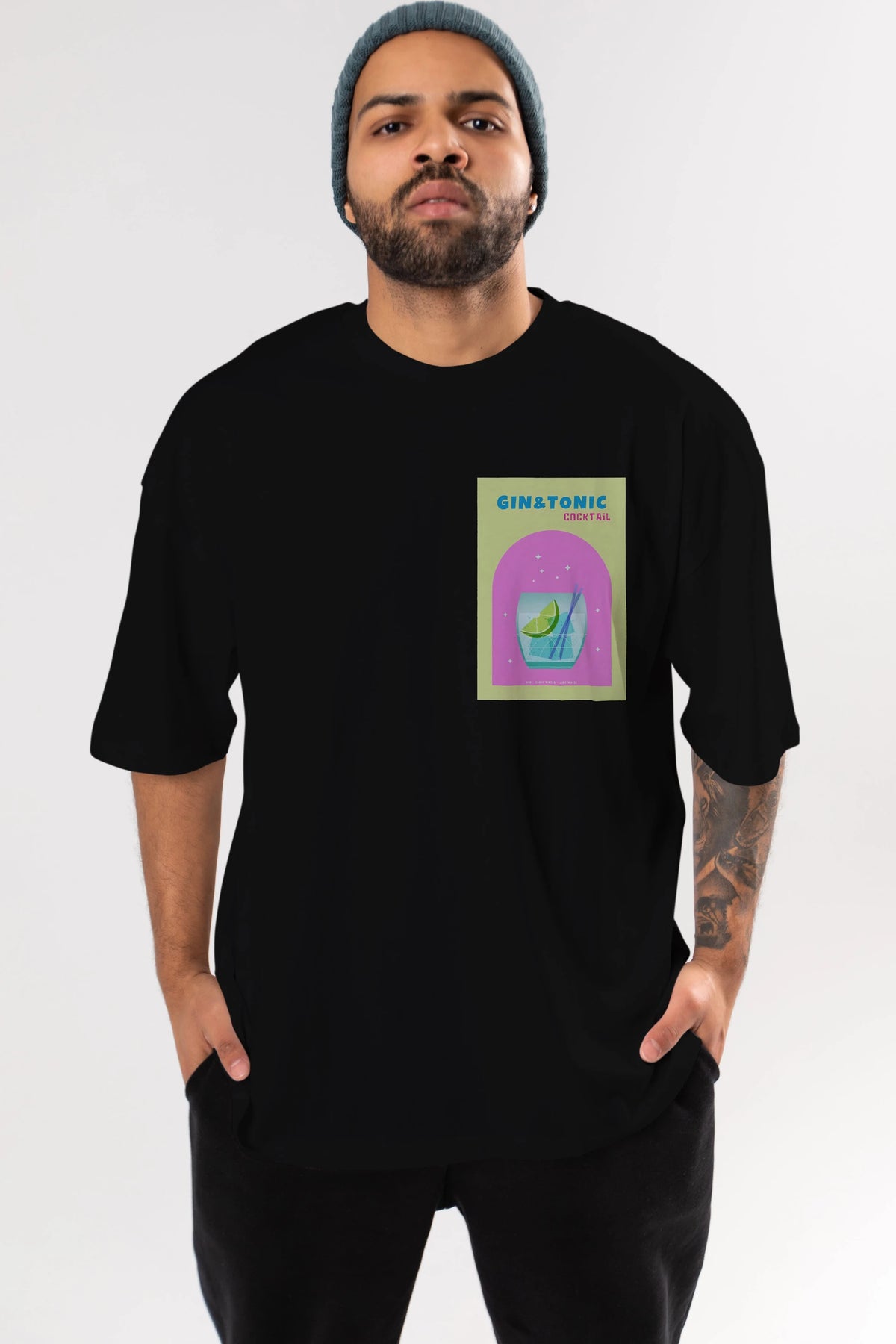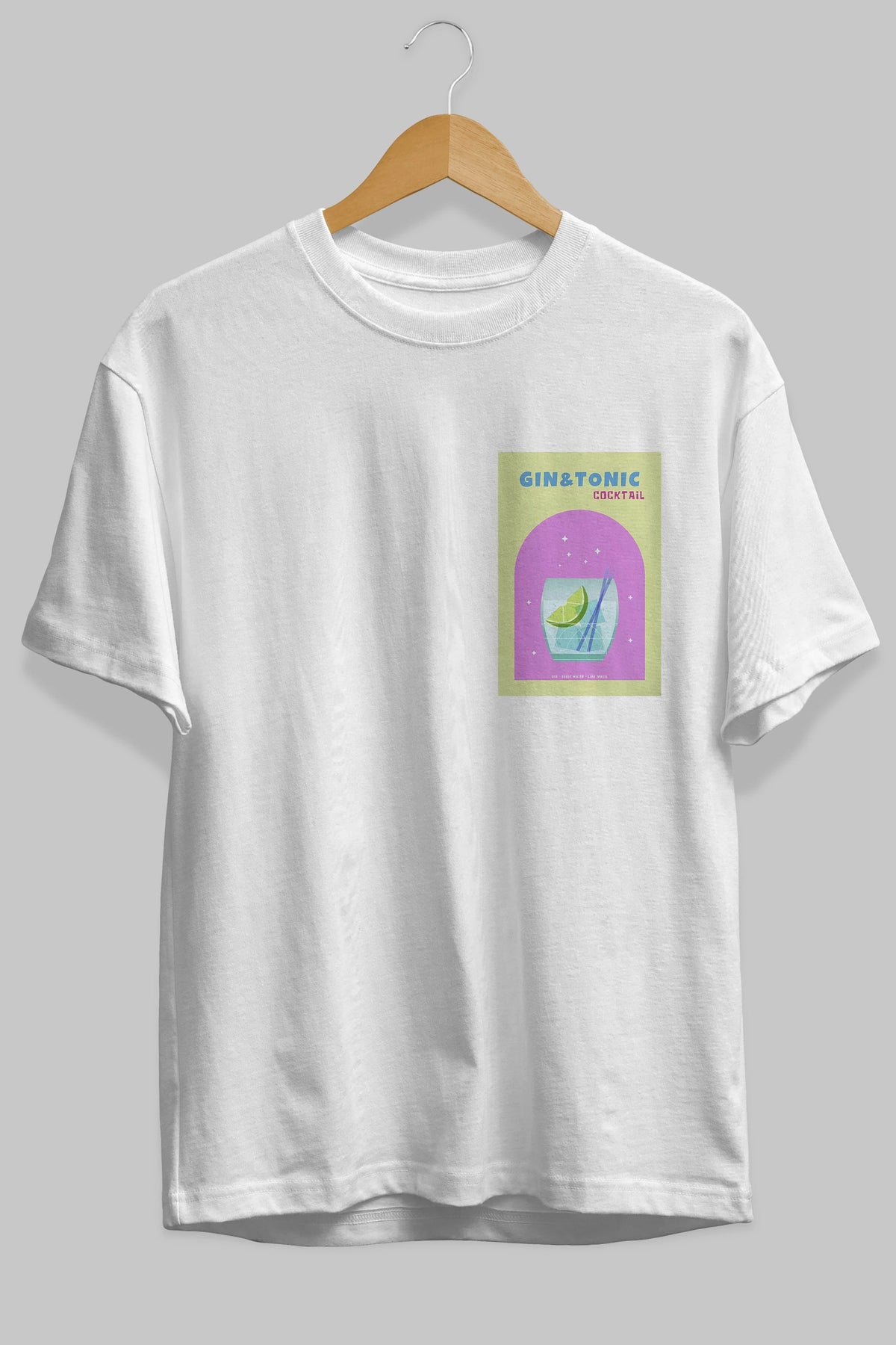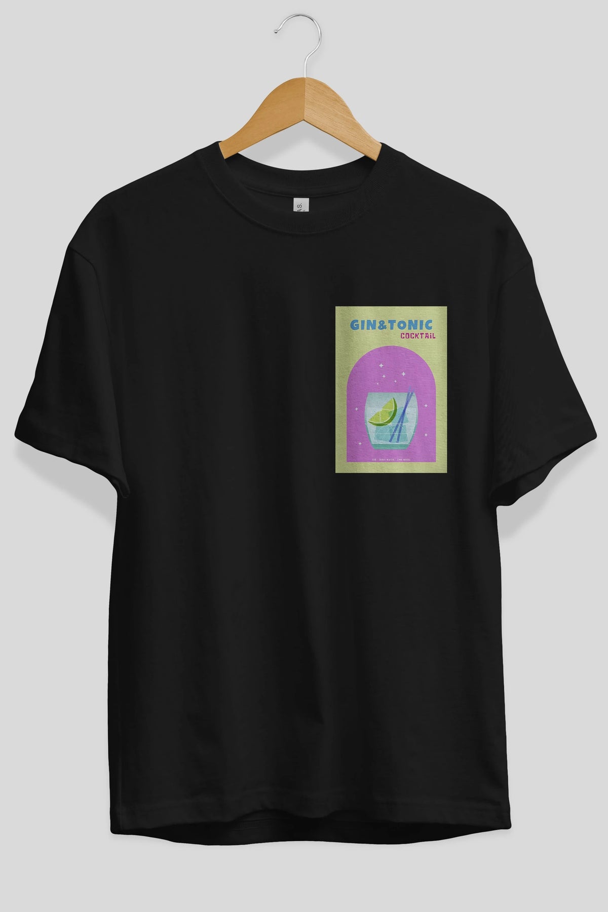 Gin Tonic Cocktail Ön Sol Baskılı Oversize t-shirt Erkek Kadın Unisex %100 Pamuk Bisiklet Yaka tişort