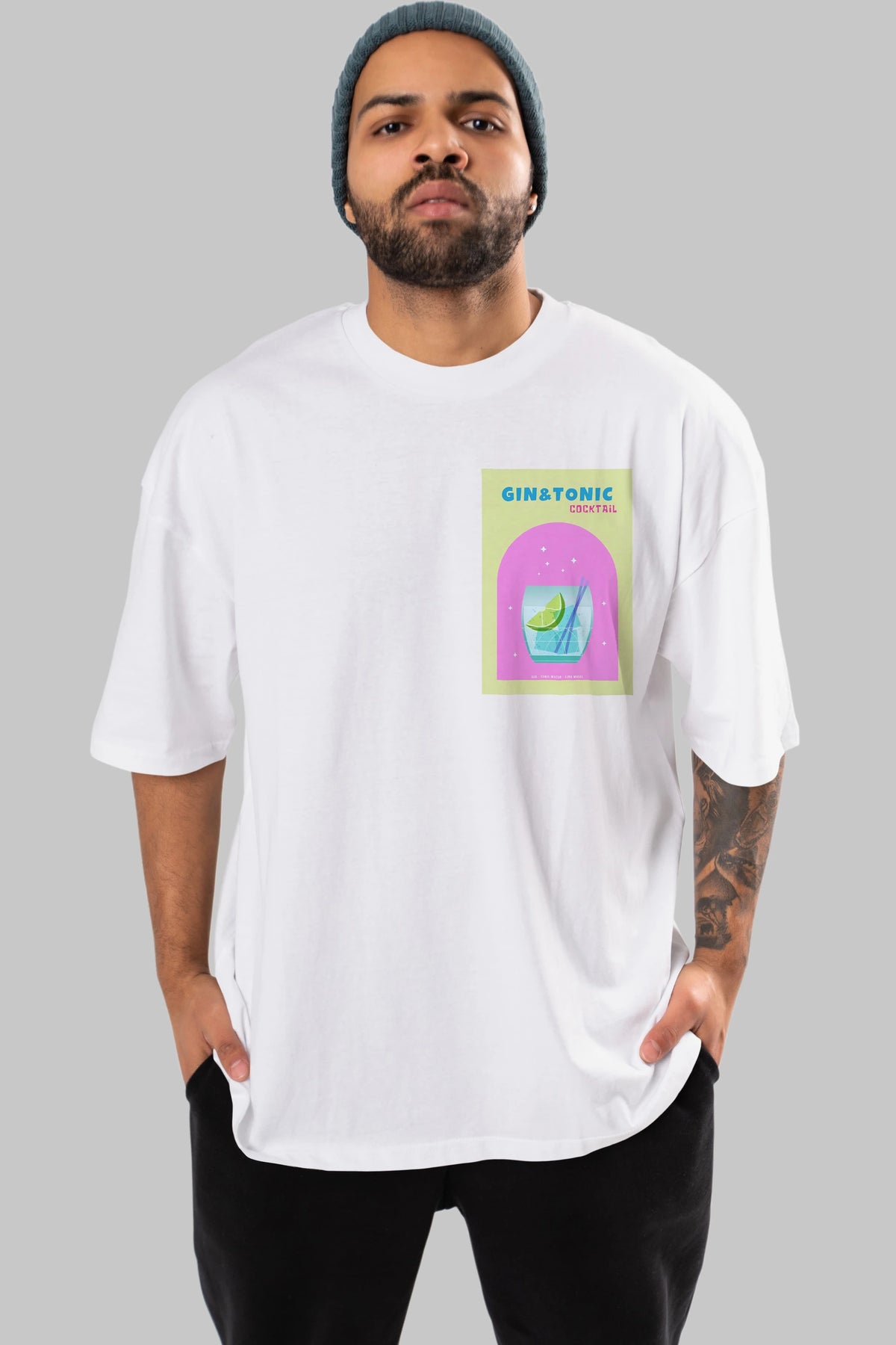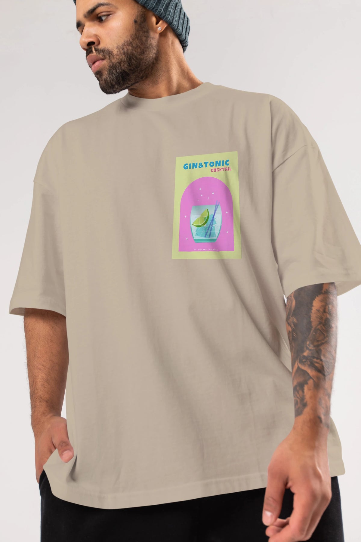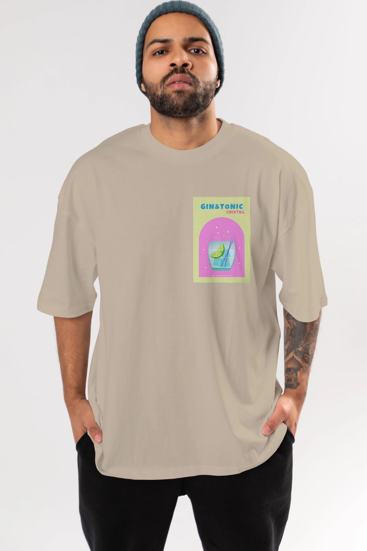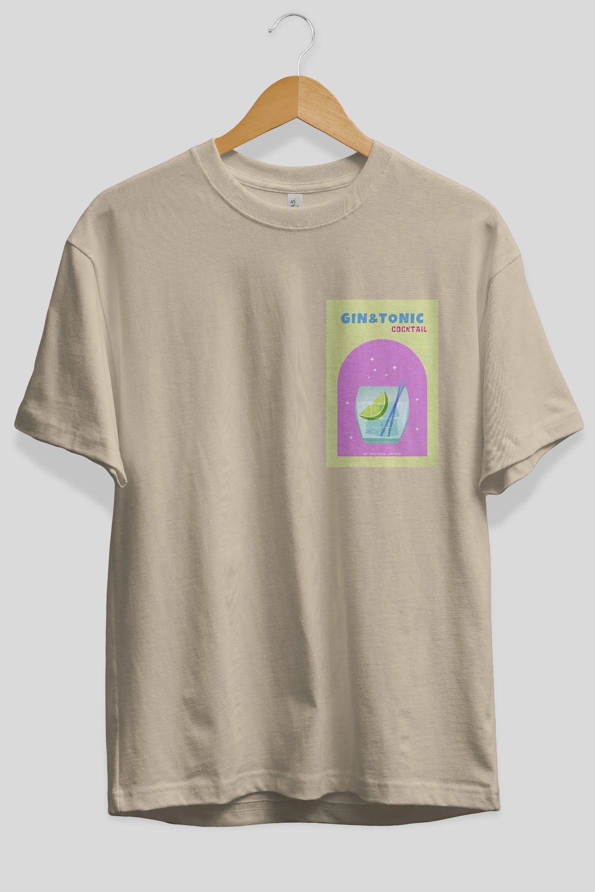 Gin Tonic Cocktail Ön Sol Baskılı Oversize t-shirt Erkek Kadın Unisex %100 Pamuk Bisiklet Yaka tişort