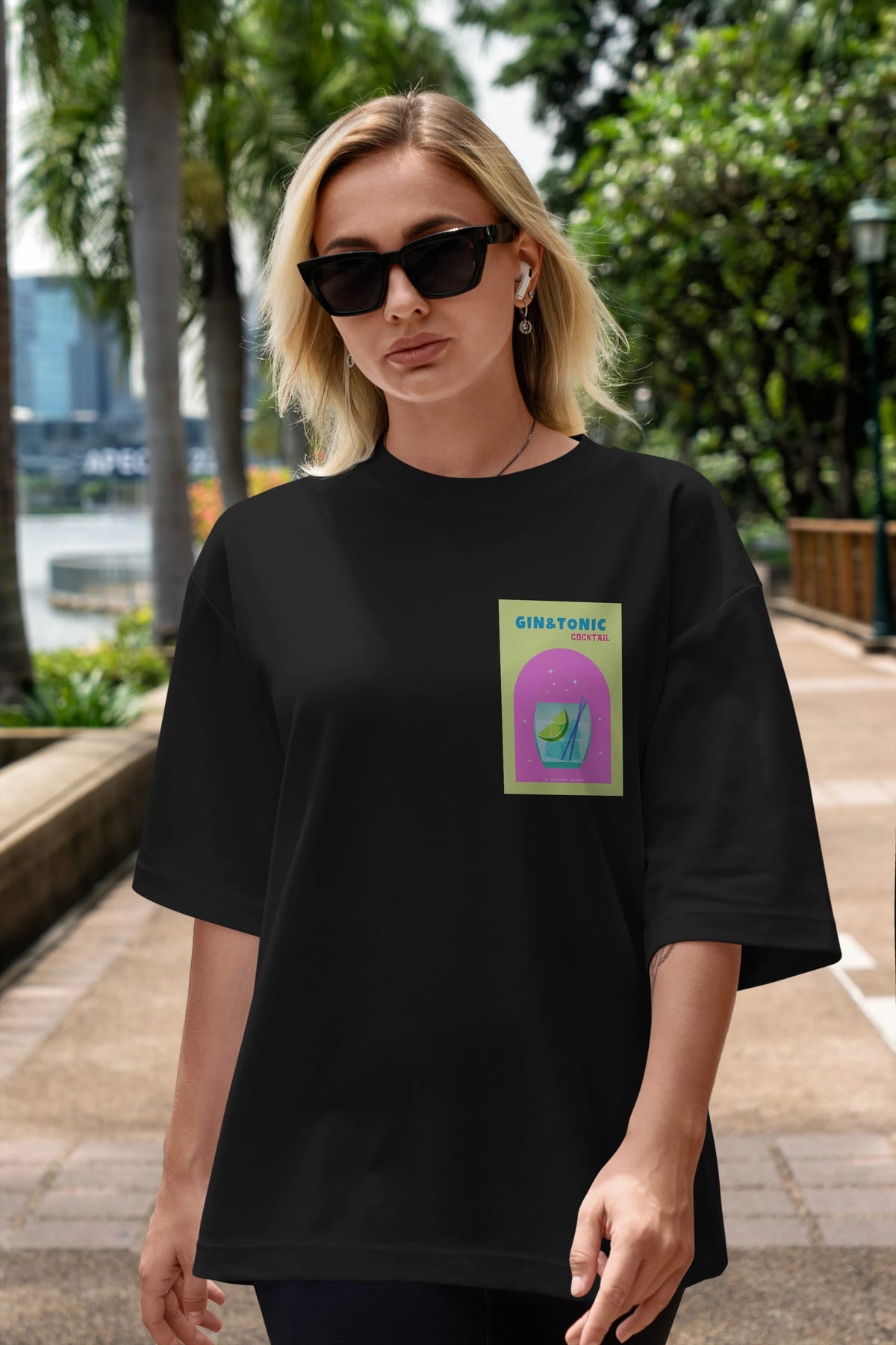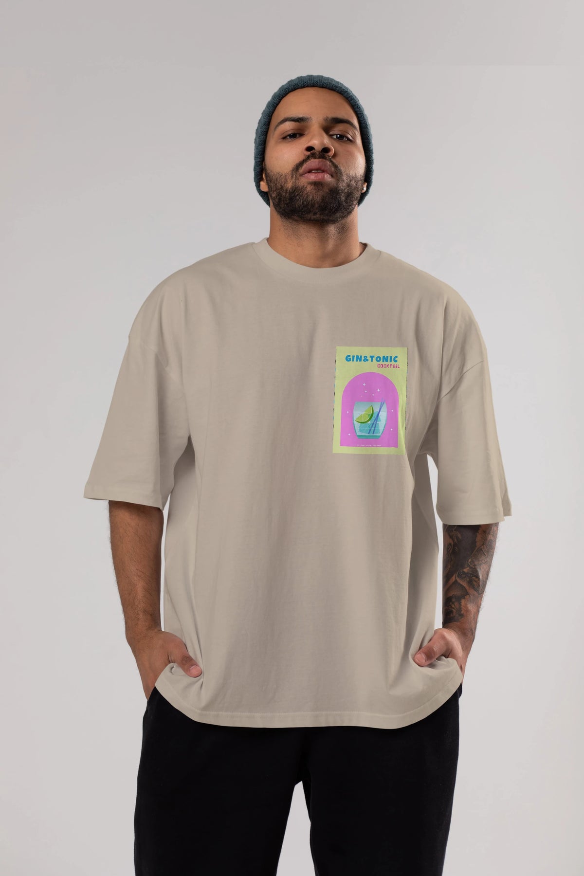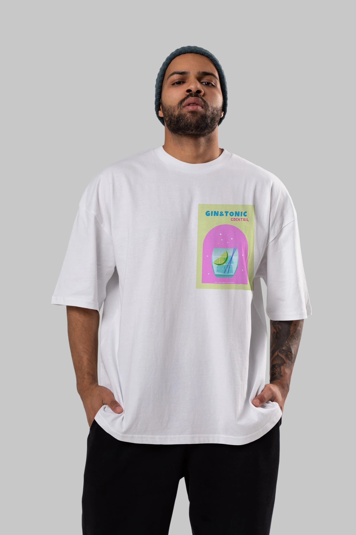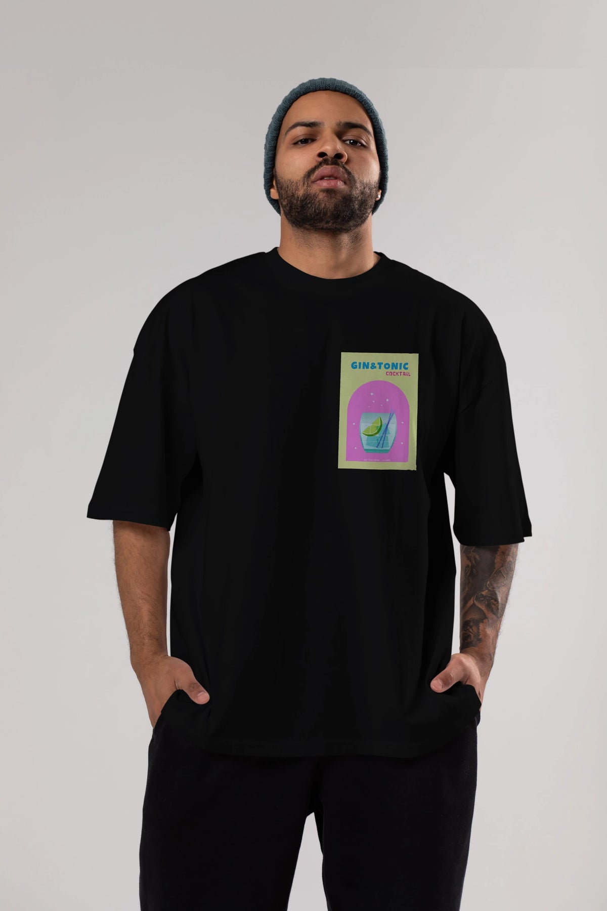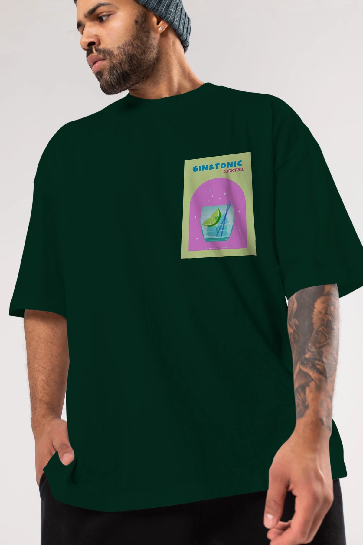 Gin Tonic Cocktail Ön Sol Baskılı Oversize t-shirt Erkek Kadın Unisex %100 Pamuk Bisiklet Yaka tişort