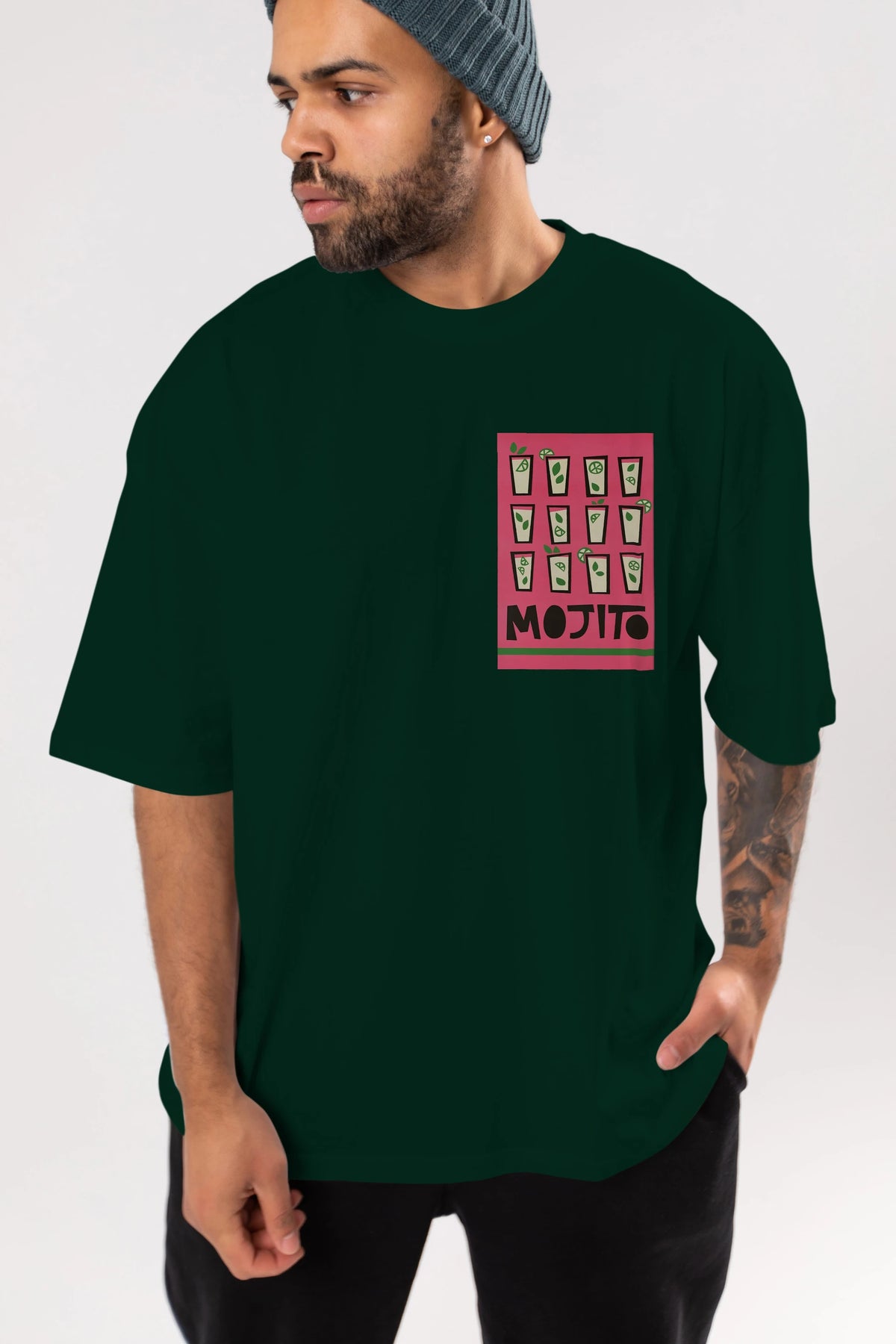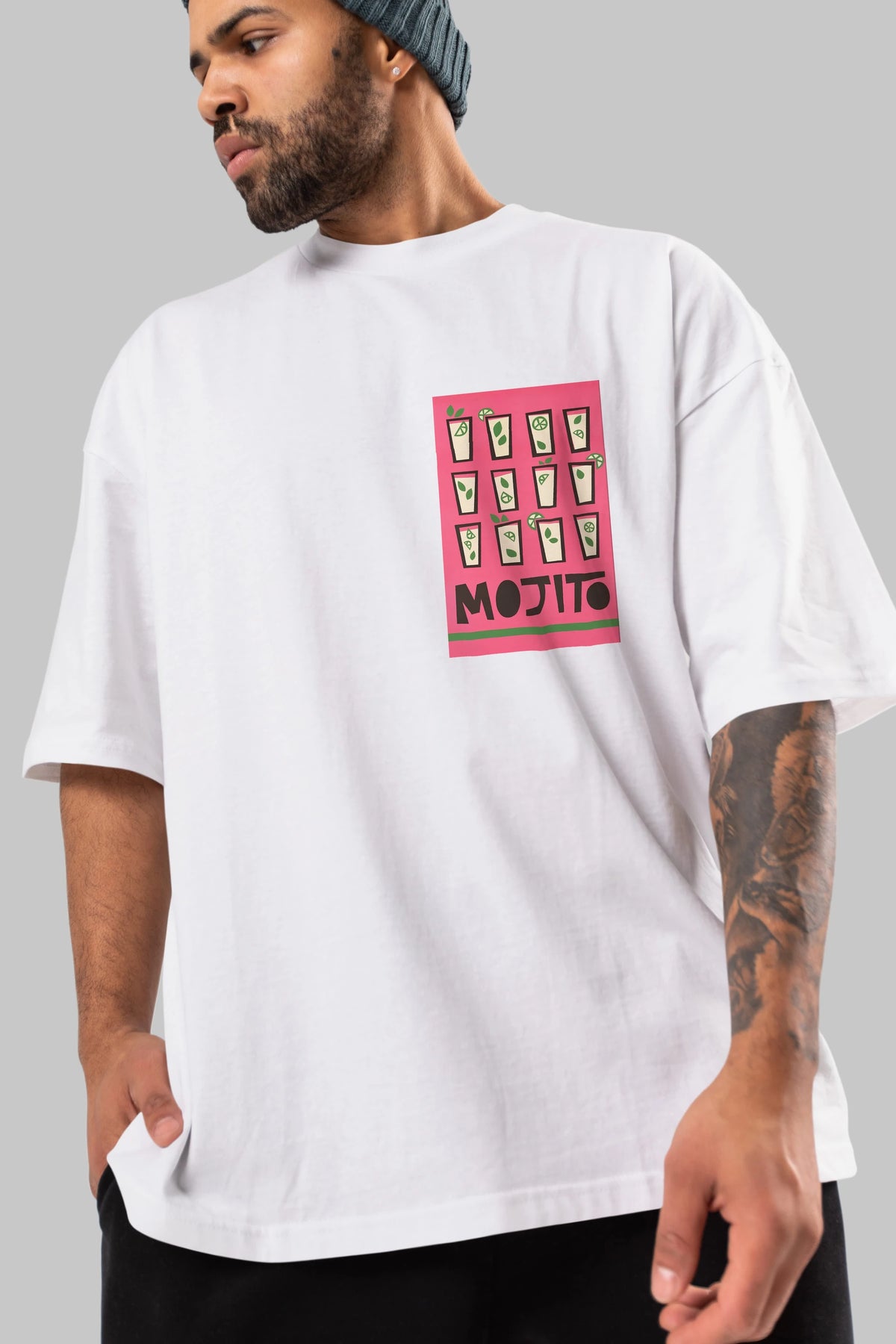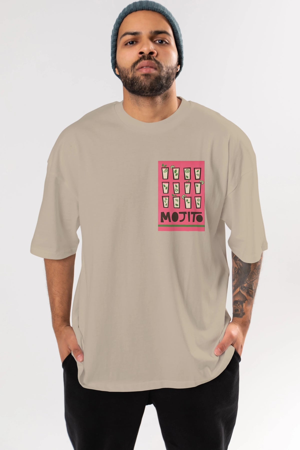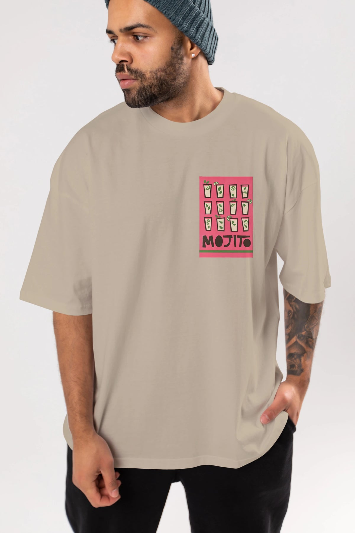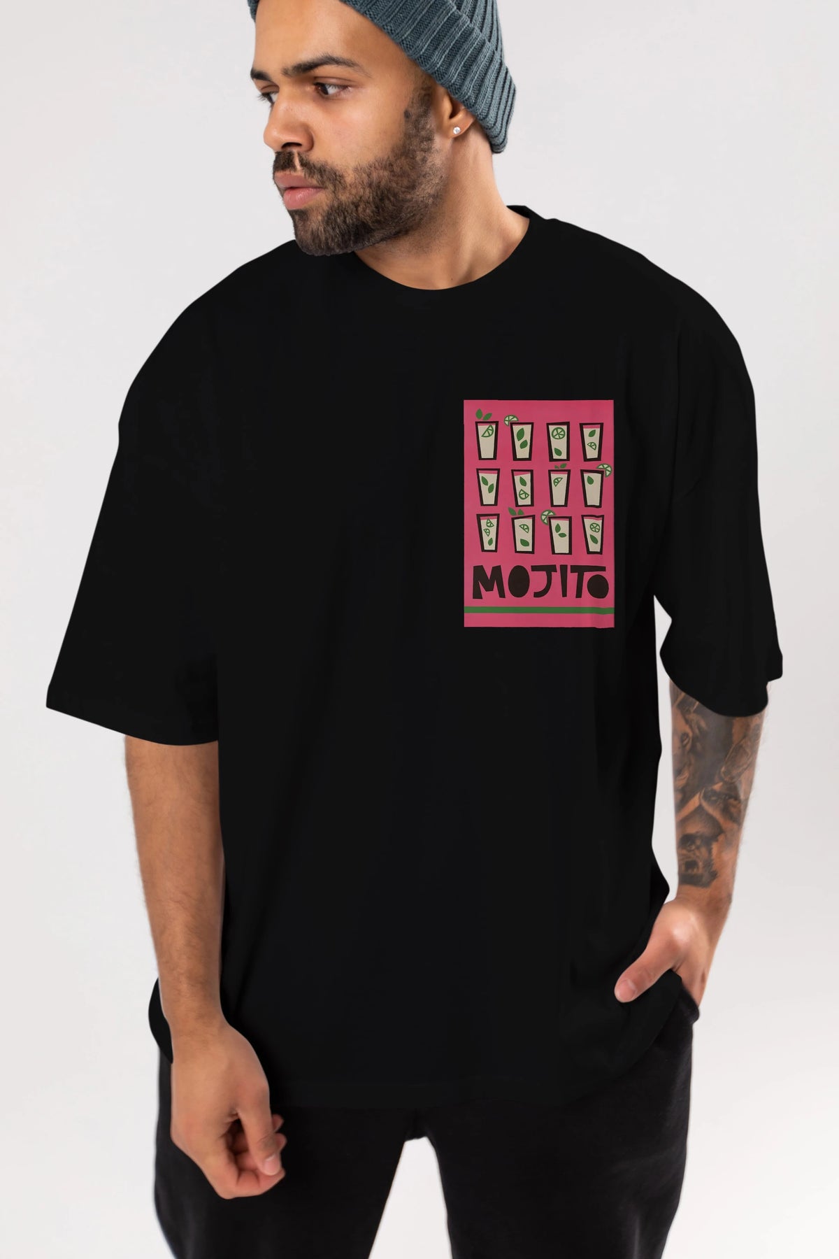 Mojito Ön Sol Baskılı Oversize t-shirt Erkek Kadın Unisex %100 Pamuk Bisiklet Yaka tişort