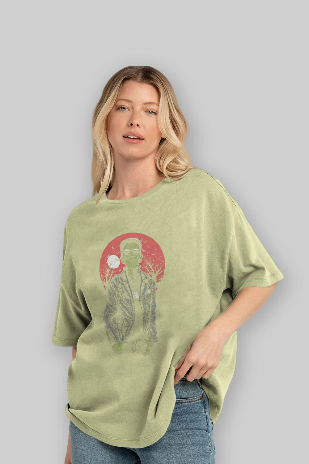 Hem erkekler hem de kadınlar için uygun, taze, modern bir baskıya sahip baskılı oversize t-shirt.