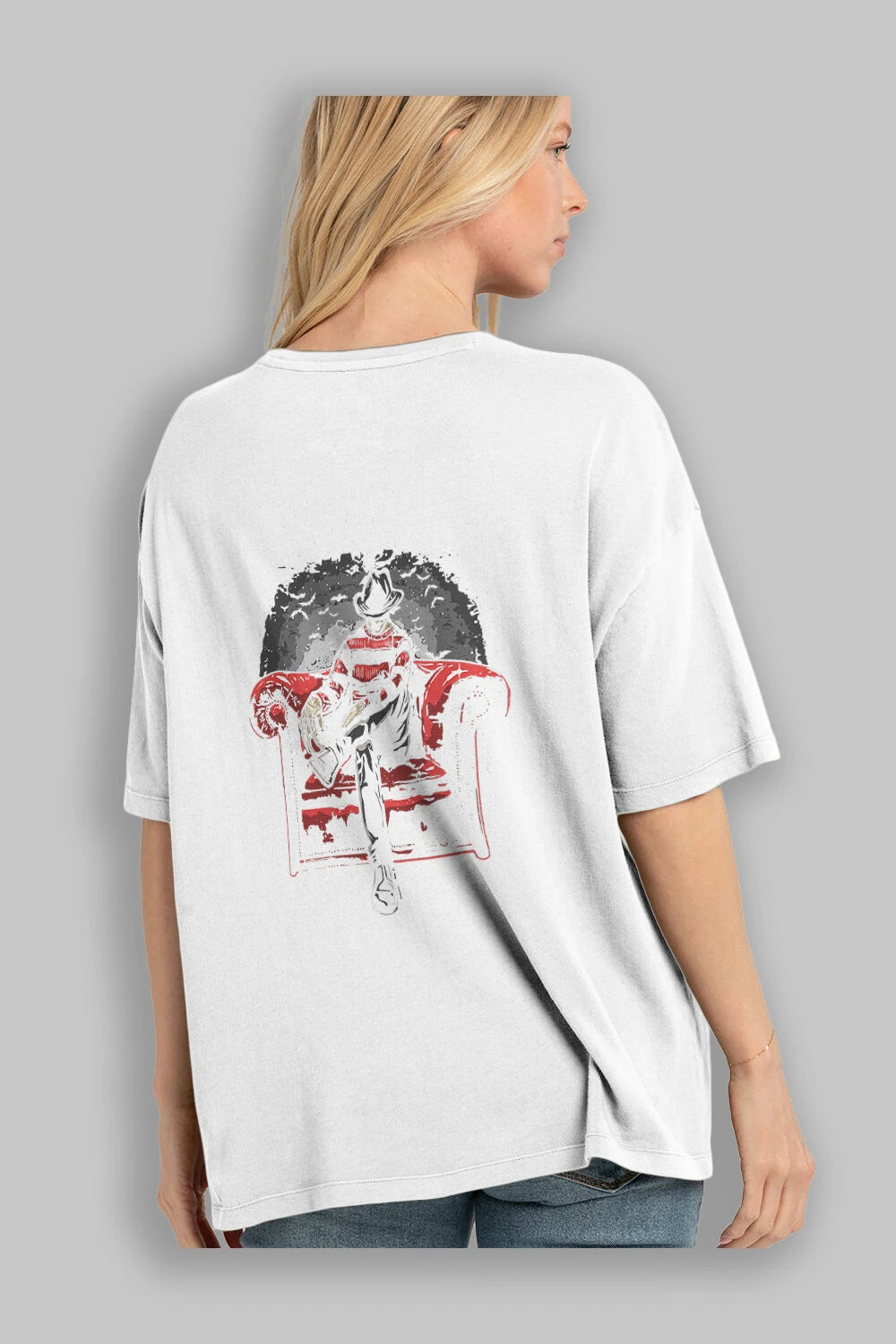 Hem erkekler hem de kadınlar için uygun, taze, modern bir baskıya sahip baskılı oversize t-shirt.