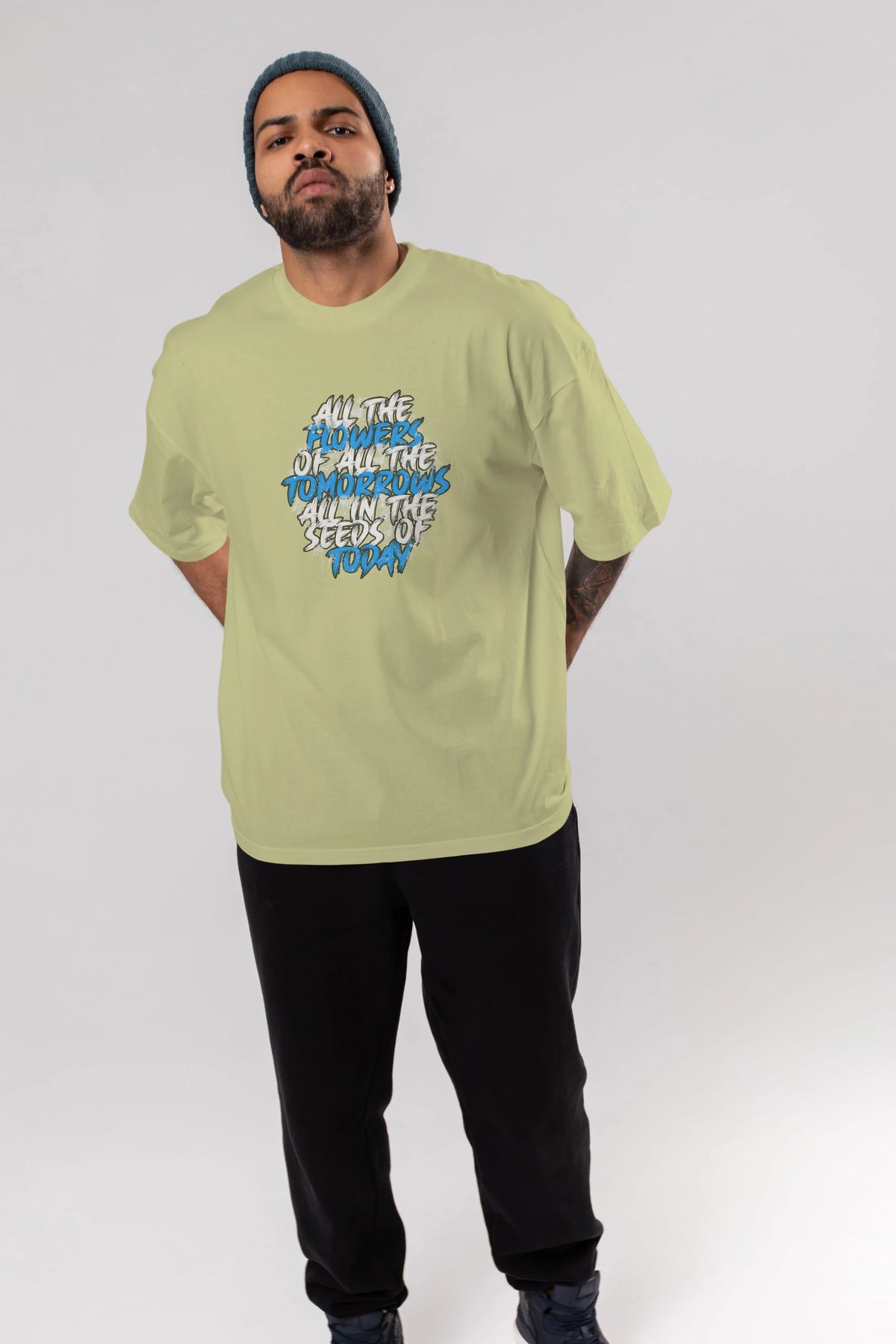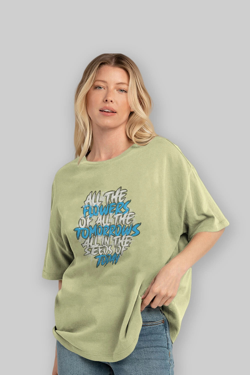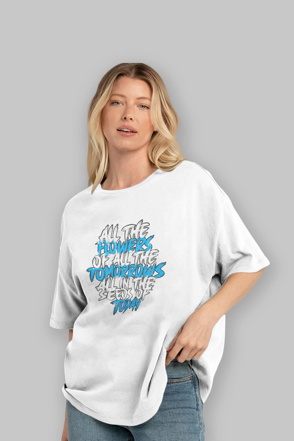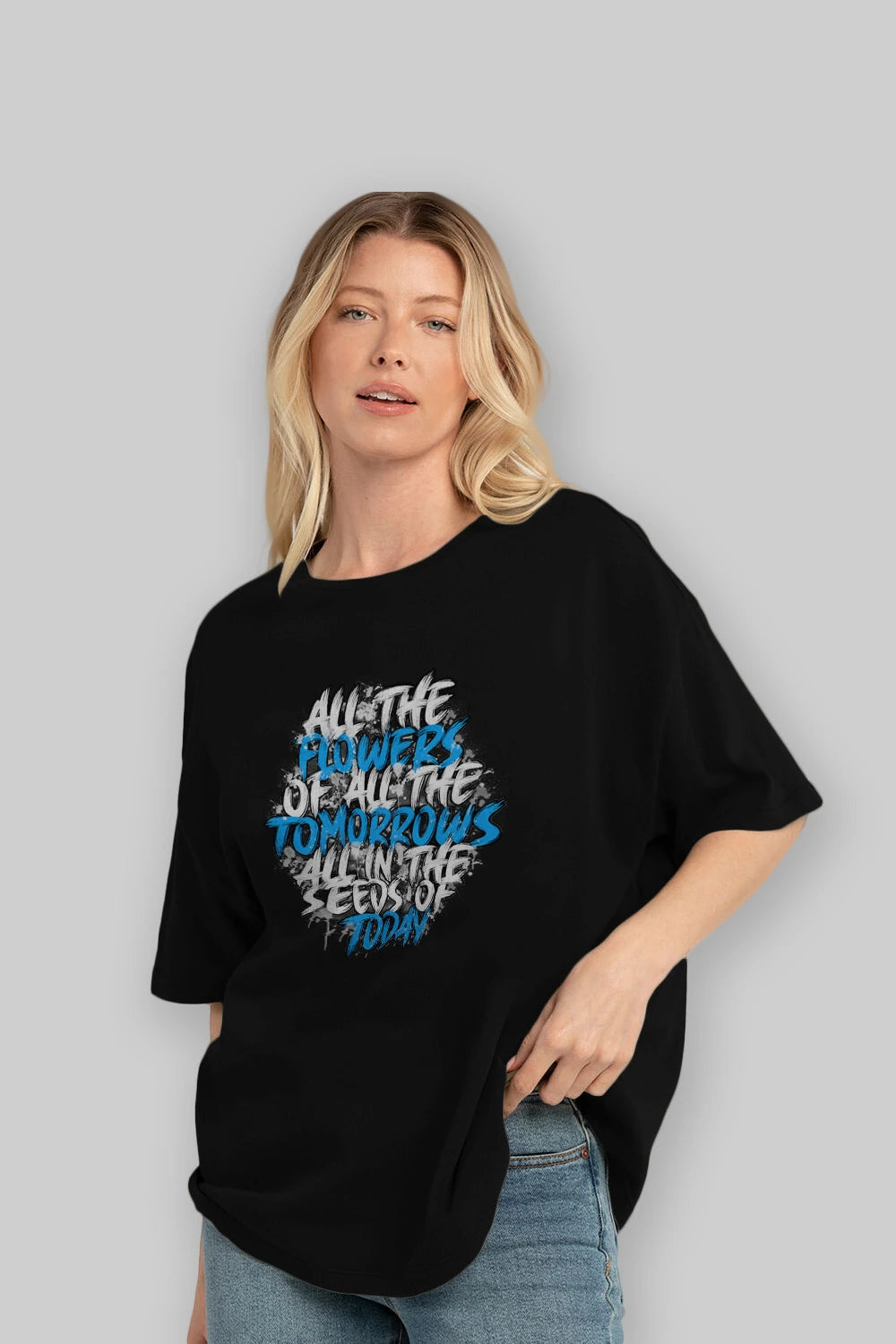 Hem erkekler hem de kadınlar için uygun, taze, modern bir baskıya sahip baskılı oversize t-shirt.