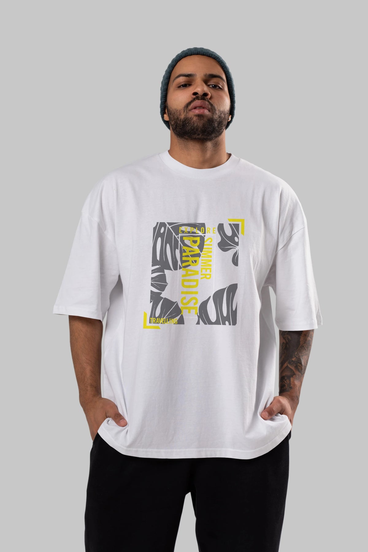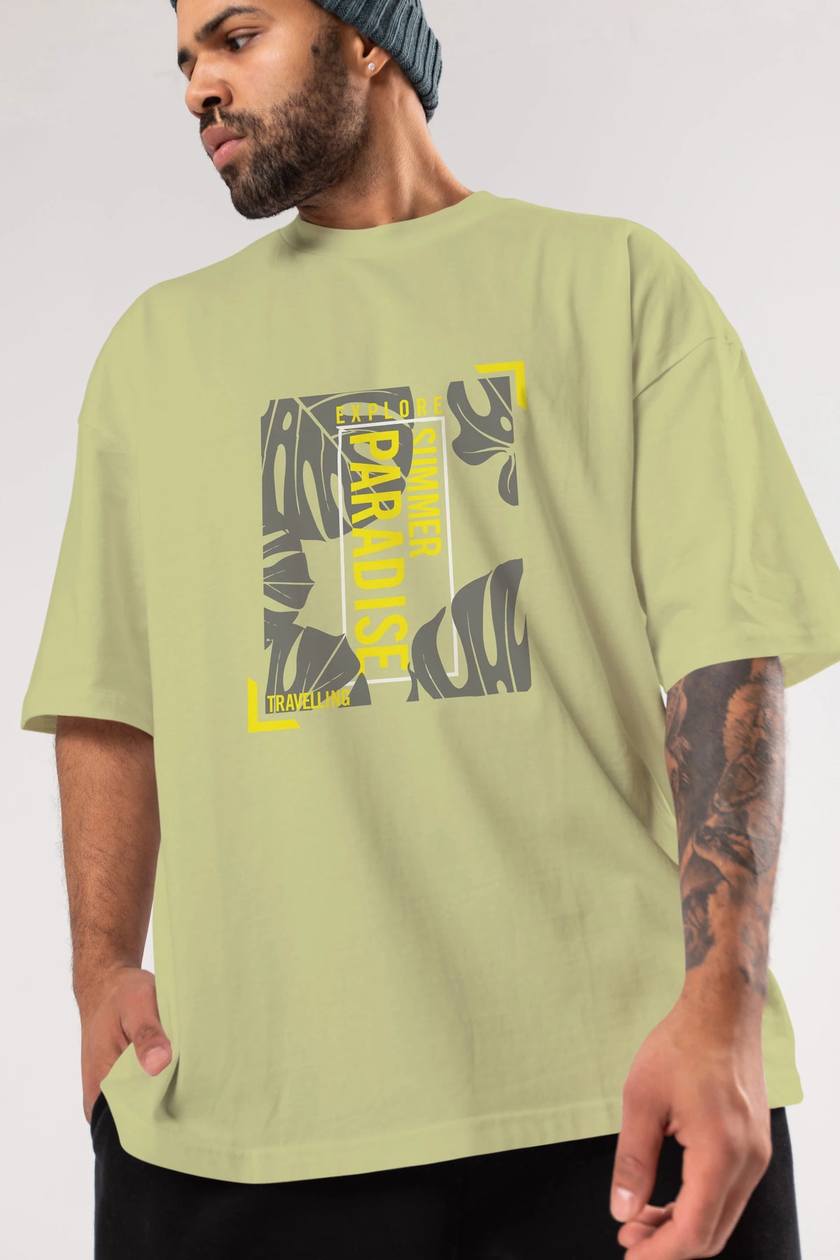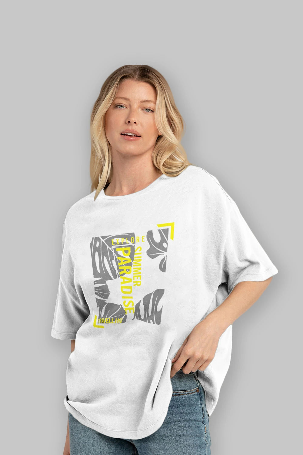 Hem erkekler hem de kadınlar için uygun, taze, modern bir baskıya sahip baskılı oversize t-shirt.