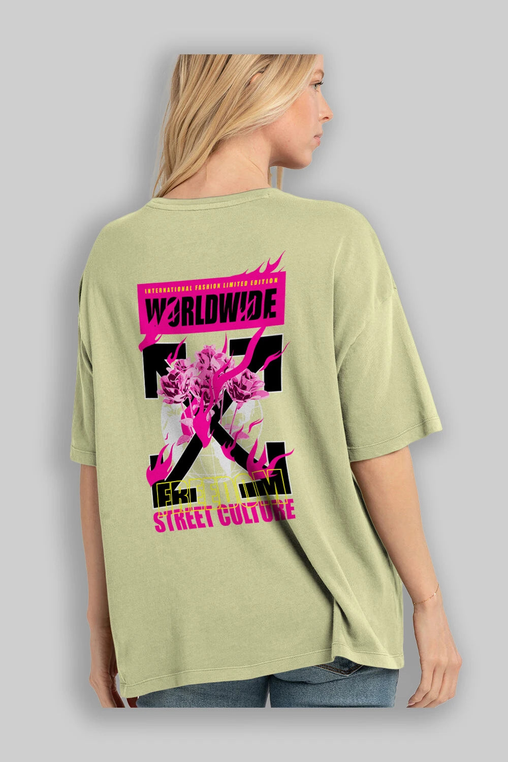 Hem erkekler hem de kadınlar için uygun, taze, modern bir baskıya sahip baskılı oversize t-shirt.